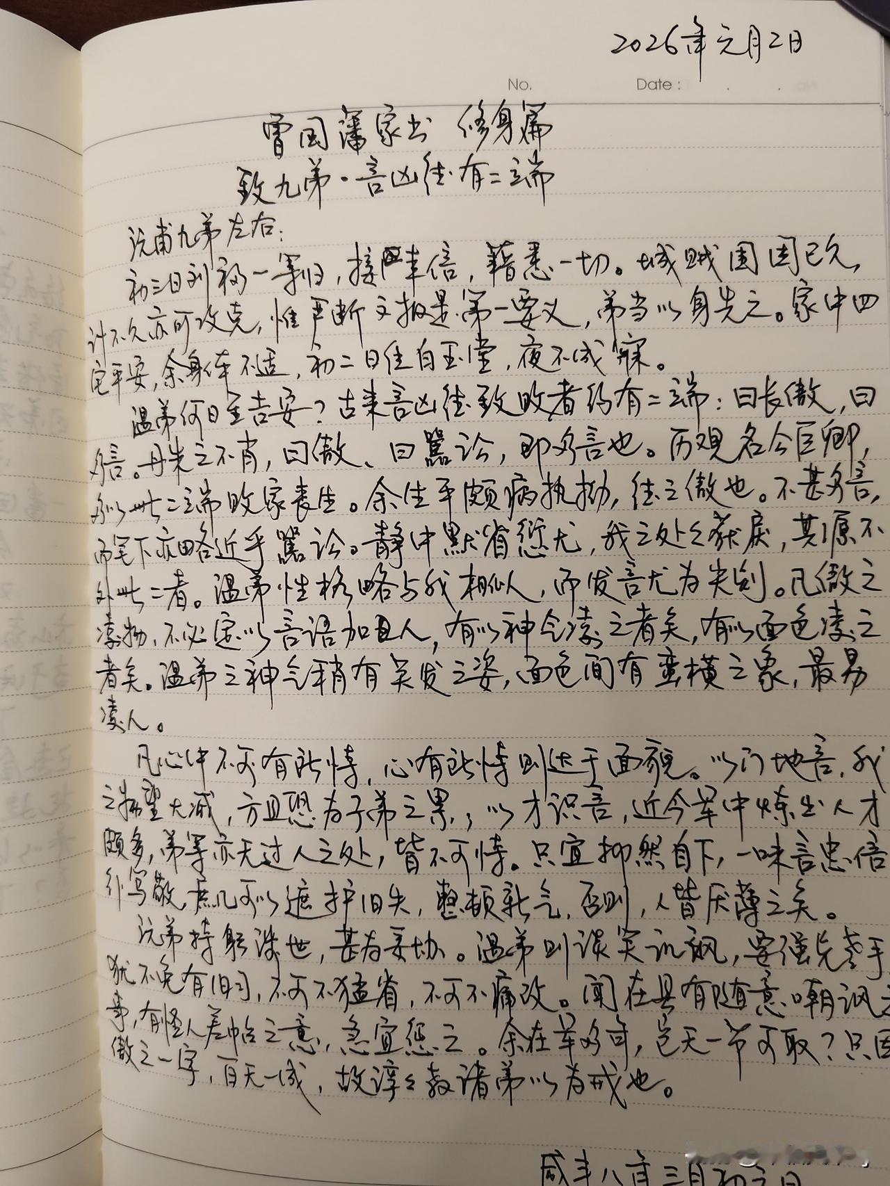 家庭共读并抄书第20天:《曾国藩家书》修身篇 致九弟.言凶德有二端 体会:关于“长傲”:在团队与管理中,傲慢常表现为对人不敬、对事不谦,轻则阻塞言路、错失良策,重则离心离德、决策失衡。戒傲的要义在于“去恃”:不以权、势、才、钱、关系为凭,持续保持“空杯心态”与“低位姿态”,把注意力放在事实与问题本身,而非自我证明。 关于“多言”:信息时代“言多必失”的风险被放大。多言不止于“说得多”,更包括议论人短长、好为人师、逞口才压人;在书面表达(邮件、方案、社媒)中尤须克制评判与讥讽,做到“是非皎然于心而一言不发”。慎言并非不沟通,而是以必要、清晰、留白为度,减少无谓消耗与误读。
