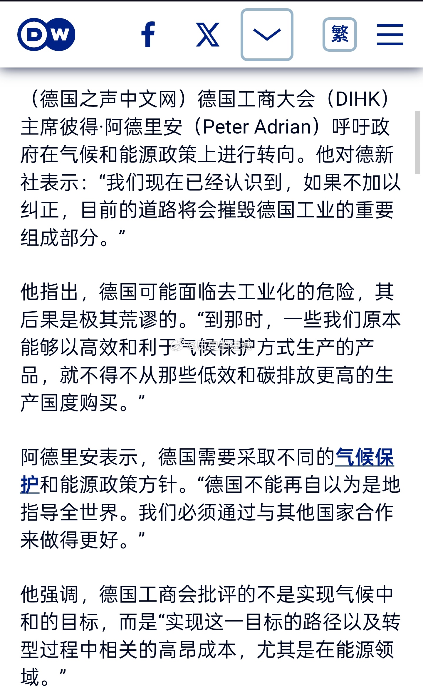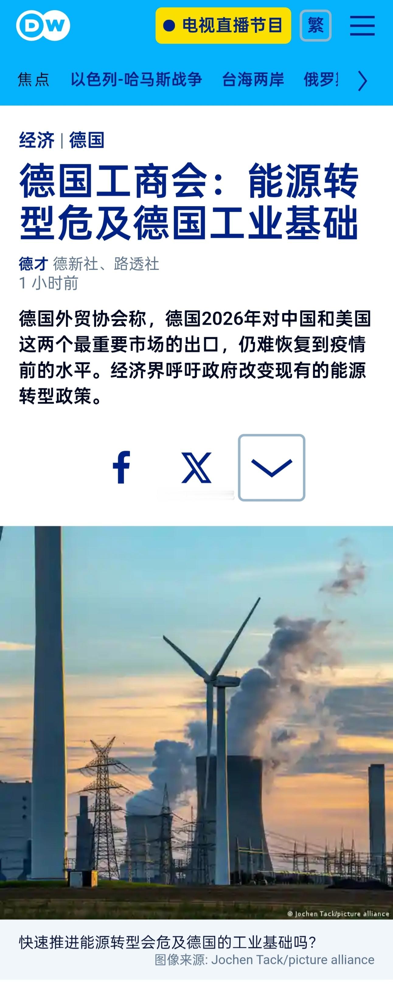 德国外贸协会称,德国2026年对中国和美国这两个最重要市场的出口,仍难恢复到大流行前的水平。经济界呼吁政府改变现有的能源转型政策。德国工商大会主席彼得·阿德里安呼吁政府在气候和能源政策上进行转向。他表示:“我们现在已经认识到,如果不加以纠正,目前的道路将会摧毁德国工业的重要组成部分。”他指出,德国可能面临去工业化的危险,其后果是极其荒谬的。“到那时,一些我们原本能够以高效和利于气候保护方式生产的产品,就不得不从那些低效和碳排放更高的生产国度购买。”阿德里安表示,德国需要采取不同的气候保护和能源政策方针。“德国不能再自以为是地指导全世界。我们必须通过与其他国家合作来做得更好。”