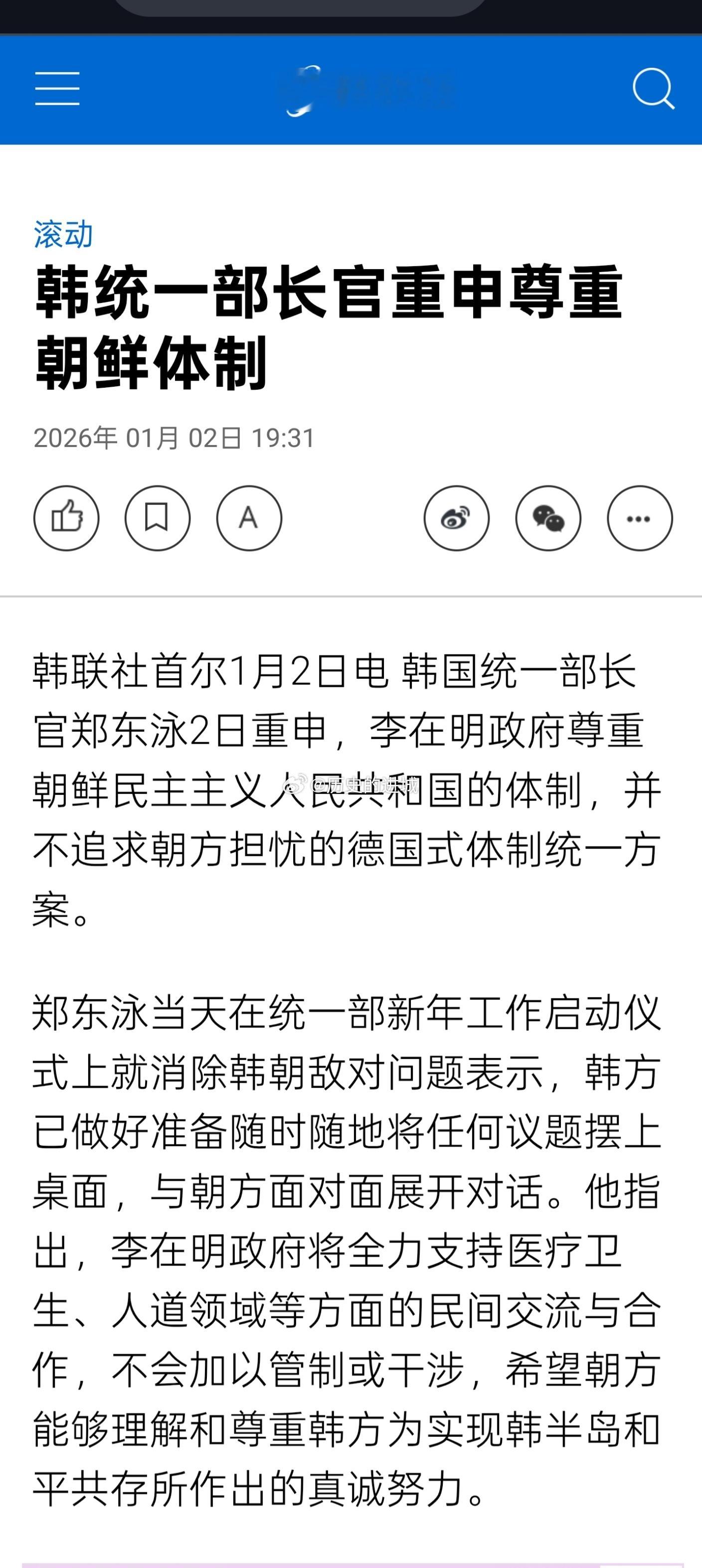 韩国统一部长官郑东泳2日重申,李在明政府尊重朝鲜民主主义人民共和国的体制,并不追求朝方担忧的德国式体制统一方案。郑东泳当天在统一部新年工作启动仪式上就消除韩朝敌对问题表示,韩方已做好准备随时随地将任何议题摆上桌面,与朝方面对面展开对话。