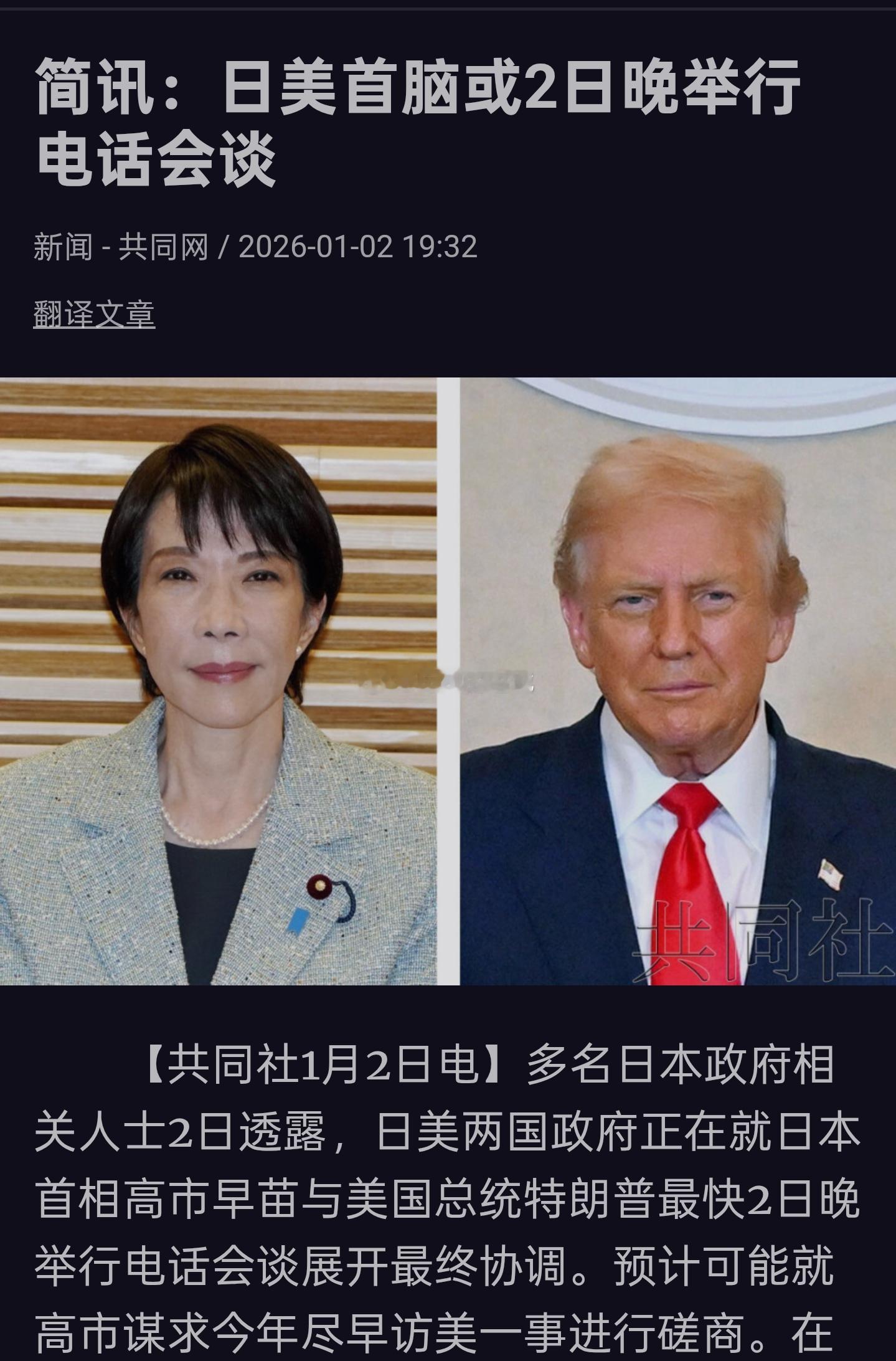据共同社援引多名日本政府相关人士报道称,美日两国政府正在就高市早苗首相与特朗普总统最快于2日晚举行电话会谈展开最终协调。双方可能会讨论高市计划于今年年初访问美国的事宜。