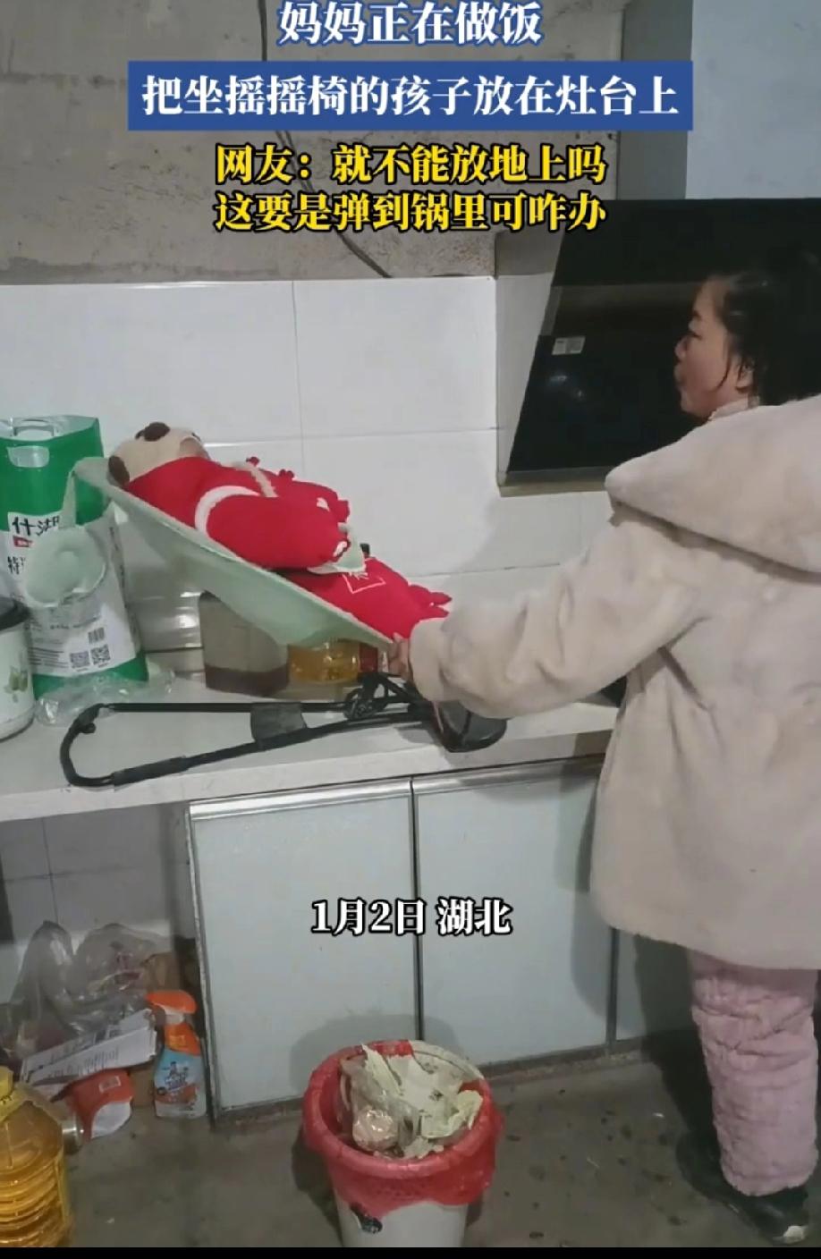 湖北,这毛病正在做饭,把坐摇摇椅的孩子放灶台上。看着就来气,都几十岁的人额,一点安全意识都没有,这种人带娃,看着就可怕。 这摇摇椅前后摇着,万一力道大一点,直接弹锅里,那真是名副其实的“娃娃菜” 了。孩子闹腾起来,折腾绳子,灶台这么高,掉下来,多危险啊。即使绑紧了,炒菜时,油锅里的油崩到孩子上,怎么办? 即使家里没人带娃,也不能放灶台上啊。放地上,不行吗?远离点灶台,安全点不好吗? 不过黑红也是红,为了流量,真是不择手段。毕竟,正常人没人会这么做。
