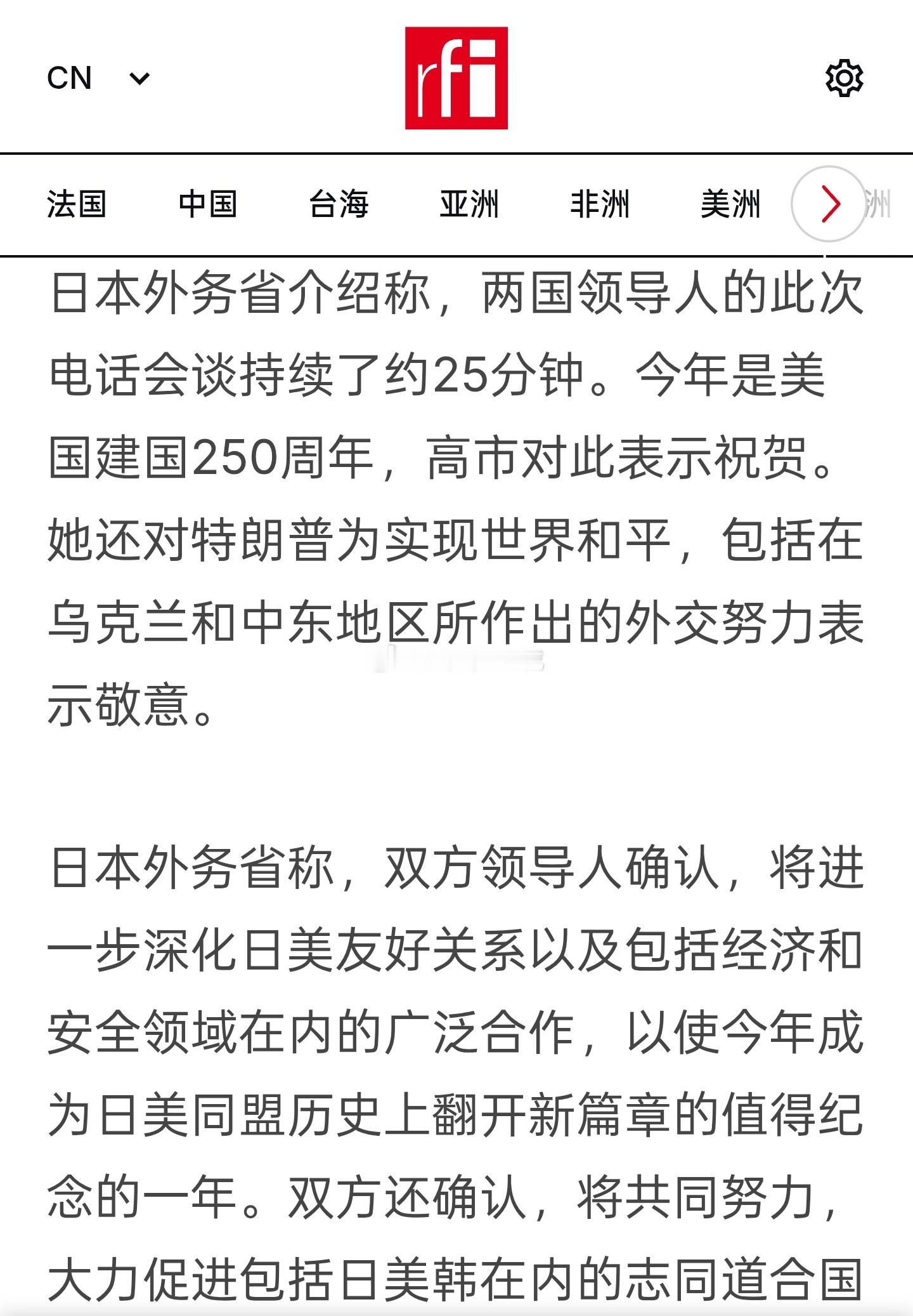 日本首相高市早苗于当地时间周五晚与美国总统特朗普通电话,双方同意推进高市就任以来首次访美及举行峰会的安排。日本外务省介绍称,此次电话会谈持续了约25分钟。今年是美国建国250周年,高市对此表示祝贺。她还对特朗普为实现世界和平,包括在乌克兰和中东地区所作出的外交努力表示敬意。