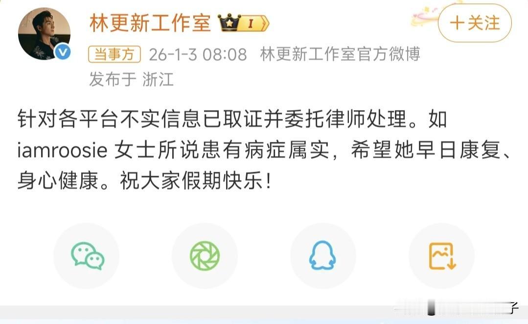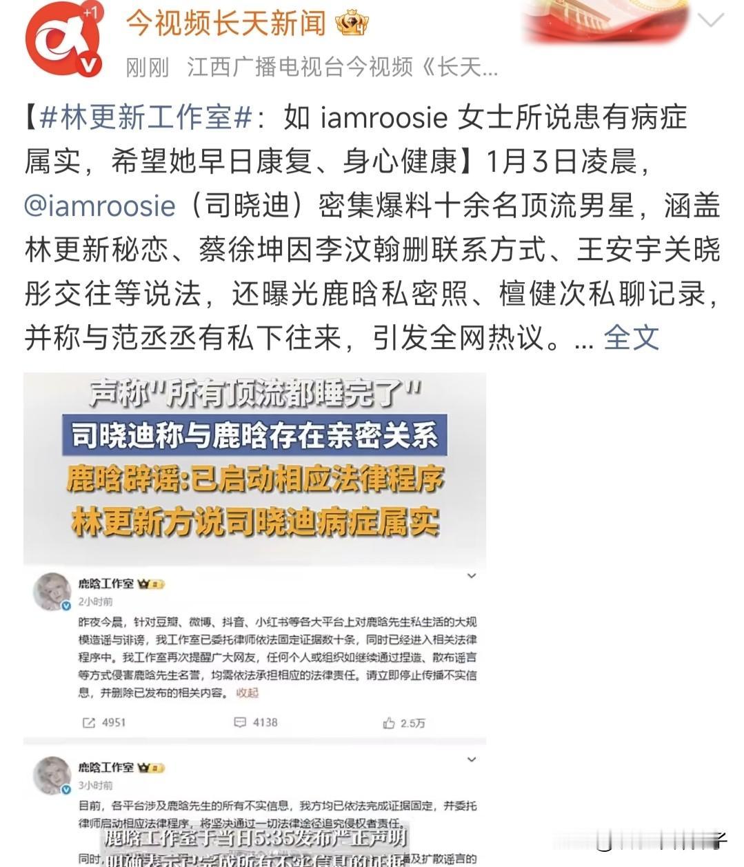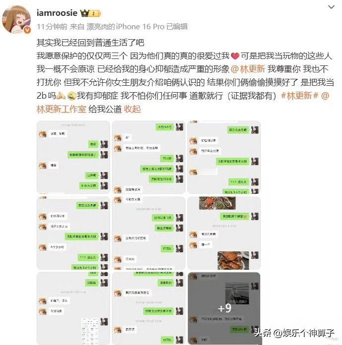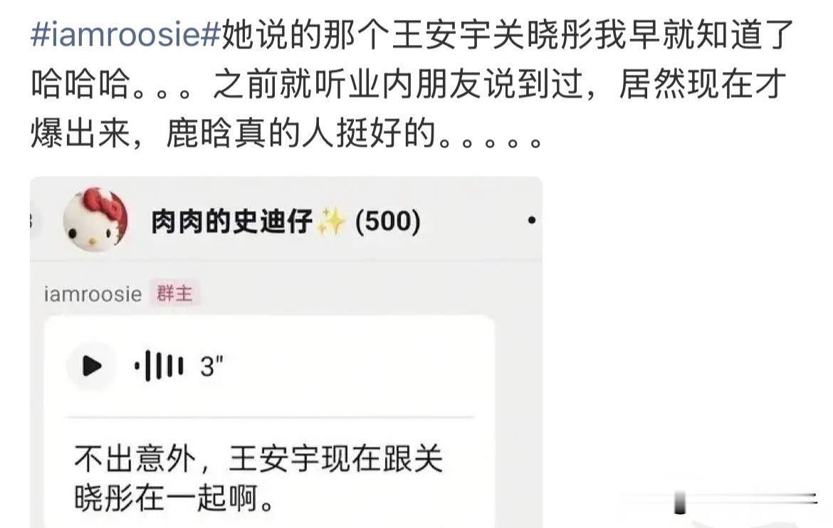 博主iamroosie曝出大瓜,爆料十余名顶流男星! 不得不说,这位iamroosie(有网友说她就是司晓迪)真的挺厉害,粉丝群爆料关晓彤王安宇的恋情,随后,两位艺人的工作室发文辟谣。 不仅如此,iamroosie还深夜发文,直接艾特林更新,要求道歉,并晒出一组疑似两人的聊天记录,还放话:证据我都有! 对此,林更新工作室发文辟谣,顺便还关心一下iamroosie女士的病情…… 咱就说,看iamroosie的爆料和文案,没有逻辑性,甚至有点混乱,没有实锤,就这样信口开河。 关键一下子爆料十余名男星,难道不怕艺人的律师函? 还是那句话,网上爆料未必可信,希望大家理性吃瓜。