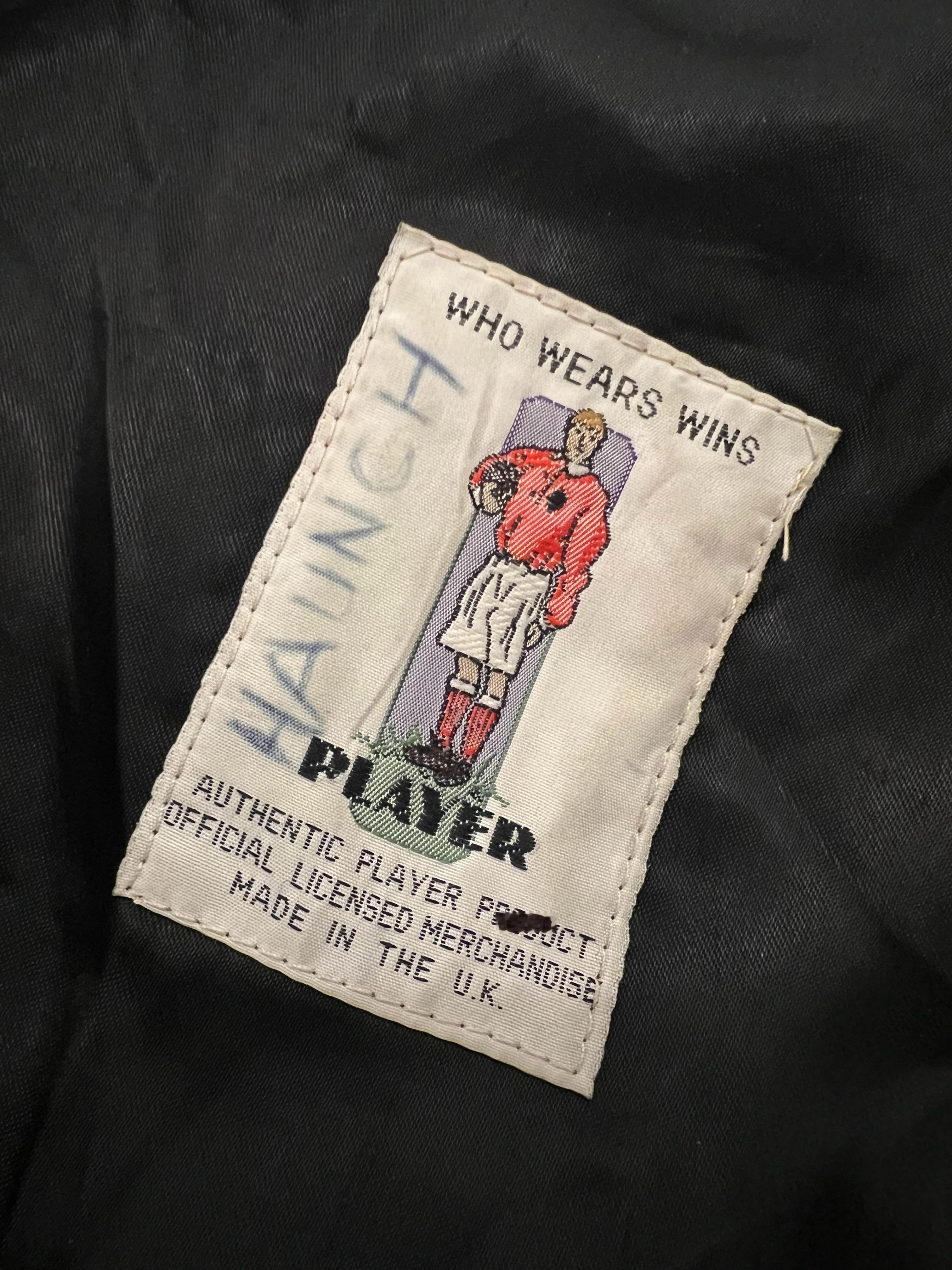 这应该是我最特殊的一件曼联衣服曼联的球衣我有一百多件,各个赞助商的休闲和训练装备也有不少,但这是我第一次买到曼联的皮夹克。夹克的款式比较简单,胸前和背后的刺绣队徽还算精致,而且老款队徽上带有Football Club字样,我喜欢。这件来自90年代的皮夹克既不是俱乐部自己生产的,也不属于当时的装备赞助商茵宝。衣服内侧有个写着Player的标,但我在google上也查不到什么靠谱的品牌介绍,盲猜是俱乐部当时和Player这个品牌短期合作推出的服装。truered