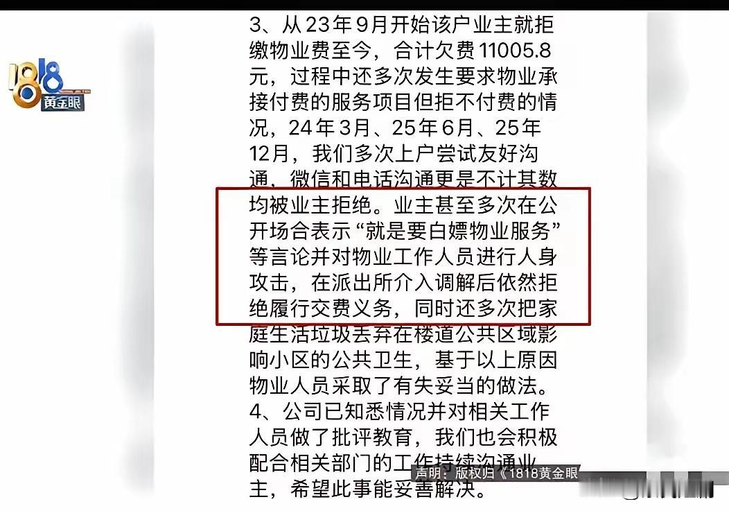 标题:物业与业主的矛盾:责任与权益的博弈 近年来,随着城市化进程加速,物业管理成为小区居民生活中不可或缺的一环。然而,物业与业主间的关系却愈发复杂,矛盾频发。近日,浙江杭州发生的一起事件再度引发公众关注:一名男子将垃圾扔到楼下,随后被物业人员“扔回”门口。男子报警了解原委后,物业方面指责业主长期拒缴物业费,甚至有人公然宣称“就是要白嫖物业服务”,还对物业工作人员进行人身攻击。这一事件折射出物业管理中存在的诸多问题,也引发了人们对业主权益与物业责任的深刻思考。 一、事件回顾:矛盾的爆发与误解的累积 事件起因看似简单:男子将垃圾扔到楼下,或许是出于对物业管理不到位的不满,亦或是对物业服务的不满。而物业方面的回应令人震惊——将垃圾扔回门口,显然是对男子行为的回击。这一行为虽显激烈,却也反映出物业与业主间的紧张关系。 男子报警后,警方调查发现,原来物业“扔垃圾”的行为,是因为业主长期拒缴物业费,还在公开场合发表“白嫖物业服务”的言论,并对物业工作人员进行人身攻击。这种情况表明,物业与业主间的矛盾已不只是单纯的管理问题,而是深层次的权益之争。 二、物业与业主的权益与责任 物业的职责与义务 物业管理的核心在于维护小区环境、保障居民安全、提供便捷服务。合理收取物业费,是物业持续提供服务的根基。物业应依法依规履行职责,确保小区环境整洁、设施完好、秩序井然。 业主的权益与义务 业主享有使用物业服务的权利,也应按时缴纳物业费。拒缴物业费,可能致使物业无法正常运营,影响公共设施和服务的质量。同时,业主有权对物业管理提出合理建议并进行监督,但应通过合法途径表达诉求,避免人身攻击或破坏公共秩序。 责任的界定 在本事件中,物业“扔垃圾回家门口”的行为,虽是激烈反应,却也反映出管理上的不当。物业应通过合理渠道解决业主的投诉和矛盾,而非采取极端手段。同时,业主拒缴物业费,虽有理由表达不满,但不能以破坏公共环境、攻击物业工作人员等方式来表达。 三、矛盾的根源:沟通与信任的匮乏 物业与业主间的矛盾,很多时候源于沟通不畅、信任缺失。部分业主对物业服务不满,可能是因为物业服务不到位或收费不透明。而物业方面,若管理不善或态度冷漠,也会激化矛盾。 在本事件中,业主公开表示“就是要白嫖物业服务”,反映出对物业收费和服务的不满。而物业方面的极端行为,不仅未能缓解矛盾,反而激化了冲突。这说明,双方都缺乏有效的沟通渠道和解决问题的机制。 四、法律与道德的底线 依法依规,物业和业主都应遵守法律法规。物业应依法收费,提供相应服务;业主应按时缴纳物业费,合理表达诉求。任何破坏公共秩序、进行人身攻击的行为,都是不可取的。 同时,在道德层面,双方应以理性、尊重的态度面对矛盾。物业应以服务为本,积极改进管理;业主应理性表达不满,通过合法途径维护权益。 五、如何解决类似矛盾? 加强沟通:建立业主委员会,定期召开业主大会,倾听业主意见,解决管理中的问题。 完善法律法规:明确物业与业主的权责界限,推动物业管理的规范化、透明化。 提升服务质量:物业应提高服务水平,增强业主满意度,减少矛盾。 依法维权:业主遇到问题,应通过法律途径解决,避免极端行为。 社区共治:倡导邻里互助、理性沟通,共同营造和谐社区环境。 六、结语 杭州男子扔垃圾事件虽是个例,但反映出物业与业主间深层次的矛盾与问题。解决这类矛盾,需要法律的规范、制度的保障,更需要双方的理解与尊重。只有在平等、理性、互信的基础上,物业管理才能迈向更加规范、和谐的未来。社会各界也应共同努力,推动形成良好的物业与业主关系,让城市生活更加美好。