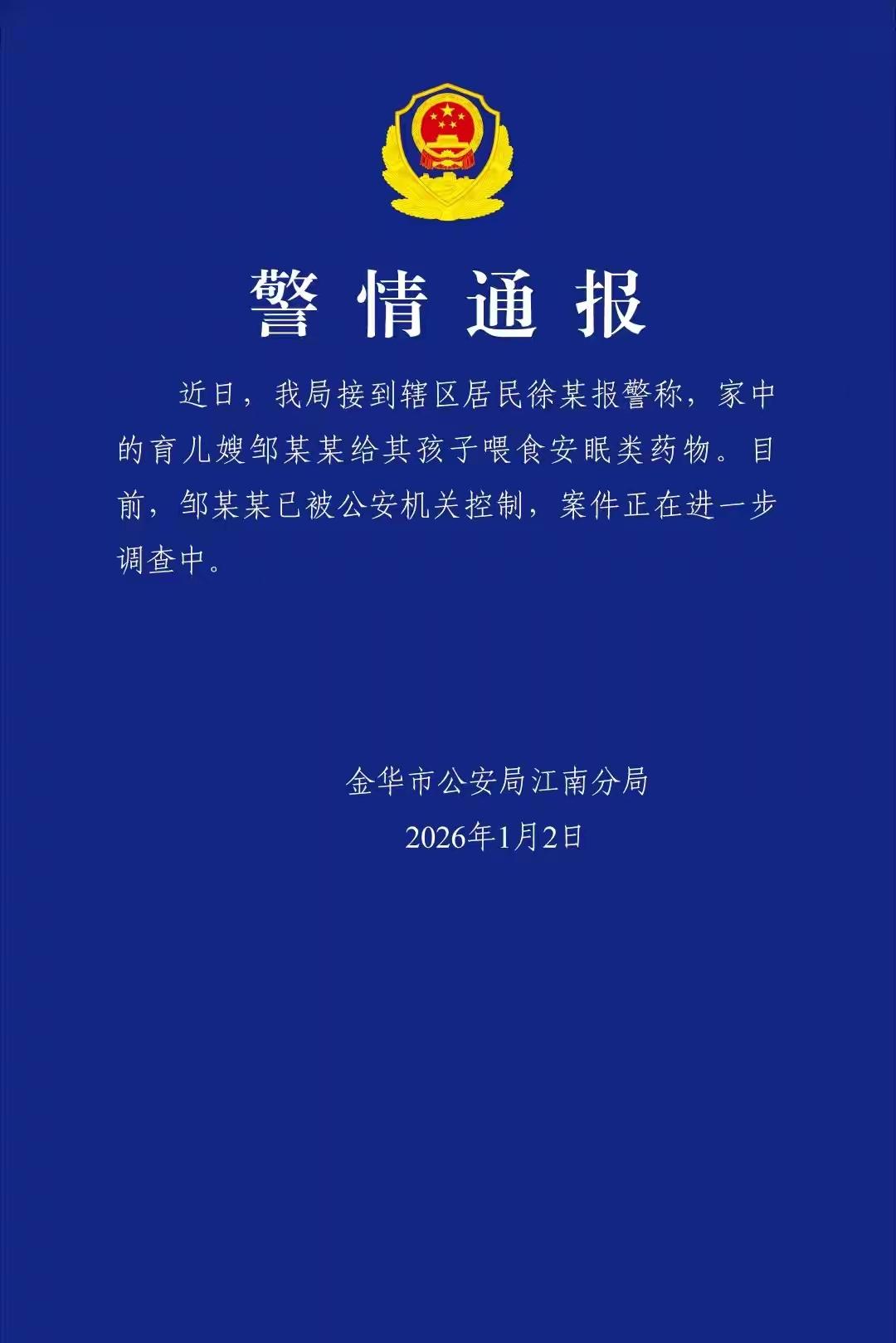 新年看到这样的消息,真让人愤怒!幼儿被月嫂喂食安眠药,昏睡不醒。据媒体报道,浙江金华一宝妈徐女士通过永康可依家政公司,以7600元/26天的价格聘请邹某某为育儿嫂,邹某某已在徐家工作一个多月。近日,宝宝出现持续昏睡的异常症状,徐女士送医检查后,发现宝宝体内竟含有安眠类药物。徐女士怀疑是邹某某故意喂食,遂向金华市公安局江南分局报警。1月2日,警方通报邹某某已被控制,目前案件正深入调查中。 金华月嫂给9个月婴儿喂管控安眠药,是触碰法律与道德底线的恶行。唑吡坦作为第二类精神药品,对婴幼儿神经系统、肝肾功能危害极大,绝非“安抚工具”。这起事件暴露了家政行业资质审核宽松、服务监管缺位的沉疴。高薪月嫂背后,是机构对从业者背景、技能的漠视。守护婴幼儿安全,既需严惩涉事者,更要健全行业黑名单与全程追溯机制,让违规者无处遁形,让家庭托付有章可循。社会热点 浙江金华一月嫂疑似给婴儿投喂安眠药 警方通报金华婴儿被投喂安眠药事件