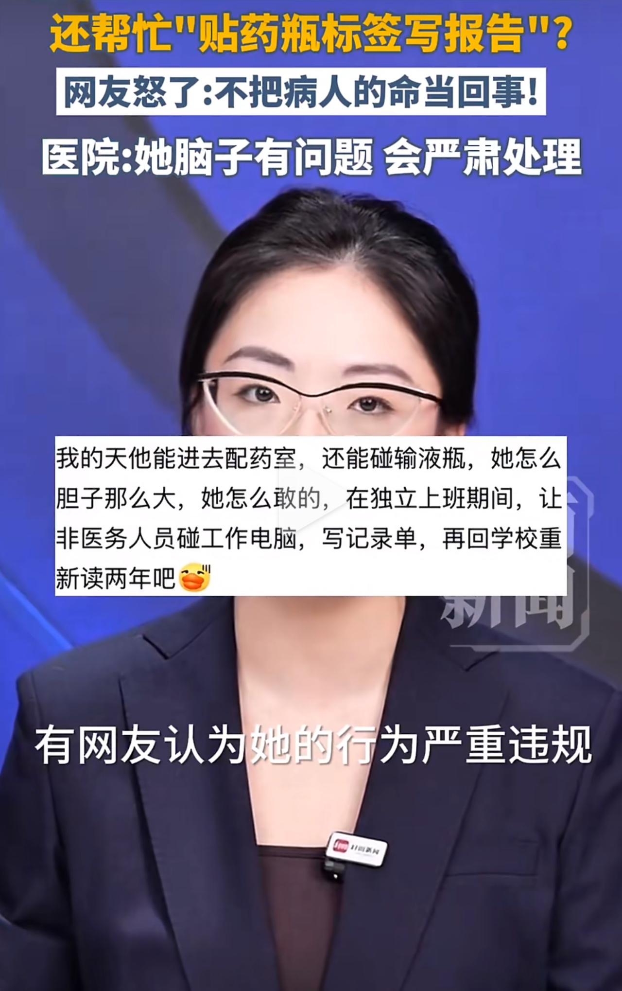 医疗操作能随便让人搭手?青岛那名护士的事儿,真的让我越想越后怕! 她直接把没任何医疗资质的男友领进配药室,配药、贴标签、写护理记录全让他上手!视频里那男的穿便服、有纹身,竟把烟随手搁在无菌治疗车上! 从视频里他穿短袖到裹羽绒服能看出来,这种违规操作至少持续了好几个月。我真的不敢想,这几个月里,那些输进患者身体里的药,到底有没有被好好核对过? “三查七对”是护士入行第一课,老护士都得绷紧神经,外行瞎操作,剂量错一点、标签贴混了,都能出人命!这护士倒好,拿患者安危当秀恩爱资本,哪是缺心眼,根本就是职业操守全丢了! 更气人的是医院一开始的回应,一句“她脑子有问题”就想把责任推干净?要是门禁管得严、监控盯得紧,能让外人在治疗区晃悠好几个月?这管理漏洞简直大得离谱! 现在涉事护士被停职,卫健部门也介入了。但我觉得,光处理一个护士远远不够,必须把医院的管理漏洞彻底堵住,不然今天出个情侣档,明天可能还会出别的离谱事儿。医疗安全是人命关天的底线,真的容不得半点戏耍和侥幸!护士过失操作 离谱医疗事件 护士 护士三查七对是否严格执行?