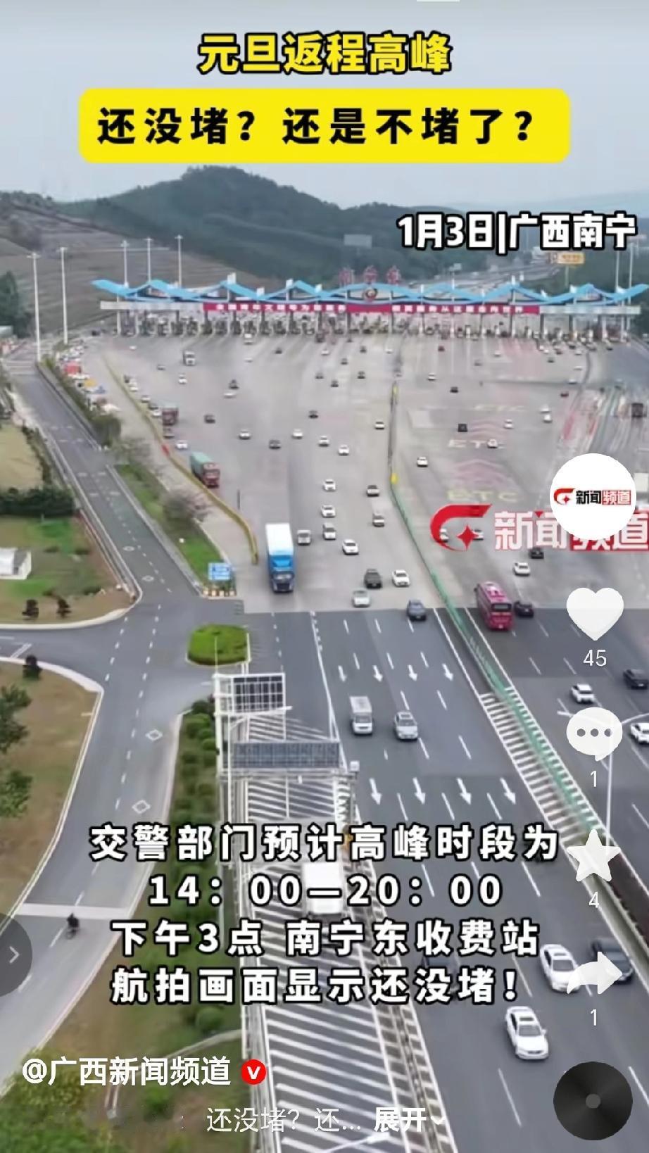 2026年元旦假期即将结束,广西南宁也迎来了返程高峰交警部门预计返程高峰时段14:00-20:00。交警建议可选择张六公路绕行。(来源于@广西新闻频道 )