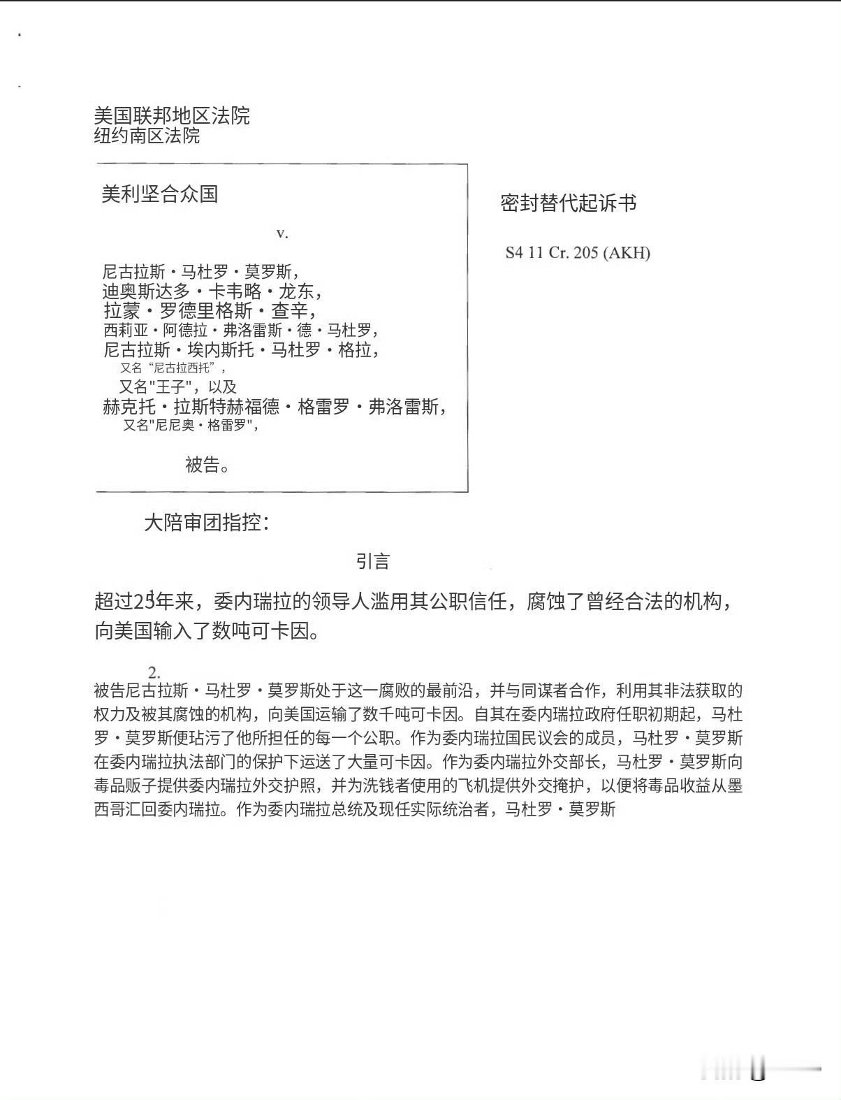 美国司法部发布马杜罗的起诉书。