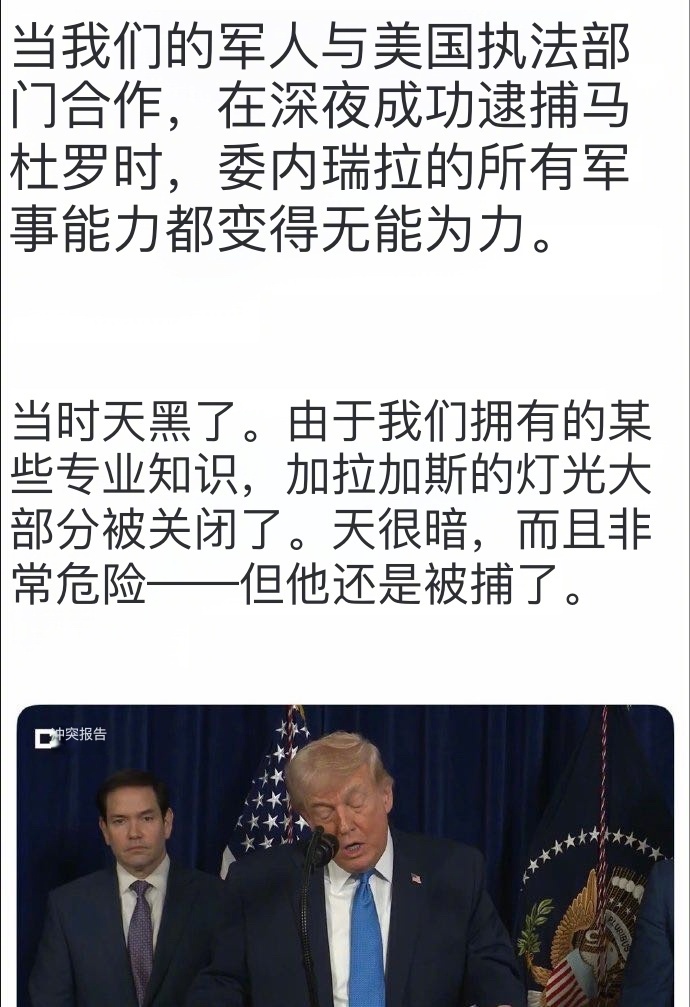 川普发布了马杜罗的最新照片:在美国军舰上,蒙着双眼,带着手铐,右手拿着一瓶矿泉水。特朗普指挥的这次军事行动震惊全世界各国,但同时也是一套组合拳,委总统刚被抓到,纽约法院就给他出“传票”了,川普宣称这是一次“联合执法”。美媒称中情局在他身边安插了内线,委内瑞拉军方也有部分力量,在协助美军的行动。路透社:一名潜伏在马杜罗核心圈层内部的中情局线人,协助美方部队持续追踪其行踪,直到将他抓获。知情人士表示,委内瑞拉军方的一些力量在逮捕过程中提供了配合。一名接近反对派的人士将马杜罗被带走形容为一次“内部行动”。川普还在记者会上宣布:美国将接管委内瑞拉的管理,直到我们能够实现“安全、正确、合理地过渡”。我们不希望出现那种情况——让另外某个人上台,又陷入同样情况……所以,在可以实现安全、恰当、而且审慎的过渡前——美国会继续治理这个国家。美国石油公司,将投资修建委内瑞拉基础设施,让石油为国家赚钱、让委内瑞拉人富起来。美国大型石油公司将前往委内瑞拉特朗普称将占领管理委内瑞拉特朗普称美将管理委直至安全过渡