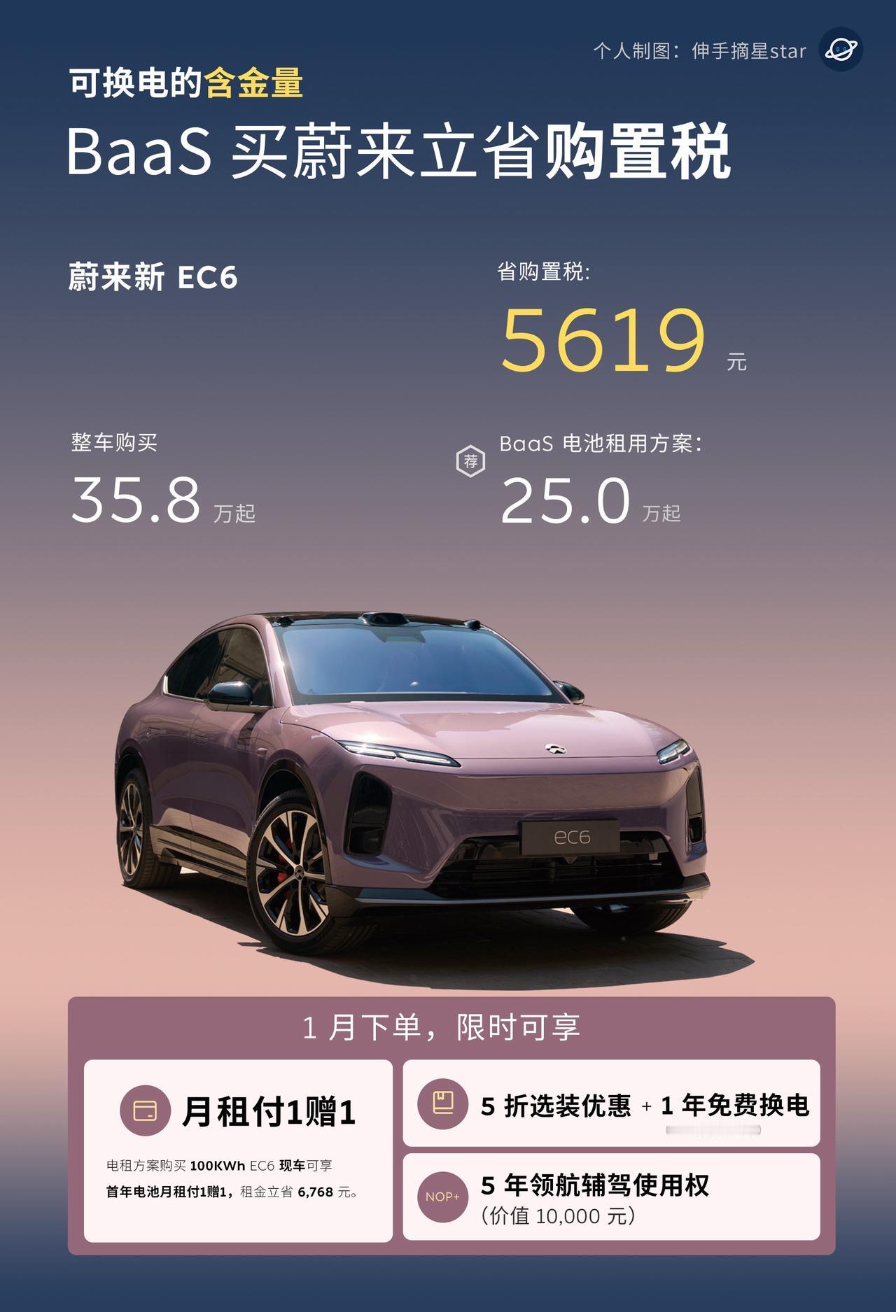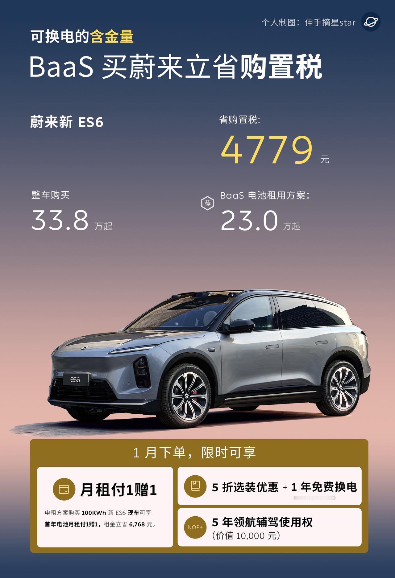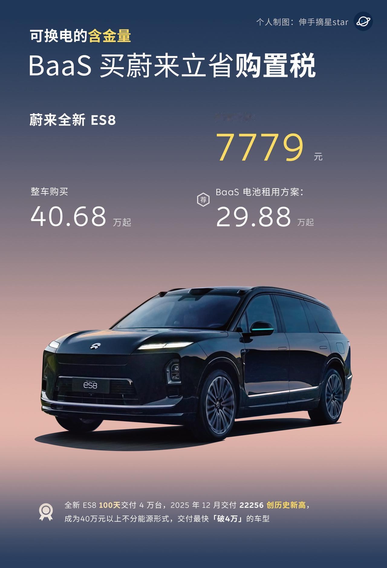 都2026年了,蔚来能换电的含金量还在增加! 今年开始新能源汽车购置税开始减半政策, 能换电,能车电分离, 电池不计入车价,买蔚来全系(含乐道、萤火虫) 都能省购置税。 车价越贵,优势越明显, BaaS 租电购买的含金量越高。 大爆款全新ES8 可以立省7779元起。 期待,这个租电优势慢慢发挥该有的能力。 买车攻略 买新车 买车必看 蔚来