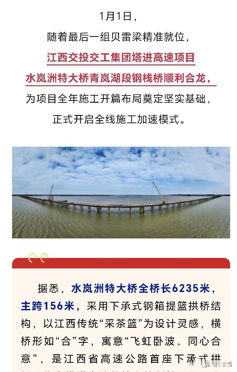 特大好消息,南昌塔进高速公路迎来了令人瞩目的新进展!水岚洲特大桥青岚湖段钢栈桥宛如一条巨龙,顺利合龙。 近日,那全长3114米的钢栈桥,以一种势不可挡的姿态顺利合龙建成。它就像一座超级桥梁,为水岚洲特大桥建设提供了物资运输、人员通行和大型设备进场的临时通道。 这也让塔进高速公路建设向前跨越了一大步。