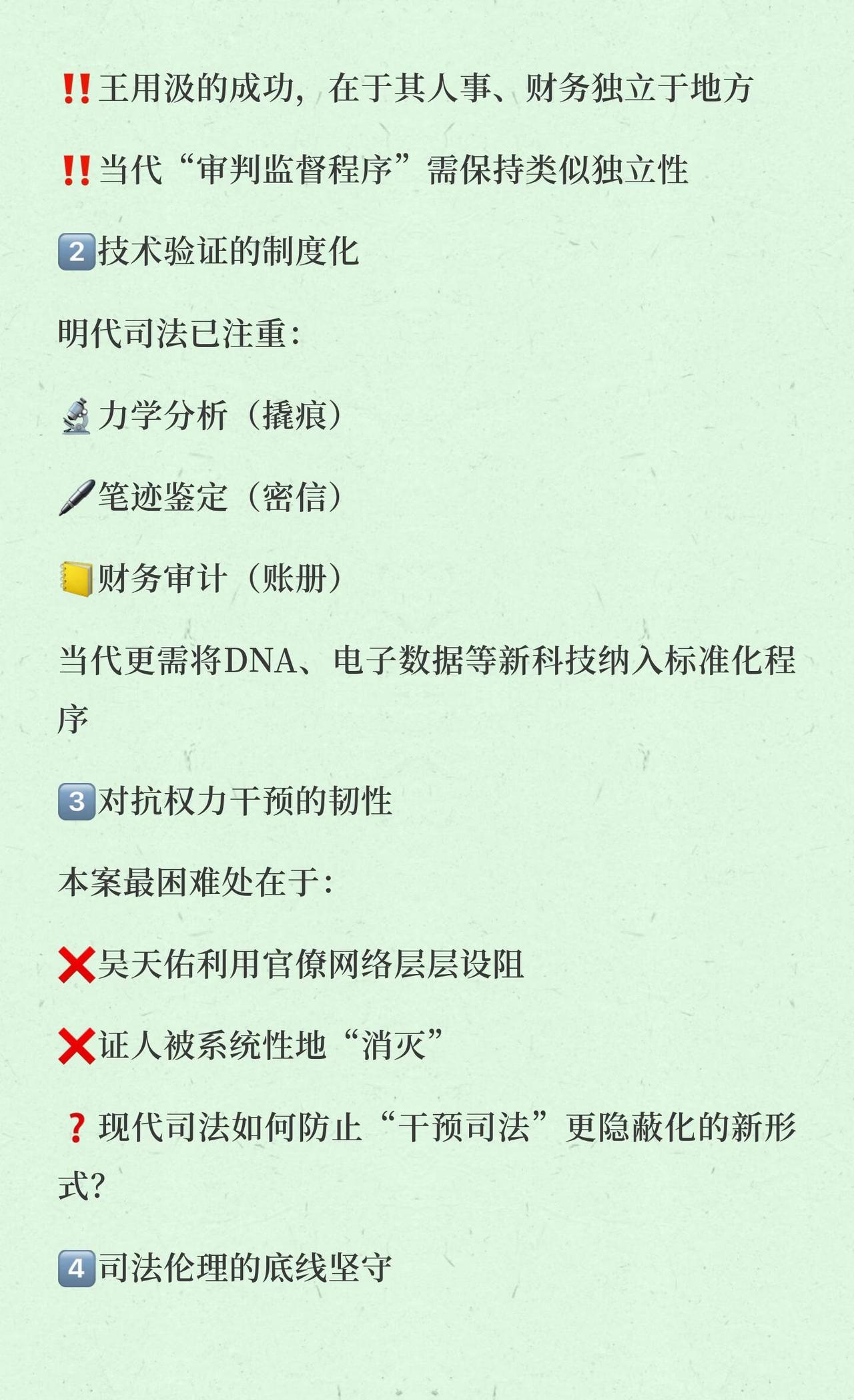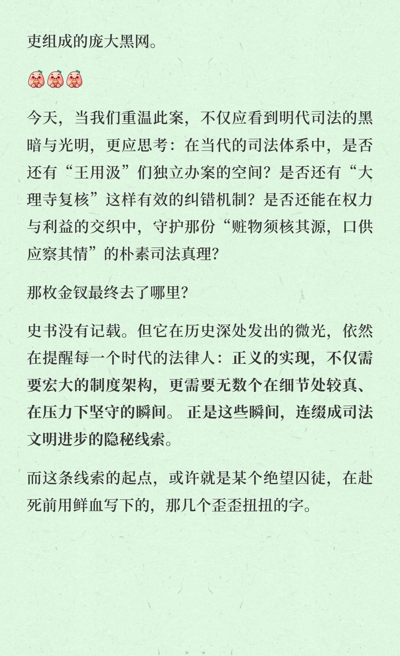 那枚金钗上的历史反光|明代金钗连环案 再完善的制度设计,也可能被人的贪欲腐蚀;但再坚固的利益同盟,也终究抵挡不住专业、细致、不屈不挠的依法审查。在当代的司法体系中,是否还有“王用汲”们独立办案的空间?是否还有“大理寺复核”这样有效的纠错机制?是否还能在权力与利益的交织中,守护那份“赃物须核其源,口供应察其情”的朴素司法真理?正义的实现,不仅需要宏大的制度架构,更需要无数个在细节处较真、在压力下坚守的瞬间。正是这些瞬间,连缀成司法文明进步的隐秘线索。 法律 法律人 执业律师