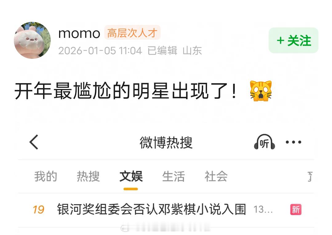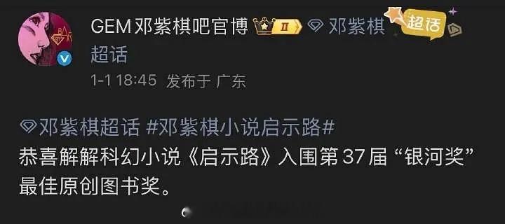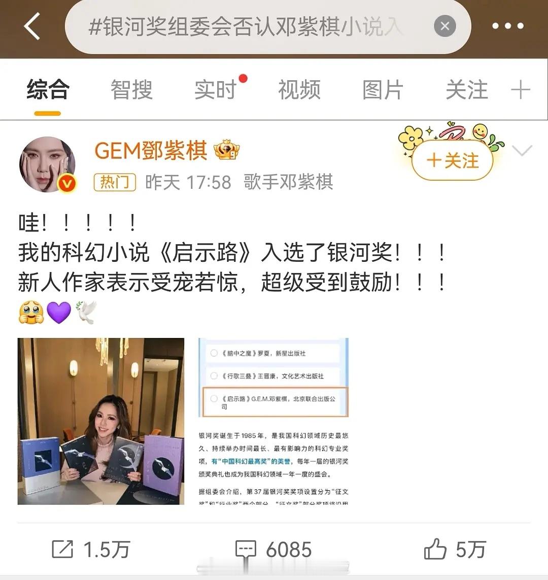 开年最尴尬的明星出现了!银河奖组委会否认邓紫棋小说入围。之前邓紫棋本人发博晒出版书确认入选银河奖,还说新人作家受宠若惊;工作室发博庆祝入围,粉丝官方后援会也跟着开香槟。好好唱歌不好吗?就这个写作水平,怎么认为自己能入围的。。。之前很多粉丝因为她写这个小说都脱粉了银河奖组委会否认邓紫棋小说入围