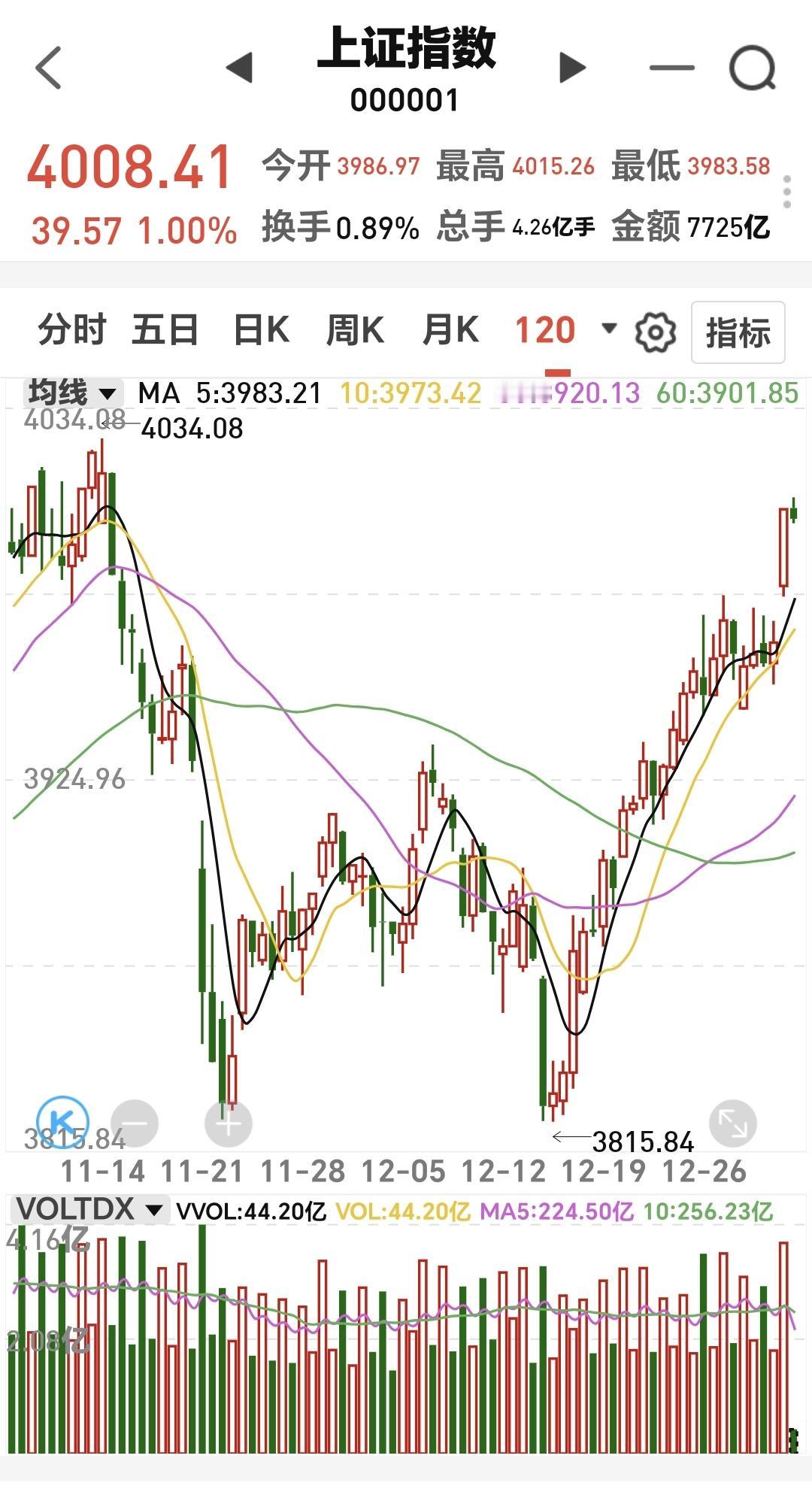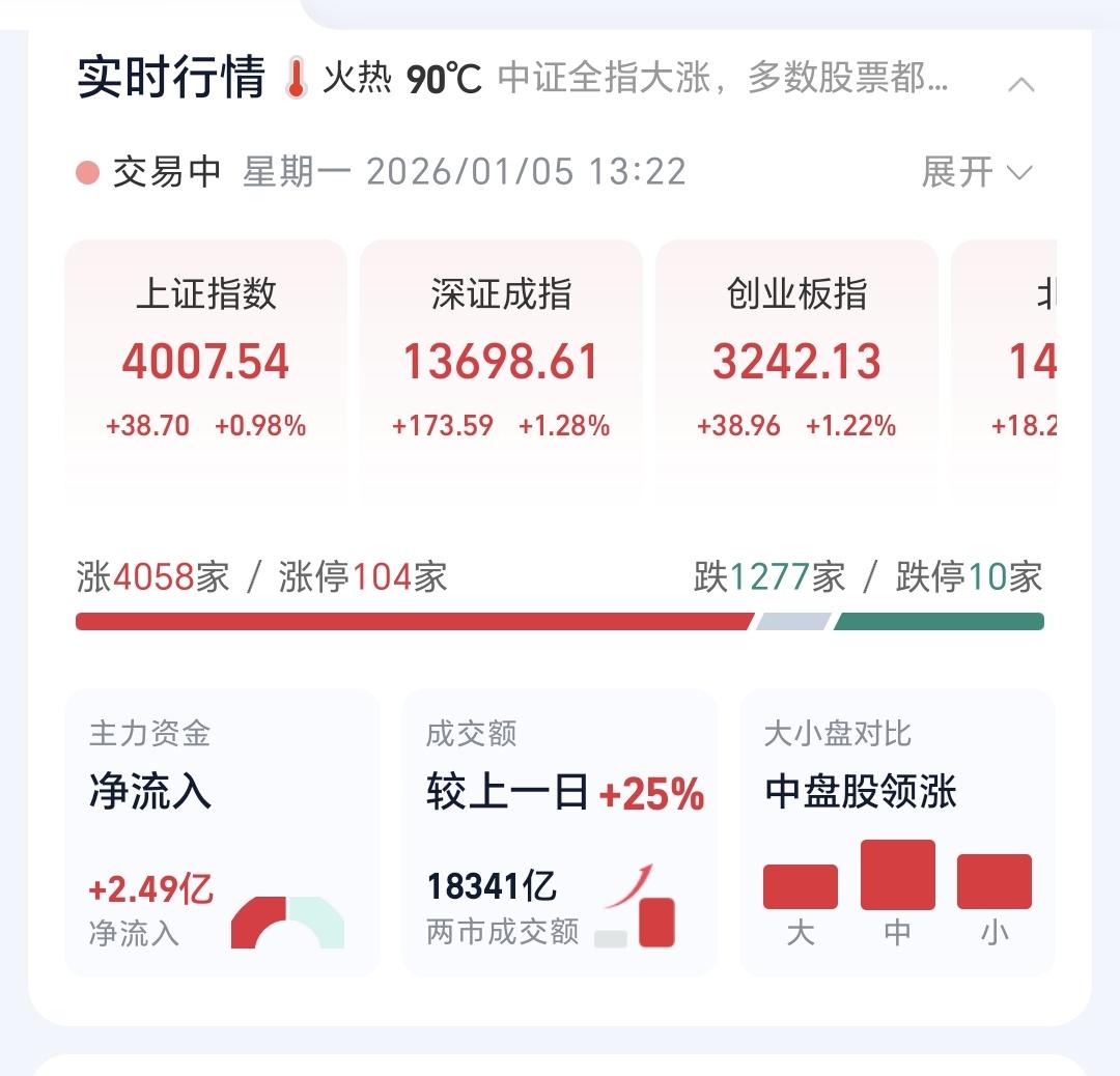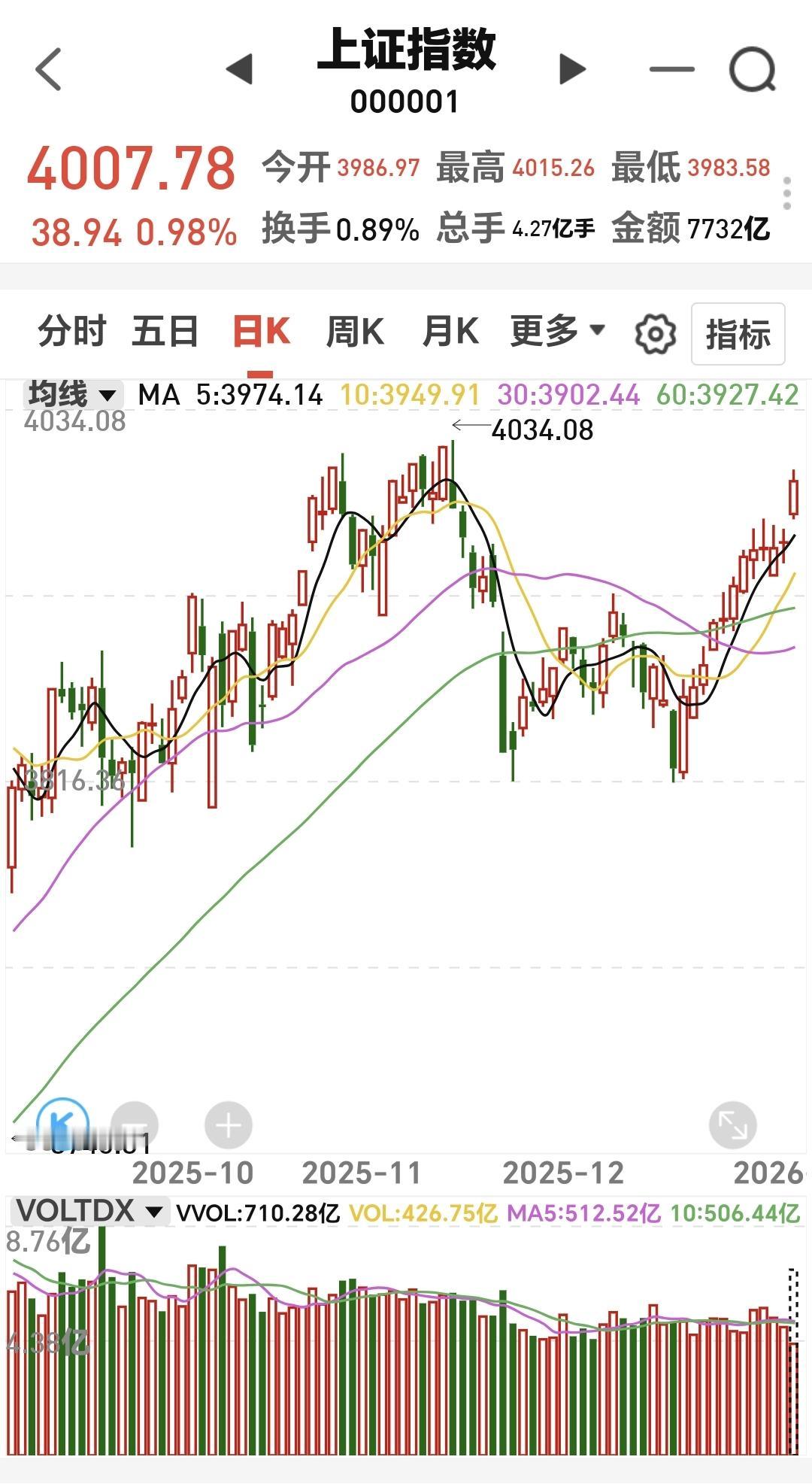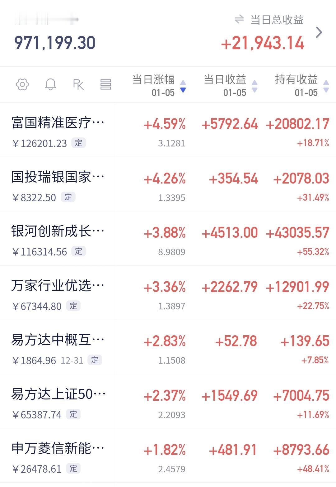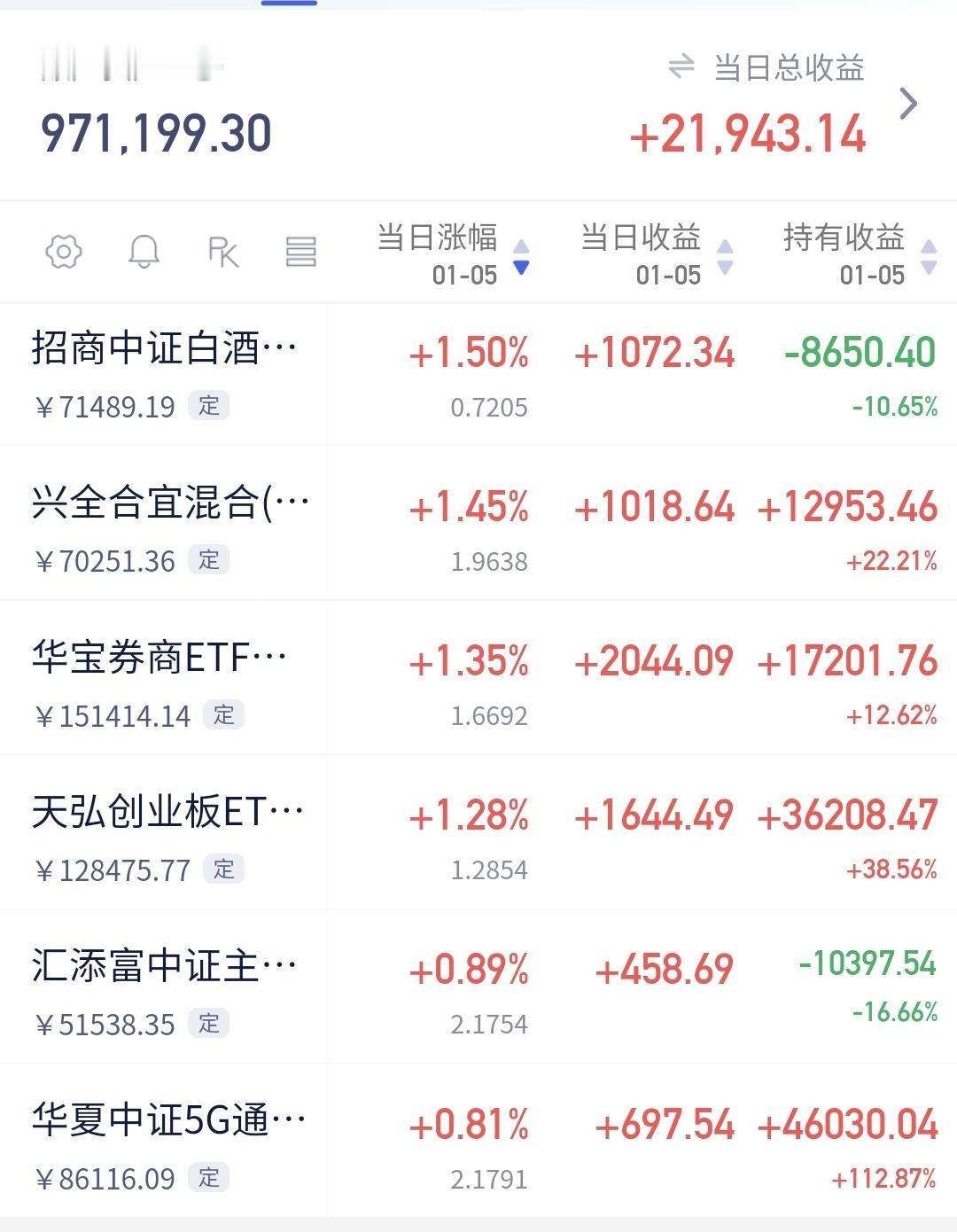 基金:2026年开门红,今天应该怎么办 今天市场高开高走,下午开盘以后小幅度震荡,现在三大指数都是红盘,创业板指上涨了1.30%,盘中点位3244点,上证指数上涨了0.99%,盘中点位4008点。 整个股票市场,上涨4058家,下跌1277家,涨停104家,跌停10家,上涨家数多于下跌家数。 持有的基金中,盘中估值全部都是上涨,上涨幅度最大的三个板块是:医疗板块,军工板块,芯片半导体板块,上涨幅度最小的三个板块是:5G板块,大消费板块,创业板指,估值整体上涨了21943元。 整个基金市场,上涨18043家,下跌931家,上涨幅度超过5%的290家,没有下跌幅度超过5%的基金。 图9是今天基金的上涨排行榜,图10是今天基金的下跌排行榜,图11是ETF上涨幅度排行榜,图12是今天基金的加仓榜,图13是今天基金的减仓榜。 1:今天下午指数小幅度震荡,有些人在担心跳水,但黄色线在蓝色线上方,成交量也是放大,这样的情况下,即使震荡,幅度也不会很大,跳水的可能性很小,收盘的时候只要观察能不能收在3992点上方,只要能够收在这个点位的上方,持有的人就安心持有。 2:现在两市累计成交18341亿,相比于上个交易日放量了25%,这说明下午并没有缩量,成交量还是很好的。 3:我们来看一下下面的截图14,这是主力资金进出板块的情况,主力资金净流入最多的三个板块是:蓝筹策略板块,信息技术板块,电子板块,主力资金净流出最多的三个板块是:新能源板块,通信设备板块,通信板块。 4:我们来看一下今天主力资金净流出比较多的通信板块,看下面的截图15,这是5G通信板块日K线图,从图中可以看出,我画了两条倾斜向上的斜线,这是5G通信板块日线级别上涨通道。今天的主力资金净流出,并没有改变5G通信板块日线级别上涨趋势,持有的人可以继续持有。 6:我们来看一下下面的截图16,这是5G通信板块周K线图,从图中可以看出,我画了两条倾斜向上的斜线,这是5G通信板块周线级别上涨通道,连续两个交易周的震荡,并没有改变周线级别上涨趋势,所以,持有的人可以继续持有,5G通信板块大方向向上并没有被改变。 今天究竟应该怎么办?我会在评论区留言,我每天都会分享我的观点,我的观点只代表我个人的看法,不能作为你操作的依据,据此操作后果自负。