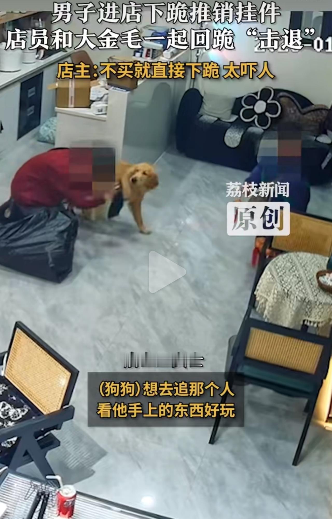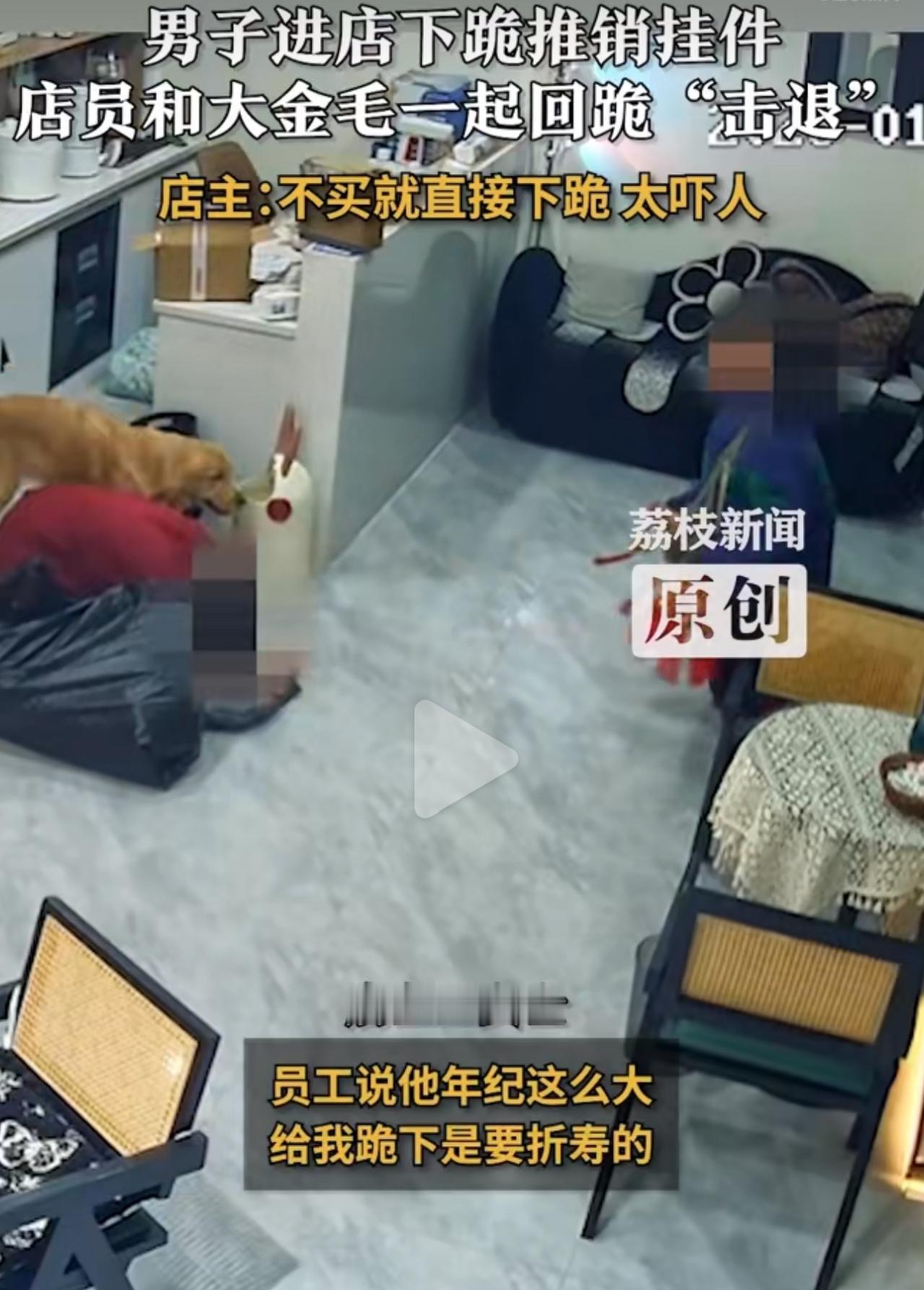 1月4号那天,有个男的推门进店里推销挂件,嘴里含含糊糊地说自己嘴笨、说话不利索,想让店员帮忙买一个。店员耐着性子客客气气地拒绝了,哪成想这男的二话不说,“噗通”一声就直挺挺跪地上了,这明摆着就是想用下跪耍无赖施压,逼着店员掏钱买他的东西啊! 店员当时一下就慌了,怕挂件里藏着不明东西,又被这突然的下跪整得手足无措。情急之下她心一横,干脆也跟着跪了。店里的金毛见这阵仗,也懂事地趴在旁边,一人一狗对着跪,直接把那推销的男的整懵了! 店主王女士后来跟人聊起这事儿,头摇得跟拨浪鼓似的,直说这种“不买就跪”的招数也太膈应人了,简直就是明晃晃的道德绑架!网友们刷到这事儿,一个个都乐疯了,直呼这波操作就是“魔法打败魔法”,店里那只金毛,更是绝了,妥妥的神助攻啊! 其实这种下跪式推销早就不是新鲜事儿了,这帮人专挑个体店铺的女经营者下手。真遇上这种情况,最好还是先录像再报警,千万别被对方的套路牵着鼻子走。毕竟买不买东西是咱的自由,哪能靠下跪来逼单呢!挂件 男子进店不停磕头强行推销挂件 强行推销