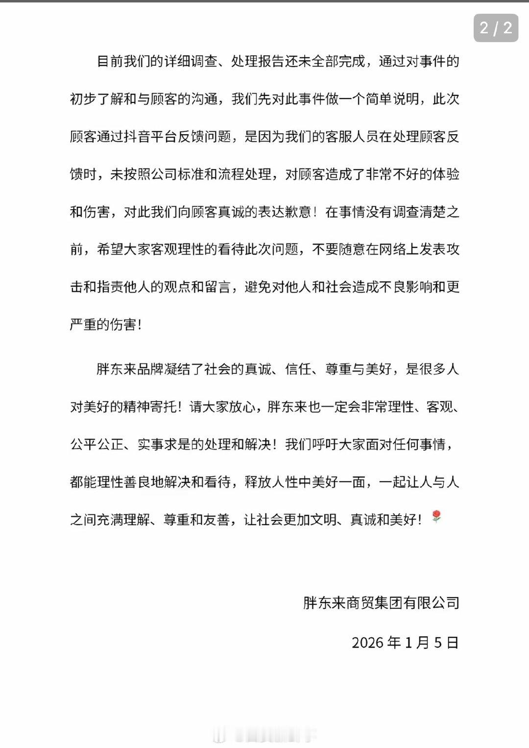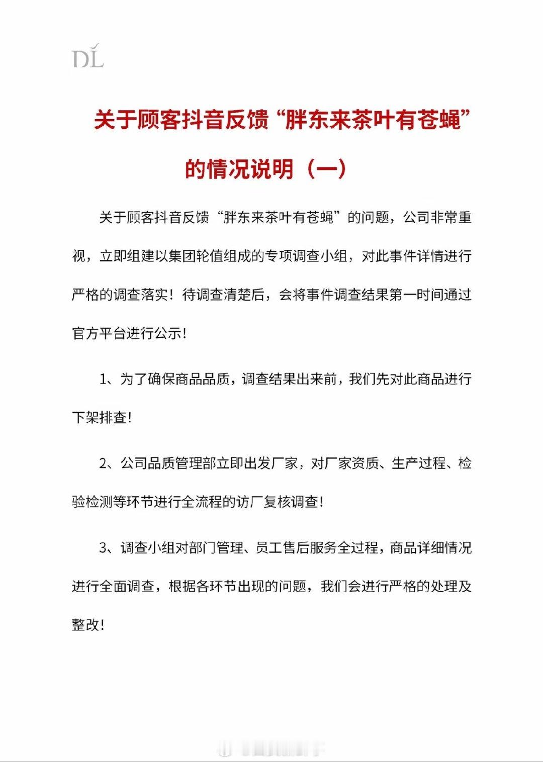 【胖东来就对顾客造成不好体验致歉】胖东来调查顾客反馈茶叶有苍蝇问题1月5日,胖东来发布《关于顾客抖音反馈‘胖东来茶叶有苍蝇’的情况说明(一)》。关于顾客抖音反馈“胖东来茶叶有苍蝇”的问题,公司非常重视,立即组建以集团轮值组成的专项调查小组,对此事件详情进行严格的调查落实!待调查清楚后,会将事件调查结果第一时间通过官方平台进行公示!1、为了确保商品品质,调查结果出来前,我们先对此商品进行下架排查!2、公司品质管理部立即出发厂家,对厂家资质、生产过程、检验检测等环节进行全流程的访厂复核调查!3、调查小组对部门管理、员工售后服务全过程,商品详细情况进行全面调查,根据各环节出现的问题,我们会进行严格的处理及整改! 目前我们的详细调查、处理报告还未全部完成,通过对事件的初步了解和与顾客的沟通,我们先对此事件做一个简单说明,此次顾客通过抖音平台反馈问题,是因为我们的客服人员在处理顾客反馈时,未按照公司标准和流程处理,对顾客造成了非常不好的体验和伤害,对此我们向顾客真诚的表达歉意!在事情没有调查清楚之前,希望大家客观理性的看待此次问题,不要随意在网络上发表攻击和指责他人的观点和留言,避免对他人和社会造成不良影响和更严重的伤害!……