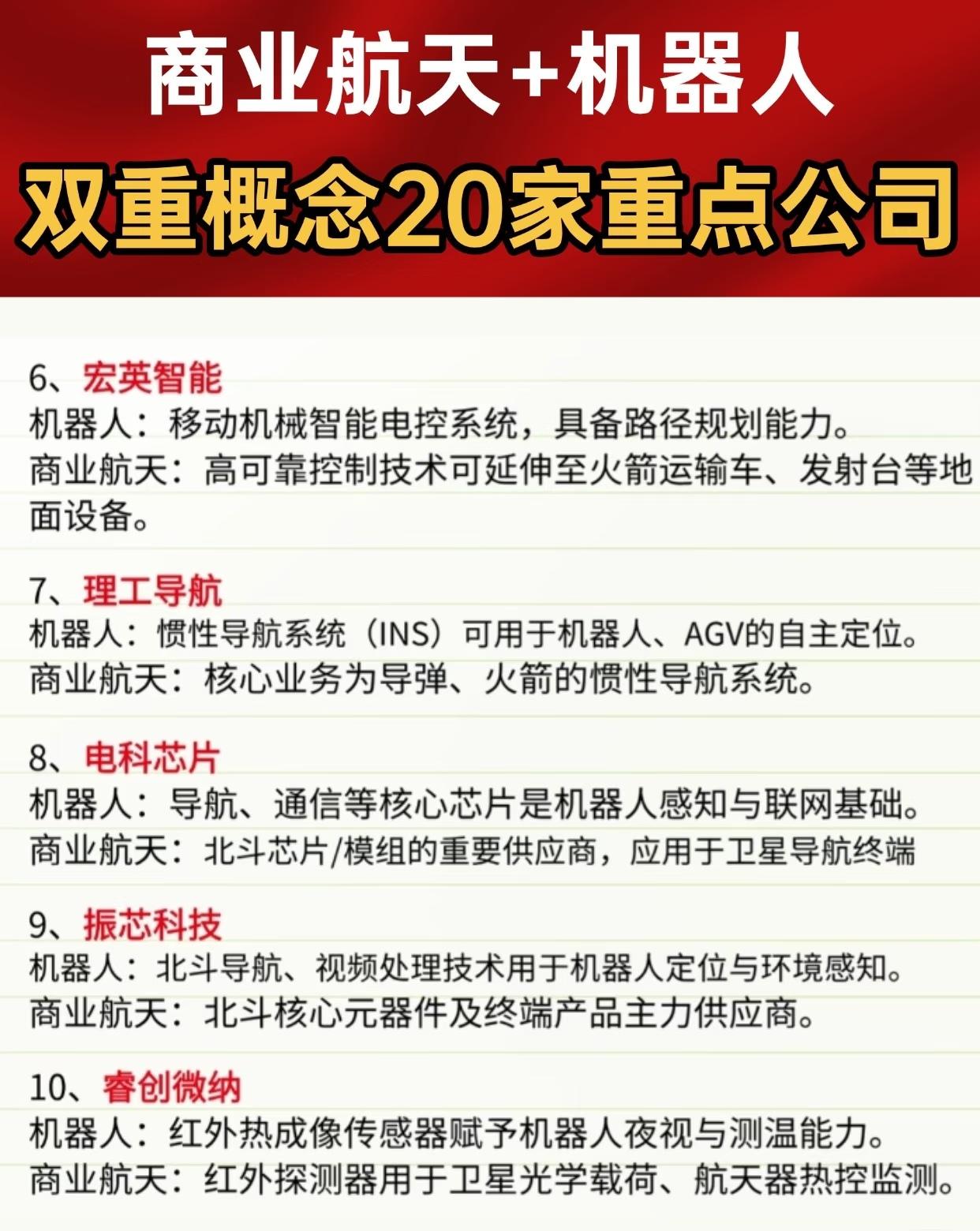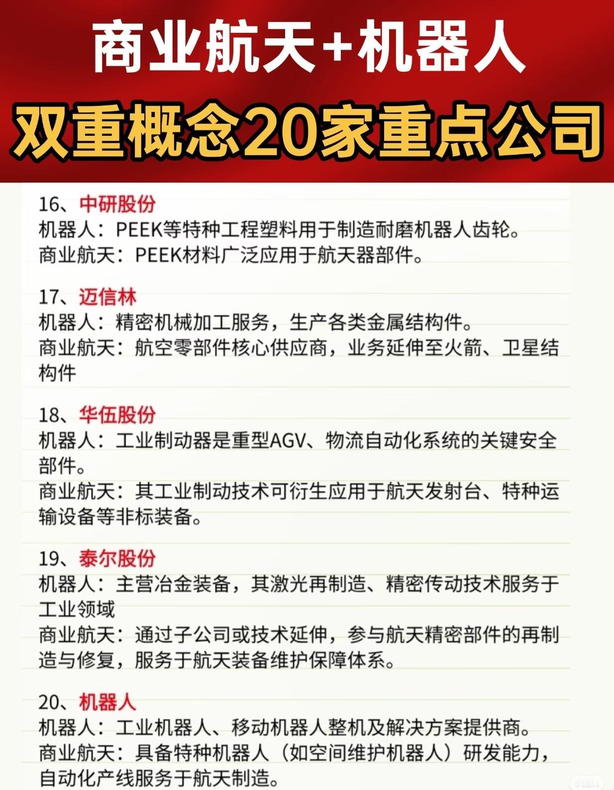 商业航天 + 机器人双重概念 20 家重点公司名单及应用方向。 核心要点: 1. 领域交叉:这些公司在机器人(精密轴承、减速器、传感器、控制系统、结构材料等)与商业航天(卫星部件、火箭/发射平台设备、导航芯片、特种材料等)均有布局。 2. 代表技术与产品: - 机器人核心部件:谐波减速器、伺服电机、精密轴承、丝杠、液压缸、导航与控制芯片、传感器等。 - 航天应用领域:卫星驱动机构、火箭发射平台液压系统、惯性导航、北斗芯片、卫星通信天线、航天器结构测试、特种材料(如PEEK纤维)、空间维护机器人等。 3. 覆盖环节:从核心零部件、整机到地面支持设备、卫星互联网、导航终端、航天装备制造与维护,形成完整产业链交叉布局。