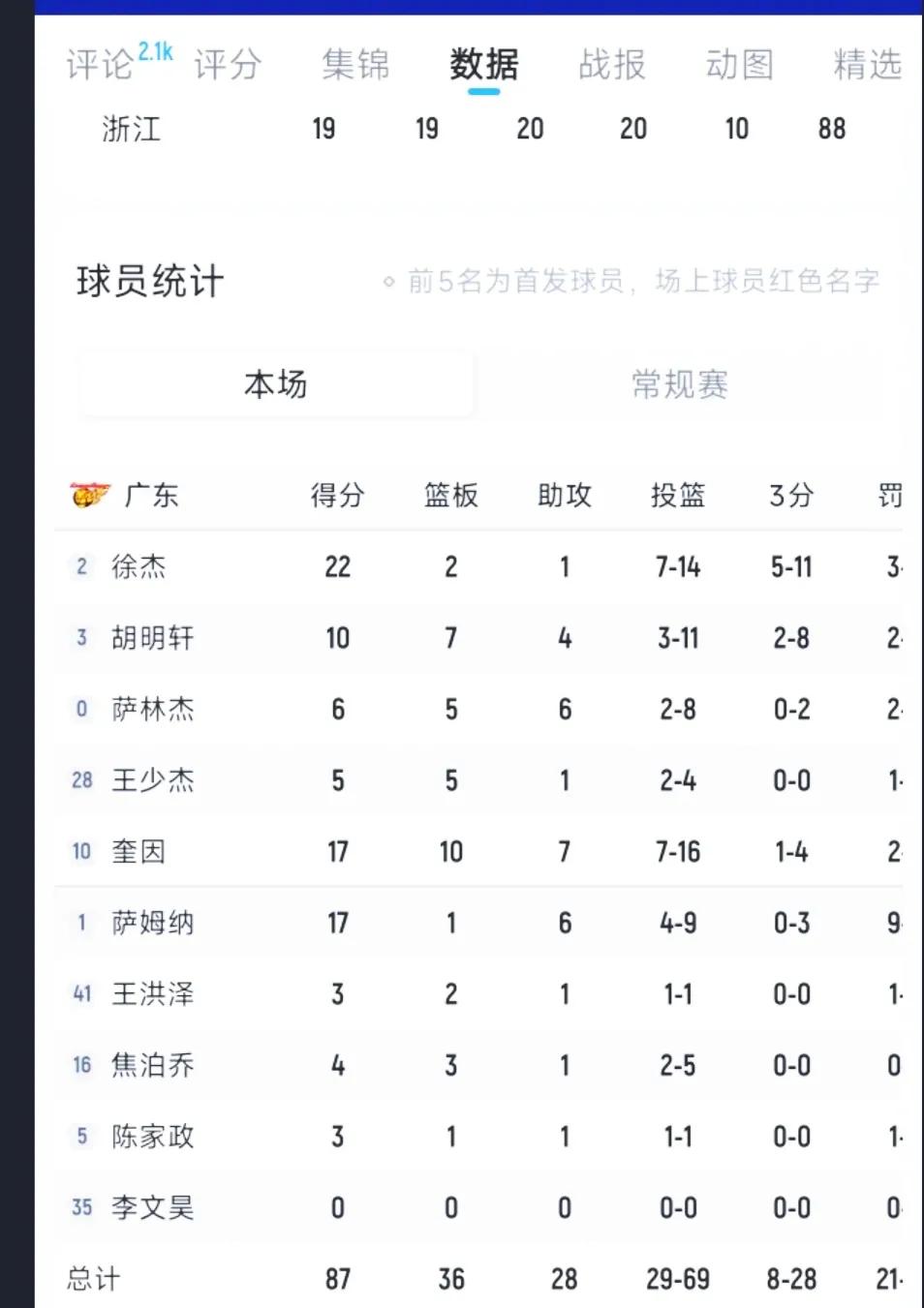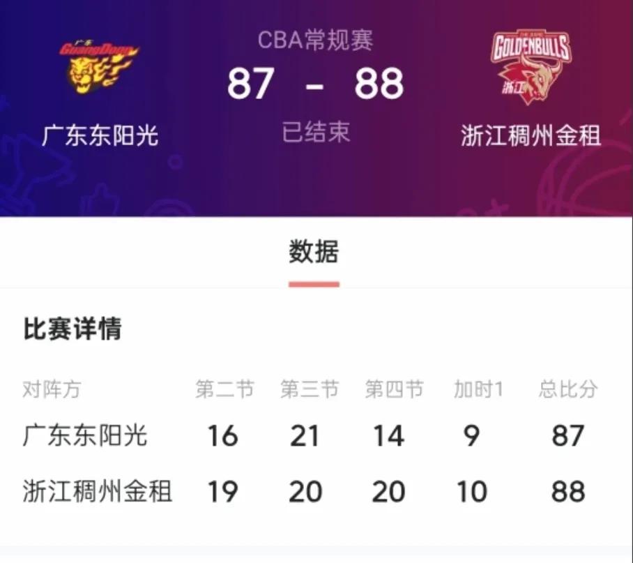 广东通过加时赛还是87-88一分惜败给浙江。 有领先过16分,最终输球,比赛跌宕