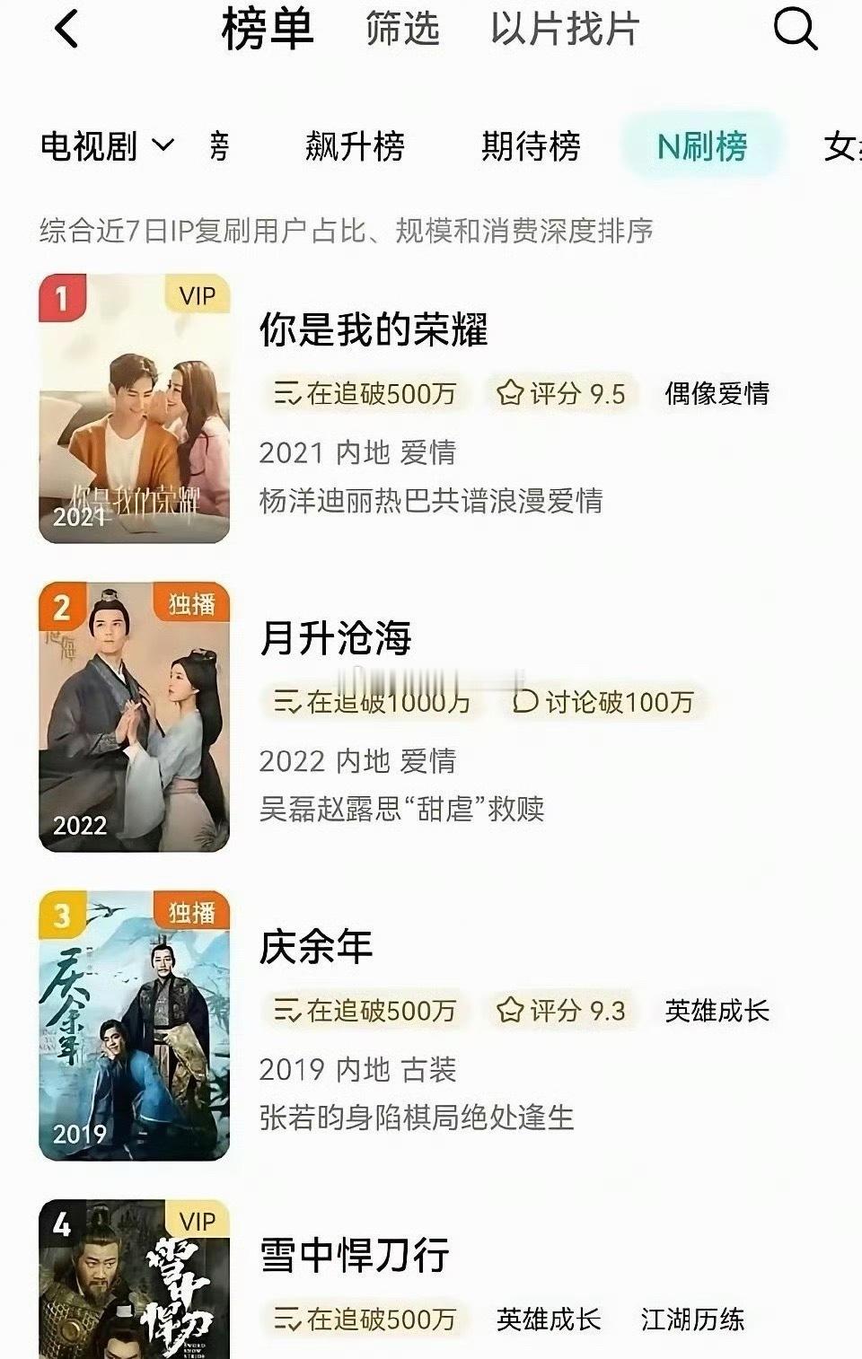 腾讯电视剧N刷榜迪丽热巴杨洋《你是我的荣耀》登顶榜首