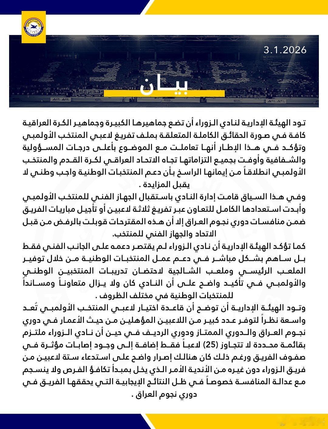 u23国足 U23亚洲杯 国足 【对手动态】伊拉克队推迟6日抵达 俱乐部拒不放人作为中国队在本届U23亚洲杯赛上的第一个对手,伊拉克U23国家队于1月3日在首都巴格达重新集结,原定于昨天(4日)飞抵利雅得。但如今因为多家俱乐部拒绝放人而不得不推迟,据称6日才会从巴格达出发抵达利雅得。而与中国队同组的另外两个对手则都已经飞抵利雅得。①伊拉克与中国同住此番U23亚洲杯赛是按照明年亚洲杯赛的标准和规格来进行的,因利雅得的酒店并不是那种高楼大厦,一般都只有两三层,房间的数量有限。所以,这次组委会将中国队和伊拉克队安排在了同一家酒店,而泰国队和澳大利亚队则下榻另一家酒店。换而言之,两个小组八支队伍在利雅得分布在4个各不相同的酒店里。由于中国队与伊拉克队同住一个酒店,而且还是第一场比赛的对手,所以,中国队在3日下午抵达入住之后也很关心伊拉克队是否已经抵达。酒店方面先前称是4日抵达,也就较中国队晚一天。但在昨天(4日),酒店方面告知:他们得到消息,伊拉克队将推迟至6日才抵达,但具体原因并不清楚。实际上,伊拉克U23国足目前正遭遇前所未有的“危机”,因不少伊拉克国内俱乐部拒绝放人,伊拉克U23国足或许无法以完整阵容出战本届U23亚洲杯赛!这对中国队而言,未必不是一个好消息。酒店大门口摆放着中国与伊拉克的国旗②俱乐部拒放人背后事情的起因是:去年12月27日,伊拉克足协召开新闻发布会,伊拉克U23国足主教练埃马德·穆罕默德公布了伊拉克队参加U23亚洲杯赛的最终23名球员名单,并表示考虑到目前伊拉克国内联赛正在紧张进行,所以队伍决定在1月3日才集中,然后在4日前往利雅得准备8日开始的首场小组赛。不过,名单一经公布便引起轩然大波,以扎瓦拉为首的多家俱乐部明确表示将不会放队员前往U23国足报到。导致这种情况并不是因为俱乐部方面不愿意配合,而实在是伊拉克足协先前调整联赛赛程、压缩联赛时间的做法就已经令诸多俱乐部大为不满。在去年12月1日至18日,国际足联认可的阿拉伯国家杯赛在卡塔尔进行。为确保伊拉克国家队参加这次比赛并争取好成绩,伊拉克足协专门暂停了国内联赛。而同一时间里,伊拉克U23国足也组织集训并参加了12月4日至17日在卡塔尔进行的U23海湾杯赛,为本届U23亚洲杯赛进行练兵。不过,伊拉克国家队在阿拉伯国家杯赛的1/4决赛中被约旦队淘汰、无缘四强。回到国内后,伊拉克足协提出,为了让伊拉克国家队有更多的时间准备今年3月份的世预赛跨洲附加赛,决定调整伊拉克国内联赛赛程,将原本一周一赛调整为一周双赛,也就是几乎每隔三天进行一轮比赛。这样,联赛赛程大幅度压缩,国家队就可以有更加充足的时间来进行备战,全力以赴争取继1986年之后时隔40年再度进军世界杯。伊拉克足协的这个决定招致了众俱乐部的极力反对,之前,因为让路国家队参加世预赛亚洲区的附加赛,联赛已经中断多次,加上阿拉伯国家杯赛,至12月下旬联赛重新开始之前,这个赛季的联赛才进行了七轮,而参加顶级联赛的队伍总共有20支、需进行总共38轮的比赛。如今为了赶进度,将联赛调整为三日一赛,显然将加大队伍的伤病情况,影响到联赛的成绩与排名。在这种情况下,U23国足还要从俱乐部球队中抽调球员,球队根本就无法应对赛程密集的联赛。于是,俱乐部纷纷表示将不会放人也就很容易理解了。伊拉克U23国足1月3日在巴格达集中,首堂训练课仅9人参加也正因为此,当伊拉克U23国足在1月3日中午集中并定于伊拉克当地时间下午16时在巴格达进行训练时,总共就只有9人出现在训练场上。这让主教练埃马德也深感无奈。也正是在这种情况下,伊拉克方面只能通知本届U23亚洲杯赛组委会,延后抵达利雅得。③扎瓦拉队态度强硬此次有5人入选的扎瓦拉俱乐部或许是受人员抽调影响最大的球会。球队埃及籍主教练纳哈斯就称:“伊拉克足协为了给国家队腾出备战时间,将原来的一周一轮联赛改为每三天进行一轮比赛,这就使得球队在如此紧密赛程的情况下不得不采用轮换方式。所以,现在队里的球员一个都不会放,俱乐部需要他们轮换参加剩下的联赛轮次。”而扎瓦拉俱乐部在3日晚上发布官方声明,对此做出了进一步解释。声明称:“扎瓦拉俱乐部自始至终一直是支持伊拉克足协和伊拉克各级国字号队伍的,这体现在俱乐部经常将自己的球场作为训练场地无偿提供给伊拉克各级国字号队伍,而且以往每次抽调球员也都是按时让他们到国家队报到。但这一次,我们确实是遇到了前所未有的困难。目前,俱乐部总共注册的一线队队员不到25人,而且还有严重的伤病情况,要应对三天一轮联赛,现有人员根本就不够实用。更何况,即将在沙特进行的U23亚洲杯赛并不是在国际足联指定的国际比赛窗口期进行。所以,我们完全有理由不放球员离队。”扎瓦拉俱乐部声明扎瓦拉俱乐部在声明中还称,“先前,我们曾与伊拉克足协进行过多次沟通,并提出了多种解决方案。其中一项是:伊拉克足协推迟扎瓦拉队的联赛赛程,以确保球员能够前往U23国足报到,同时也不影响球队自身的成绩。但在三天一轮的赛程下,伊拉克足协不同意我们的联赛延期方案,因为再往后根本无法安排补赛。所以,我们只能选择拒不放人。而且,我们并不担心会受到处罚,因为国际足联和亚足联都不会因为非国际比赛窗口期拒绝放队员参