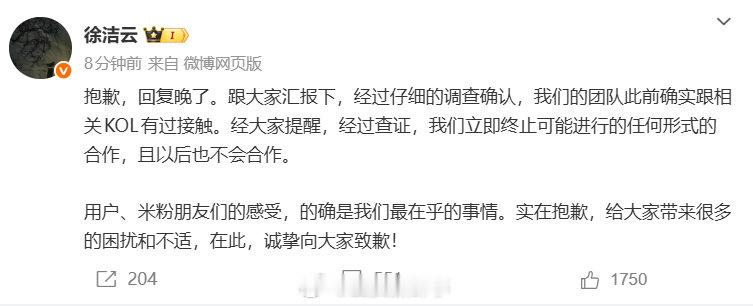 徐洁云称小米立刻终止与争议KOL合作 徐洁云道歉1月5日,小米高管就小米与相关KOL合作一事道歉:抱歉,回复晚了。跟大家汇报下,经过仔细的调查确认,我们的团队此前确实跟相关KOL有过接触。经大家提醒,经过查证,我们立即终止可能进行的任何形式的合作,且以后也不会合作。 用户、米粉朋友们的感受,的确是我们最在乎的事情。实在抱歉,给大家带来很多的困扰和不适,在此,诚挚向大家致歉!
