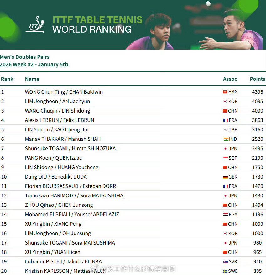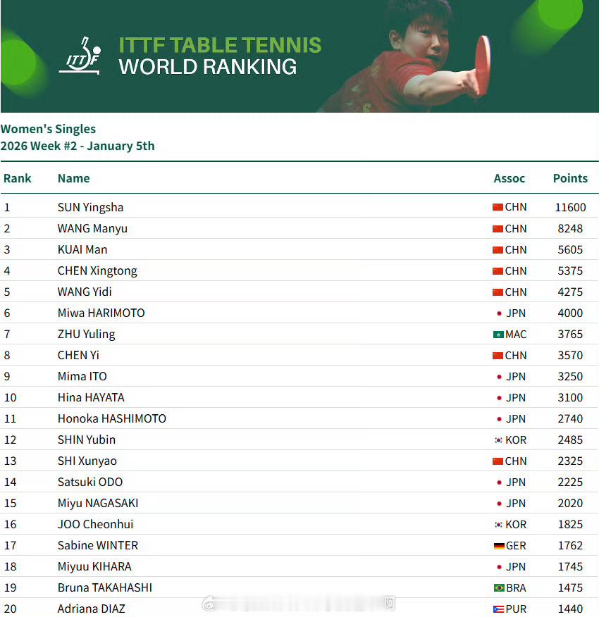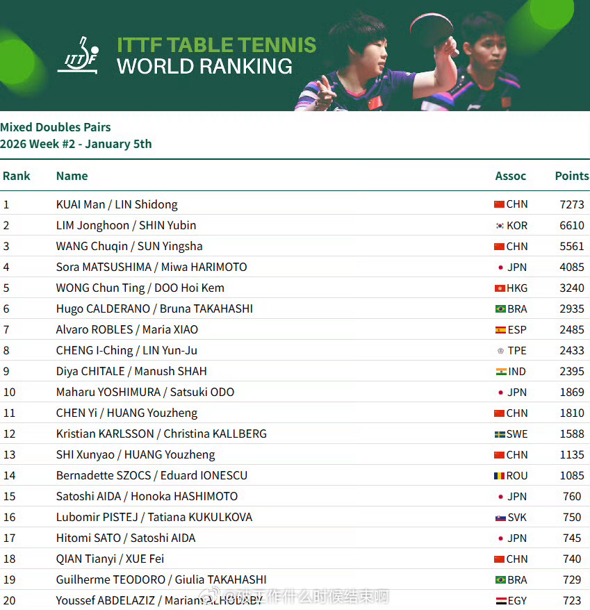 📢国际乒联2026第2周排名📍【国际乒联2026第2周排名】🏓男单:王楚钦、林诗栋位列前二,梁靖崑位列第7,向鹏第11🏓女单:孙颖莎11600分、王曼昱、蒯曼、陈幸同、王艺迪位列前五,陈熠第8🏓男双:王楚钦/林诗栋第3、林诗栋/黄友政第9🏓女双:王曼昱/蒯曼第一、孙颖莎/王曼昱第3、蒯曼/王艺迪第7🏓混双:林诗栋/蒯曼第1、王楚钦/孙颖莎第3孙颖莎连续182周女单第一