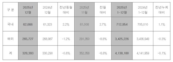 [智车派新闻]现代汽车公司近日公布了其2025年度的全球销售业绩。数据显示,该公司去年在全球范围内共销售了约414万辆汽车。具体而言,韩国国内市场销量为712954辆,较上年增长1.1%;海外市场销量为3425226辆,微降0.3%。
