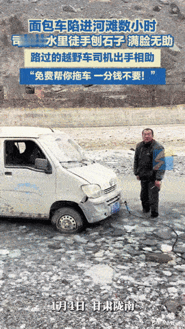 河滩上的暖心救援:大冷天他光脚刨石子,路过车主一句“免费拖车”暖人心 1月4日甘肃陇南,冰冷的河滩上,一辆面包车陷在碎石里数小时。司机站在刺骨的水里,光脚徒手刨着石子,脸上写满无助——他已经在这儿折腾了好几个小时。 路过的几辆车都没停留,直到到越野车主张先生。“大冷天的,看他不容易,我就说‘免费帮你拖车,一分钱不要!’”张先生的拖车绳一挂,被困的面包车很快脱困。司机红着眼眶道谢,张先生摆摆手就走了。 在寒冷的河滩上,陌生人的善意像一束光。你遇到过这样的暖心瞬间吗?来评论区聊聊