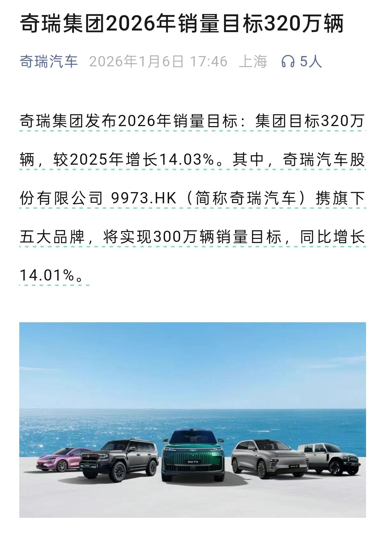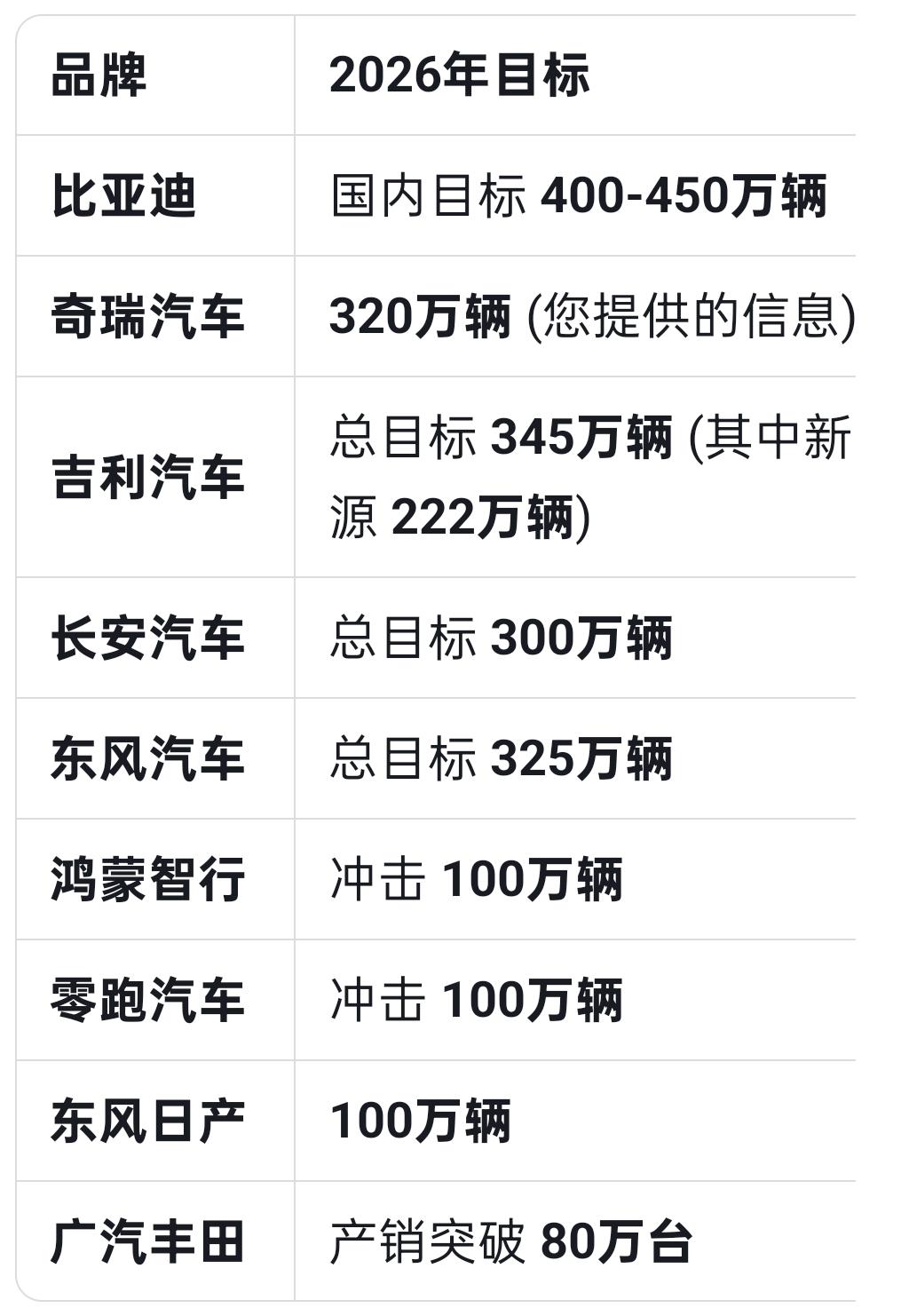 1月份是适合立flag的,让deepseek汇总了一下各品牌2026年目标。 比亚迪国内目标400—450万辆,2025年460万辆,其中海外市场105万辆,也即国内市场355万辆。从增长幅度看,2026年的目标还不是很“激进”。 奇瑞,吉利,长安,东风,目标都迈进了300万辆的门槛。 鸿蒙智行100万辆,这个是比较恐怖的,豪华车市场肯定是要变天了。 零跑汽车100万辆,增长幅度是比较大的。【来自懂车帝车友圈】