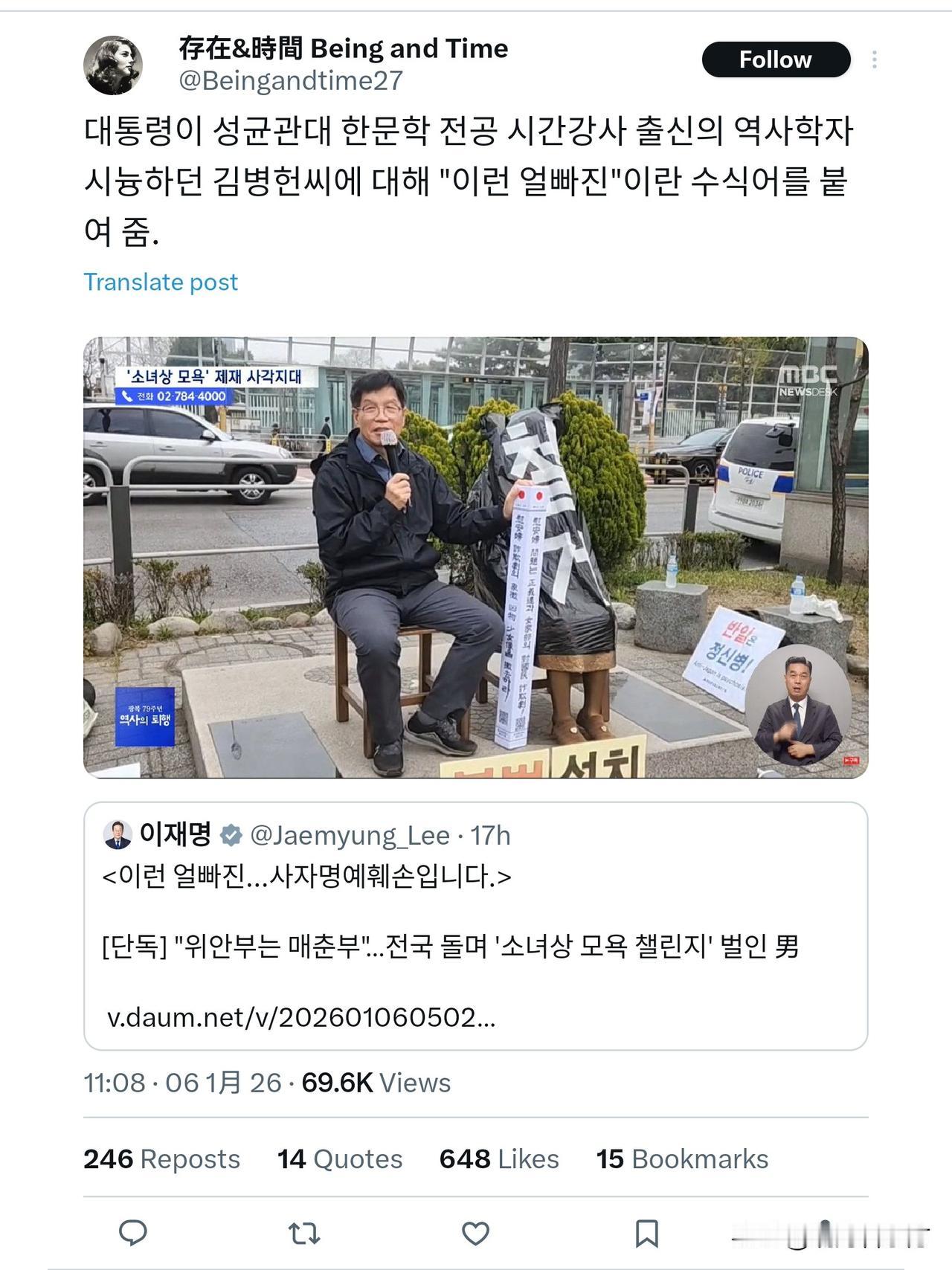 韩国右翼在网上疯狂的攻击和抹黑、挖苦访华并释放友好善意的韩国总统李在明。有鉴于头条的审核机制,我就不分享这些心存恶意、不学无术、稀里糊涂的搅局者的垃圾信息了。韩国的右翼分子通常会在账号上标注美日韩三国国旗,很多人都是亲日分子后代,他们想干的就是改变日本占领时期的历史叙事,美化日本侵略战争。比如那个破坏慰安妇雕像的家伙就是韩国的伪历史学家,他在成均馆大学学的是中国文学,然后利用所学的知识篡改日本侵略战争的叙事方式,可以说特别无耻。就是下图这家伙,他声称慰安妇都是“妓女”,行为极其恶劣。
