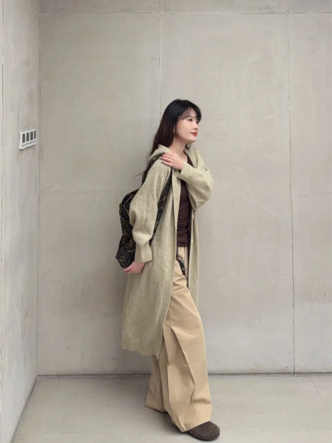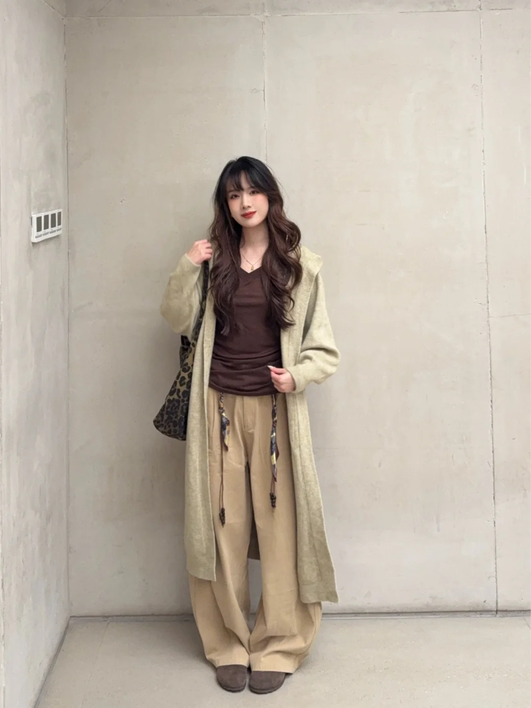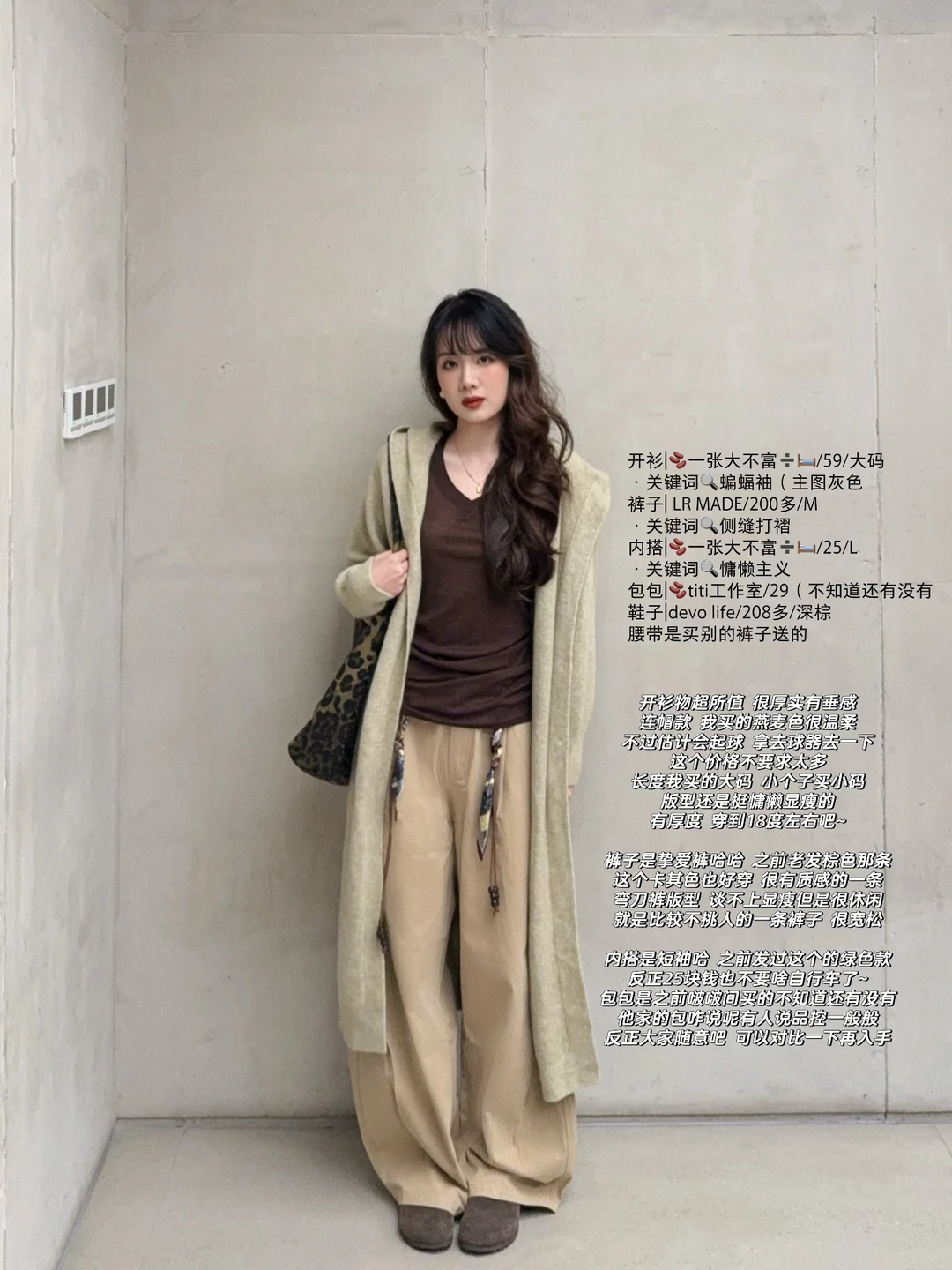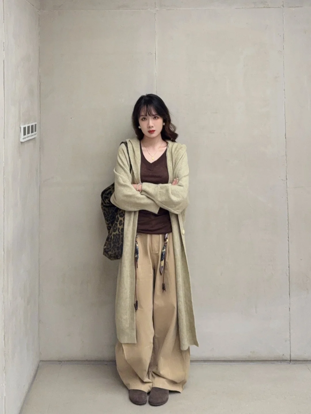 168/106左右 分享一套简单的同色系穿搭~ 很温柔的燕麦➕棕色系 除此之外还可以搭配复古蓝的拖地牛仔裤 或者露腿穿也是可以的 搭配靴子还蛮有感觉