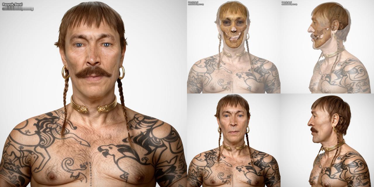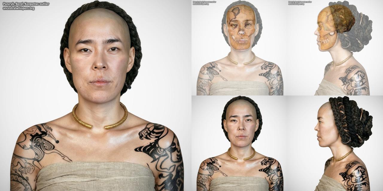 2300年前哈萨克斯坦人长这样:男的像欧洲人,女的像东亚人?近日科学家对哈萨克斯坦别列尔的同一座斯基泰文明的库尔干墓中距今2300年的男性和一位女性遗骸进行了面部重建。 一男一女年龄分别约为30-55岁和18-25岁,葬于同一座库尔干墓中,墓内陪葬品丰富。男性兼具高加索人和东亚人的特征,高加索人特征更为明显,与其他出土的头骨遗骸相似,可能出身于当地的斯基泰精英阶层。相比之下,女性则展现出更为显著的东亚人特征。具有此类特征的个体在普通墓葬和精英墓葬中均有发现,例如在阿克阿拉哈3/5号墓地。考古学家和人类学家推测,这位女性可能融入了帕泽雷克社会的精英阶层,并可能与库尔甘塔斯文化有关。 两具骨骼均显示出死后开颅的痕迹。男性头骨上有一个不规则的穿孔,系钝器伤所致,后经锋利工具修整。女性头骨上有一个矩形穿孔(64 × 35.8 毫米),带有切割痕迹,并附有一块切除的碎片(42 × 33 毫米),表明其系死后人为开颅,很可能是木乃伊制作过程的一部分。