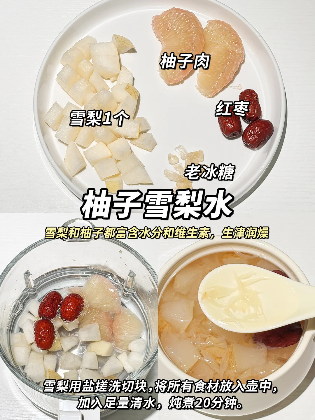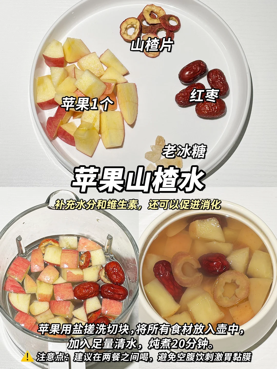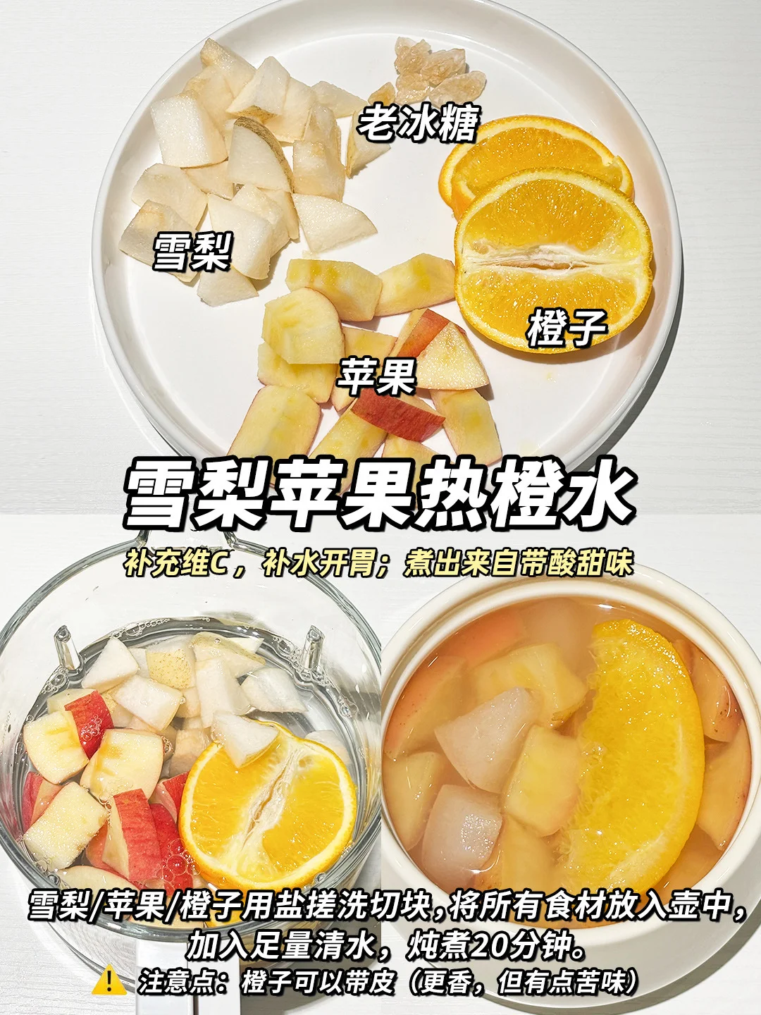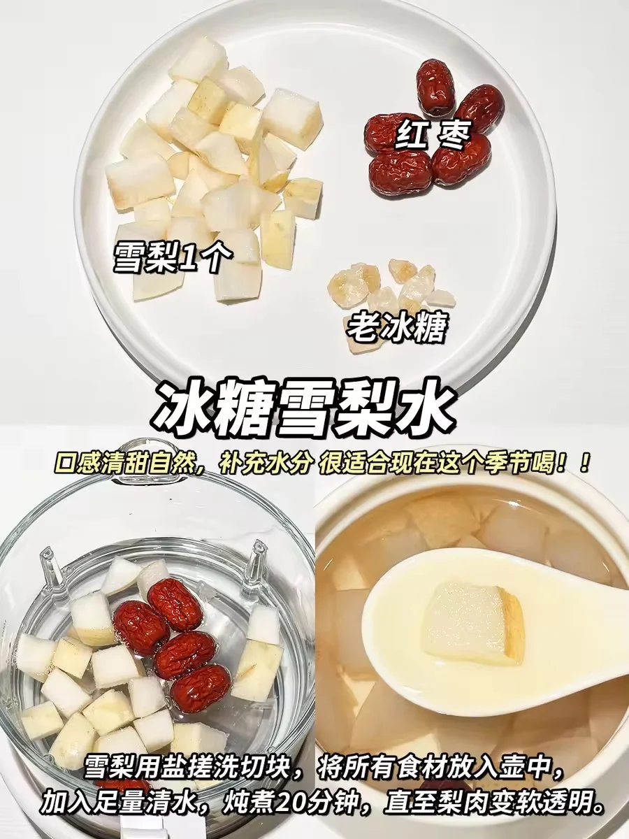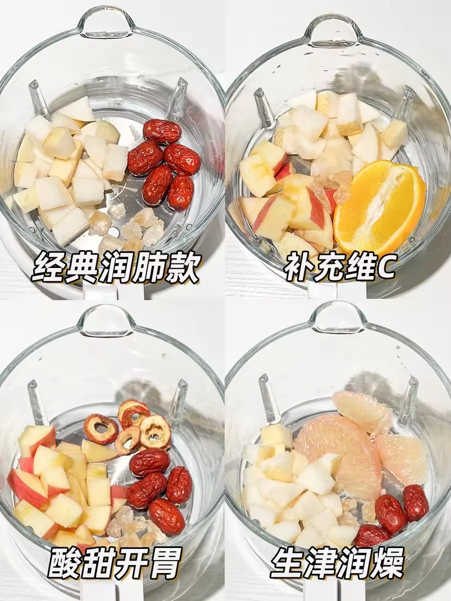 🌬️秋冬季节干燥,经常容易感到口感舌燥、即使喝了很多水也不能缓解。所以最近在家研究🍎水果养生茶,确实比喝白开水有用,比较润,酸甜酸甜的还挺好喝,还富含丰富的维生素和膳食纤维。 🍐冰糖雪梨水-经典润肺款 🍎雪梨苹果热橙水-补充维C 清甜好喝 🔸苹果山楂水-酸甜开胃 化积消食 🔸柚子雪梨水-生津润燥 💁♀️今天分享的这4款水果茶,都是自己现在有在喝的,食材也是比较家常的应季水果,做法也简单~大朋友小朋友都可以这些水果茶~