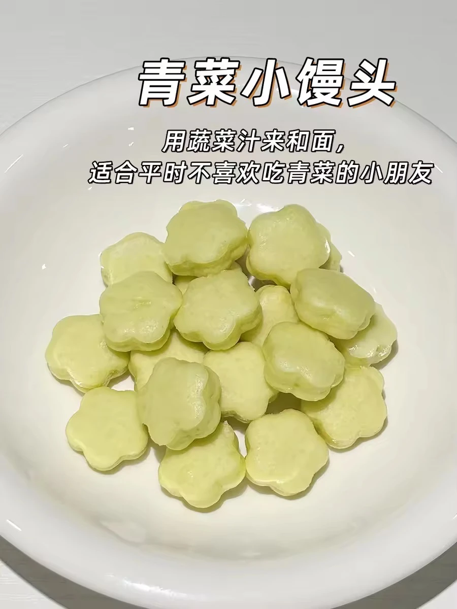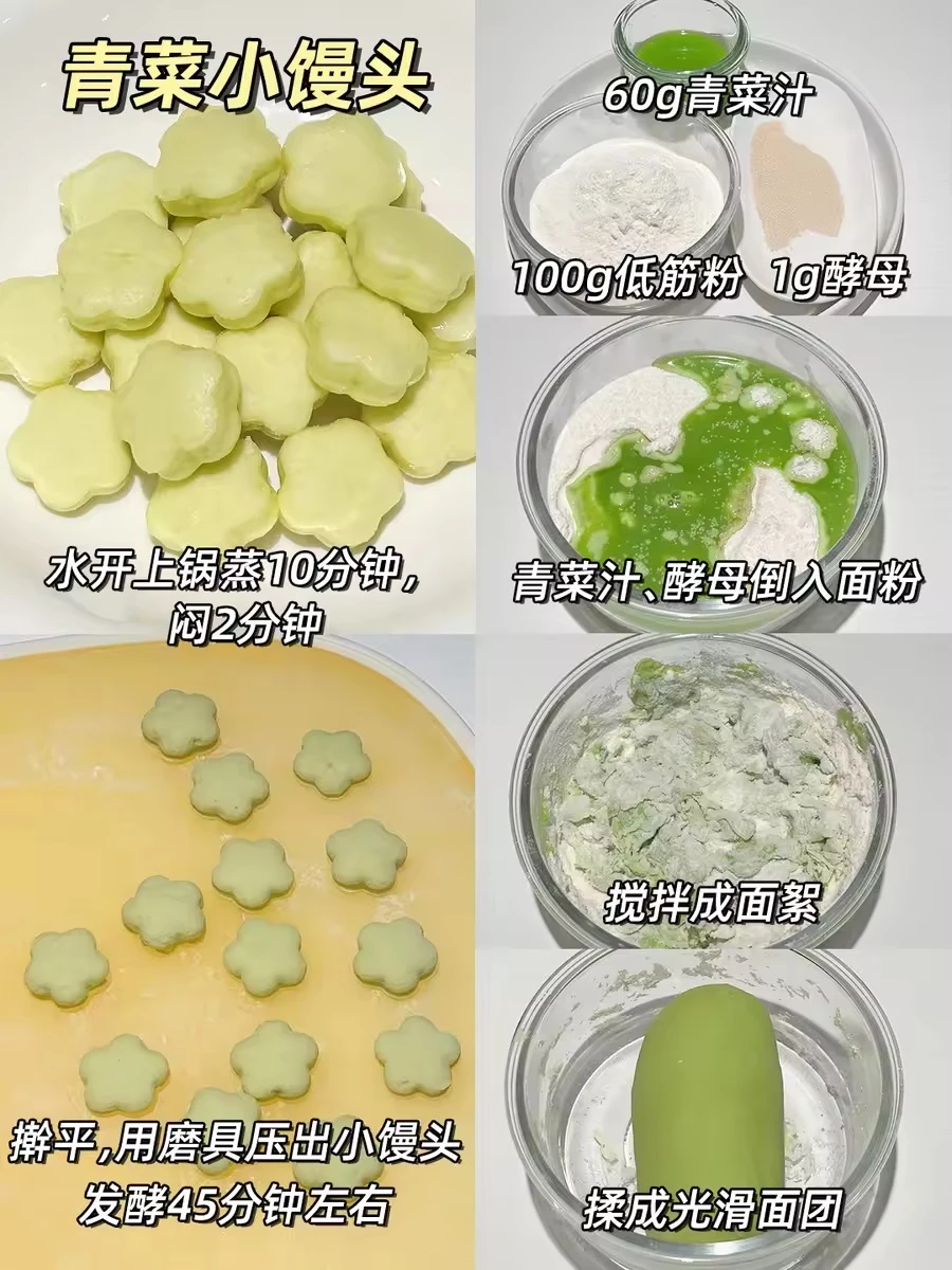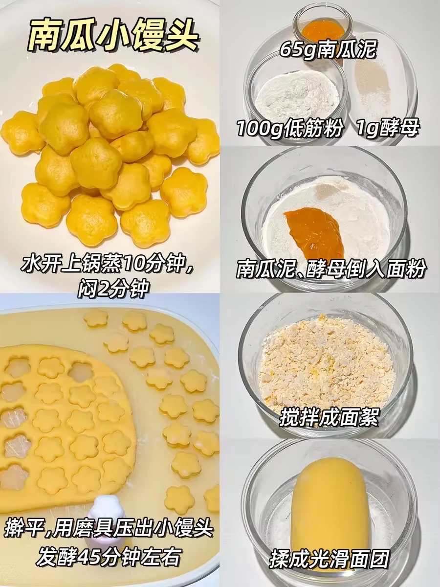 今天分享4款宝宝手指小馒头,都比较容易上手,自带果蔬微甜口感~细腻蓬松。这次做成可爱的👉小花朵形状,用磨具直接按压就行。一粒一粒的,可以做作为宝宝的手指食物。锻炼宝宝的咀嚼抓握能力~ 👉做小馒头的基本材料【低筋面粉,水,酵母】水可以用不同的蔬菜汁或蔬菜泥替代,增加营养看起来也更好看有食欲,配方简单,自己做也是真材实料。 🌈果蔬小馒头的详细配方: 🥛原味小馒头(100g面粉,60ml水,1g酵母) 🎃南瓜小馒头(100g面粉,65g南瓜泥,1g酵母) 紫薯小馒头(100g面粉,65g紫薯泥,1g酵母) 🥬蔬菜小馒头(100g面粉,60g蔬菜汁,1g酵母) 🚩其中果蔬泥,也可以换成自己喜欢的蔬菜种类,配比类似。如果新手做可以少量多次的放果蔬泥 ✅做法:(具体可以看上面图片) 1.将果蔬蒸熟搅打成泥 2.酵母放入温水中搅拌均匀(30-38度) 3.一起倒入低筋面粉搅拌成絮状(如果感觉比较干,就淋一点点水) 4.在继续揉成光滑的面团 5.面团擀成面皮,用磨具压成小花形状 6.发酵45分钟-1小时 7.水开上汽蒸10分钟,闷2分钟 🚩小提示: 1.小馒头胚子,要盖起来发酵45分钟左右,维持一定的温度。且馒头表面不会风干裂开。 2. 发酵完成判断:胚子明显变大1.5倍,手指按下去会慢慢回弹,拿起来会明显感到变轻且软~