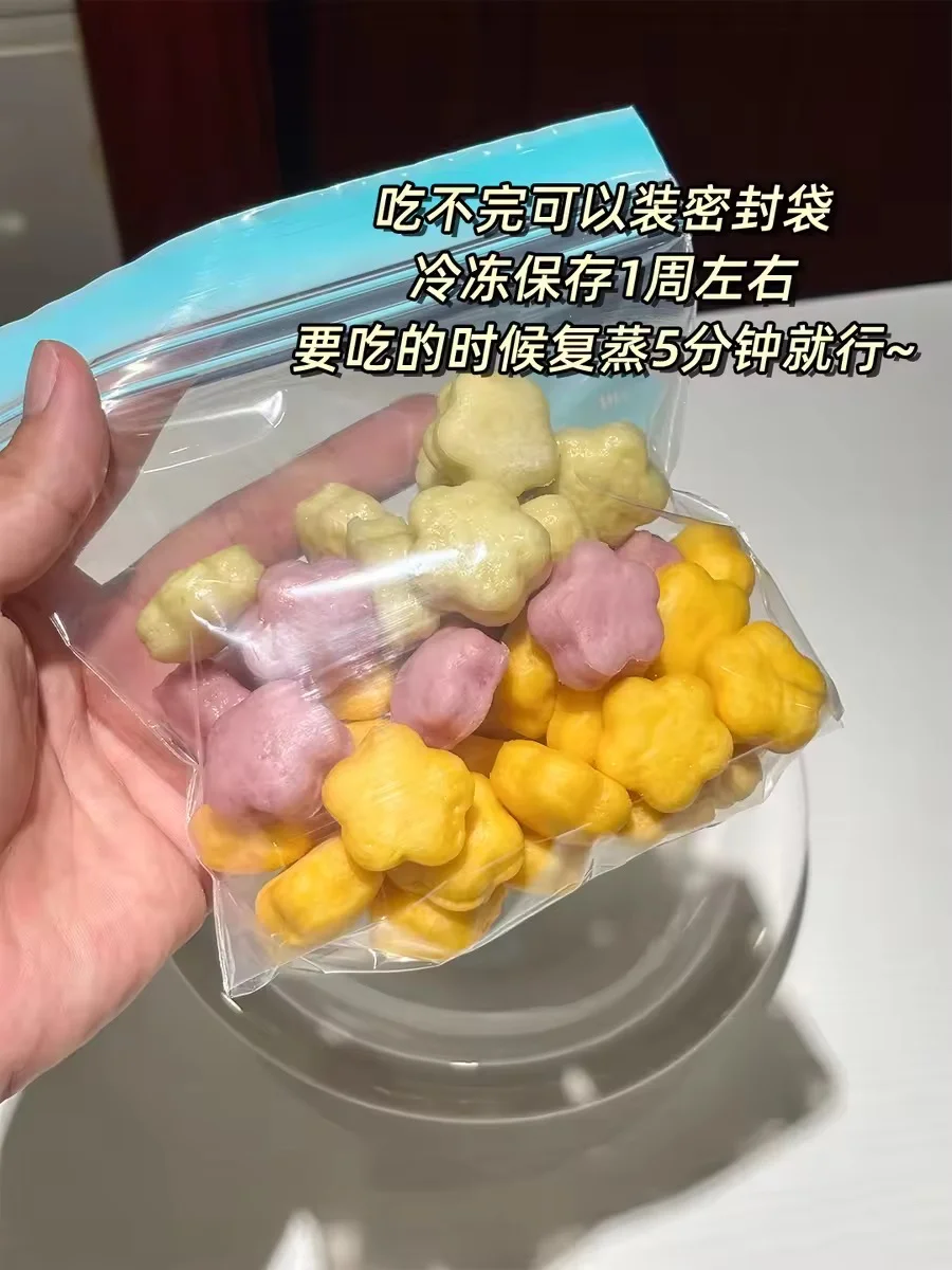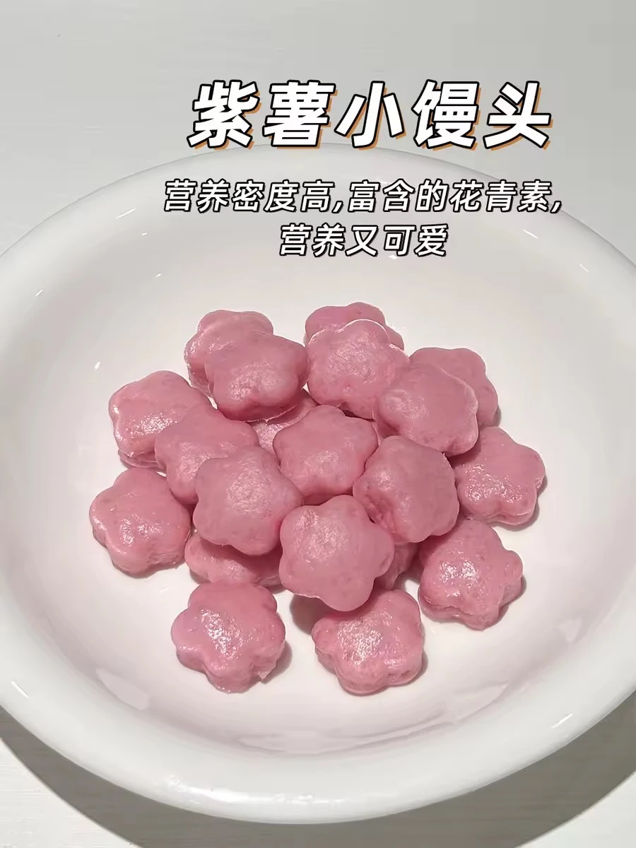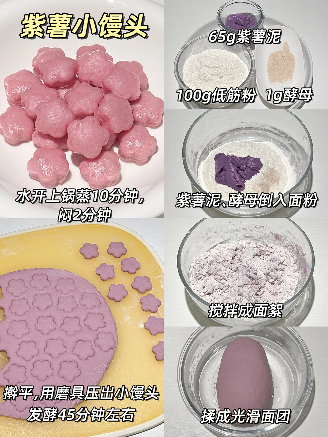 今天分享4款宝宝手指小馒头,都比较容易上手,自带果蔬微甜口感~细腻蓬松。这次做成可爱的👉小花朵形状,用磨具直接按压就行。一粒一粒的,可以做作为宝宝的手指食物。锻炼宝宝的咀嚼抓握能力~ 👉做小馒头的基本材料【低筋面粉,水,酵母】水可以用不同的蔬菜汁或蔬菜泥替代,增加营养看起来也更好看有食欲,配方简单,自己做也是真材实料。 🌈果蔬小馒头的详细配方: 🥛原味小馒头(100g面粉,60ml水,1g酵母) 🎃南瓜小馒头(100g面粉,65g南瓜泥,1g酵母) 紫薯小馒头(100g面粉,65g紫薯泥,1g酵母) 🥬蔬菜小馒头(100g面粉,60g蔬菜汁,1g酵母) 🚩其中果蔬泥,也可以换成自己喜欢的蔬菜种类,配比类似。如果新手做可以少量多次的放果蔬泥 ✅做法:(具体可以看上面图片) 1.将果蔬蒸熟搅打成泥 2.酵母放入温水中搅拌均匀(30-38度) 3.一起倒入低筋面粉搅拌成絮状(如果感觉比较干,就淋一点点水) 4.在继续揉成光滑的面团 5.面团擀成面皮,用磨具压成小花形状 6.发酵45分钟-1小时 7.水开上汽蒸10分钟,闷2分钟 🚩小提示: 1.小馒头胚子,要盖起来发酵45分钟左右,维持一定的温度。且馒头表面不会风干裂开。 2. 发酵完成判断:胚子明显变大1.5倍,手指按下去会慢慢回弹,拿起来会明显感到变轻且软~