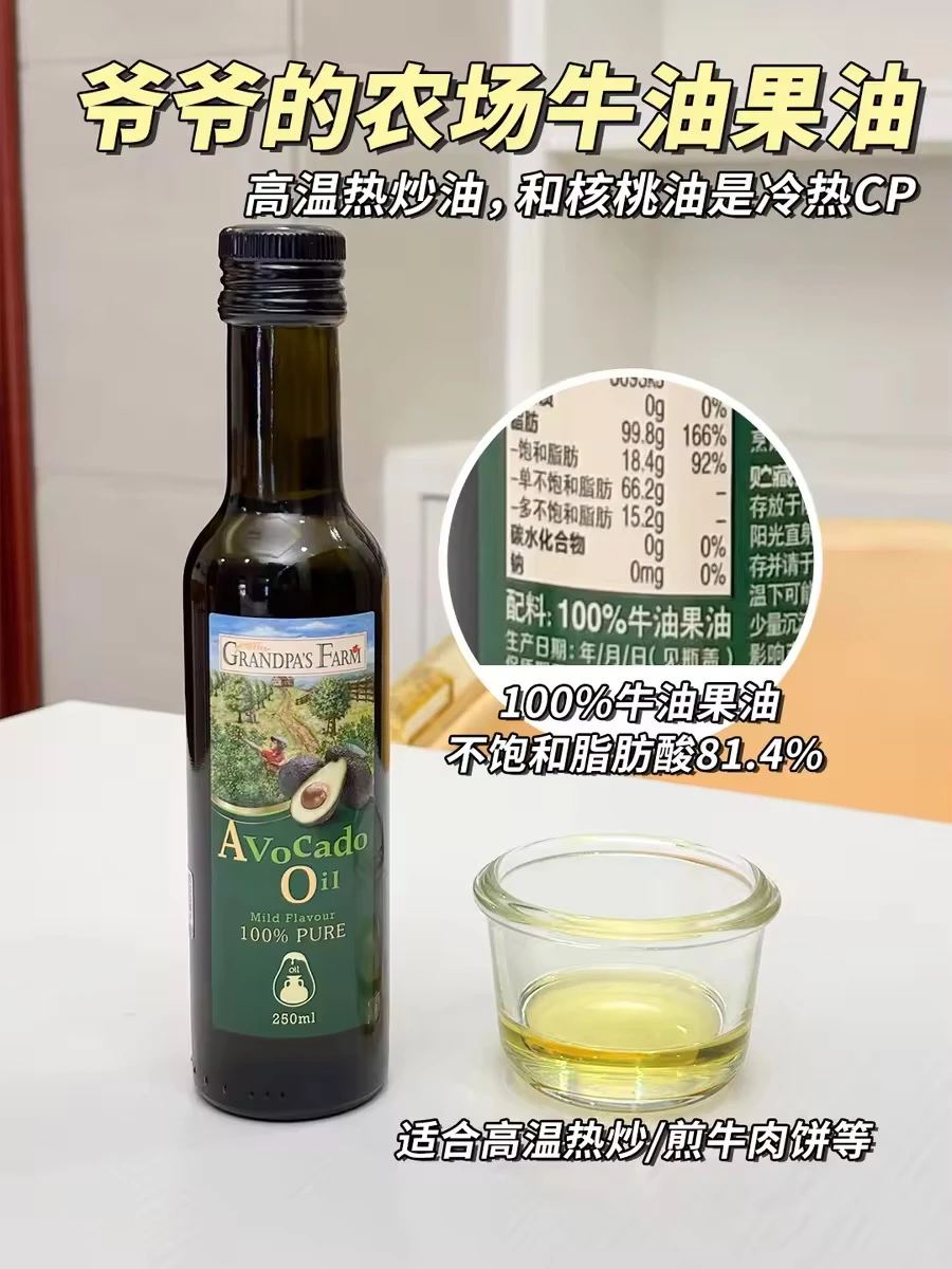 煎炒时可以用爷爷的农场牛油果油,含有丰富的Omega-9和叶黄素,不饱和脂肪酸高达81.4%,油烟点高,炒菜时有股淡淡的果香味宝宝比较好接受~
