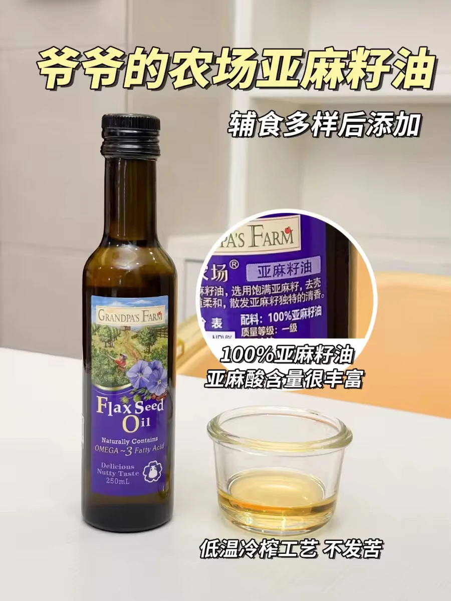 ▫辅食多样化后,可以添加不同种类辅食油,像爷爷的农场亚麻籽油含有丰富的亚麻酸可转化DHA,里面不饱和脂肪酸含量有89.2%,吃起来没有苦味,冷吃热炒都可以!