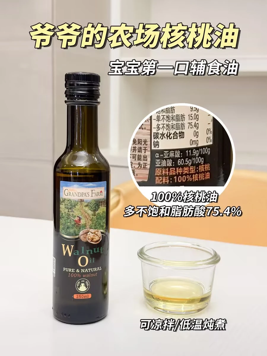 ▫第1口辅食油建议是选核桃油,像爷爷的农场核桃油多不饱和脂肪酸75.4%,亚麻酸和亚油酸黄金营养配比,口感清淡,宝宝容易接受!