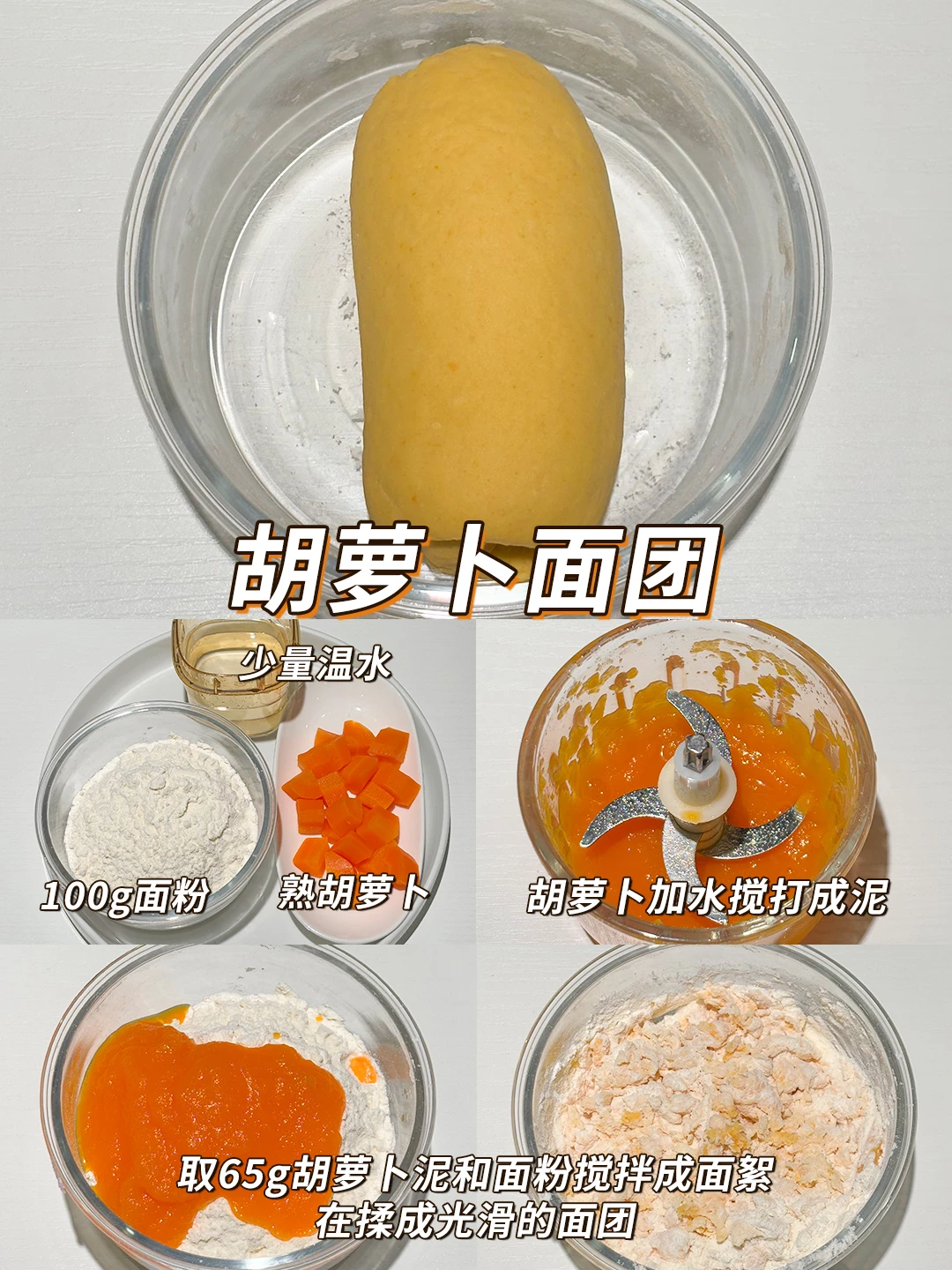 🥕胡萝卜面团:100g面粉,65g胡萝卜泥,1g酵母