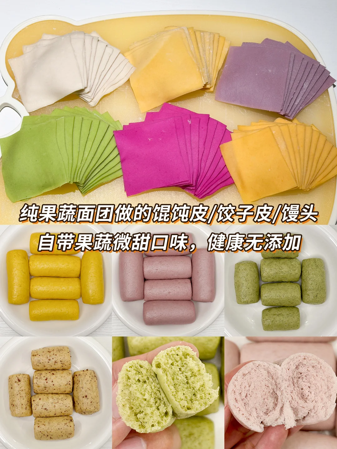 给宝宝做辅食有三年多了,几乎每周都会做一些面点辅食。平时会往里面加果蔬泥揉成果蔬面团,可以做成果蔬口味小馒头、馄饨皮、饺子皮、面条等都通用;