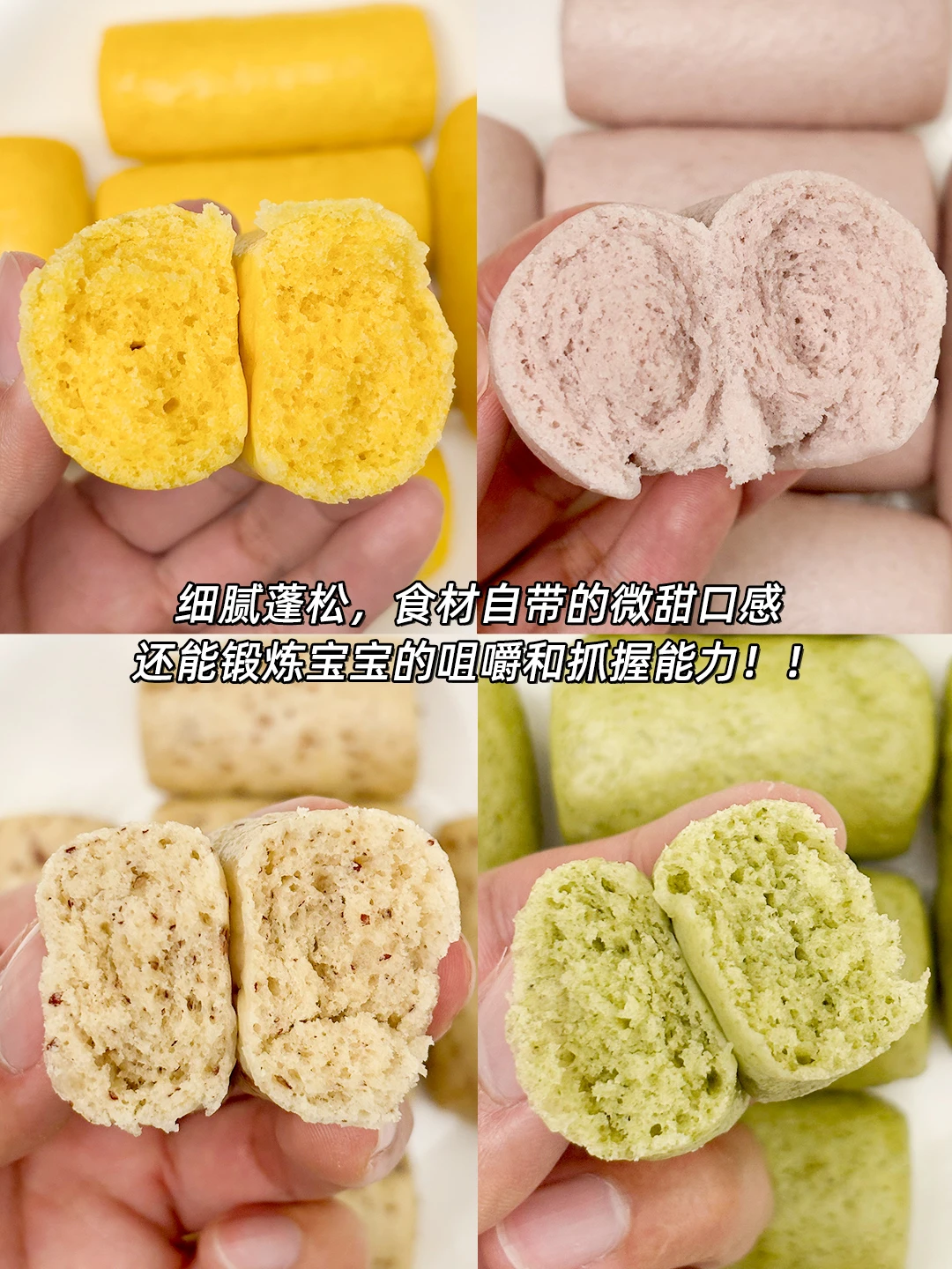 这次分享几种不同口味的宝宝手指馒头,都比较容易上手~细腻蓬松自带食材的微甜口感,做成宝宝容易抓握的样子,可以作为宝宝的手指食物,锻炼宝宝的咀嚼和抓握能力。根据宝宝的咀嚼能力,一般9个月左右可以尝试~
