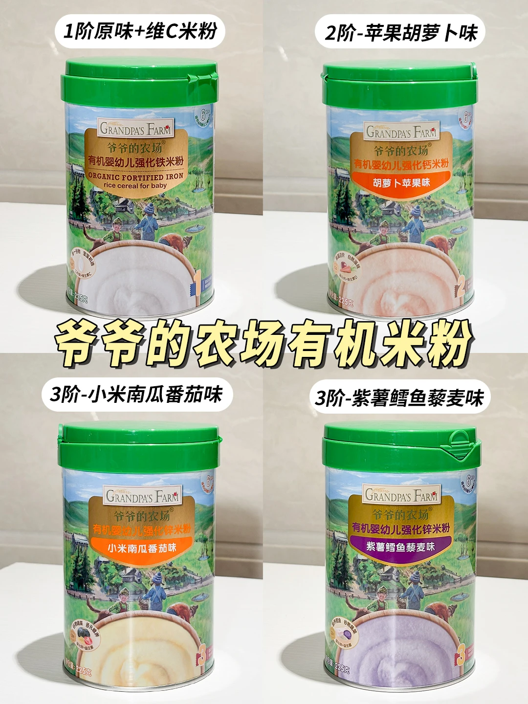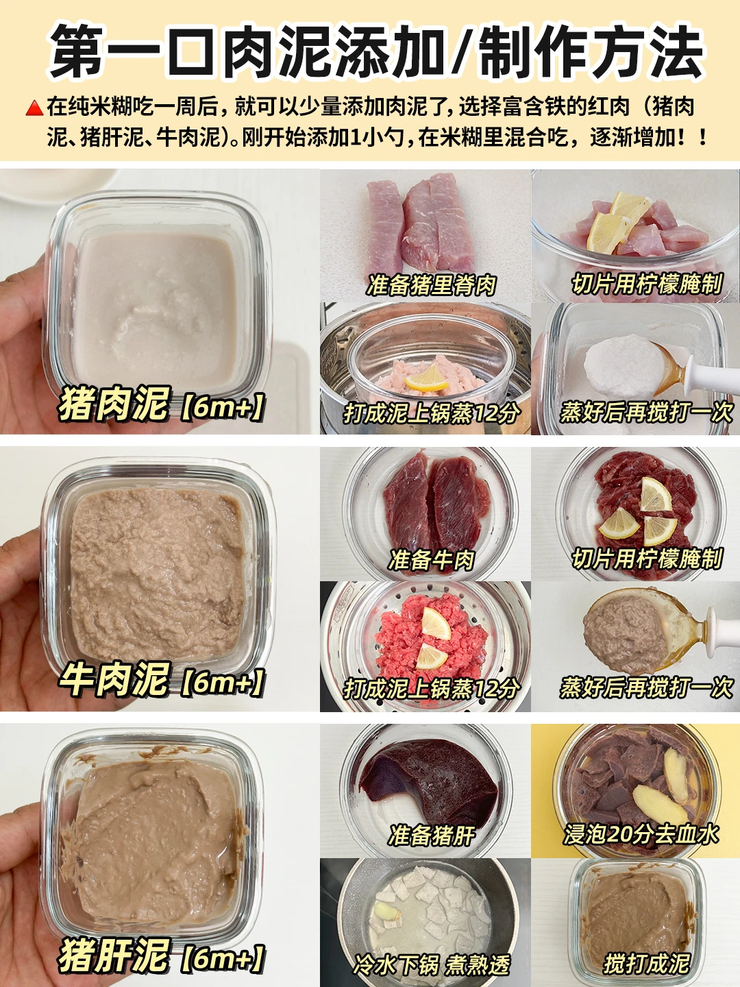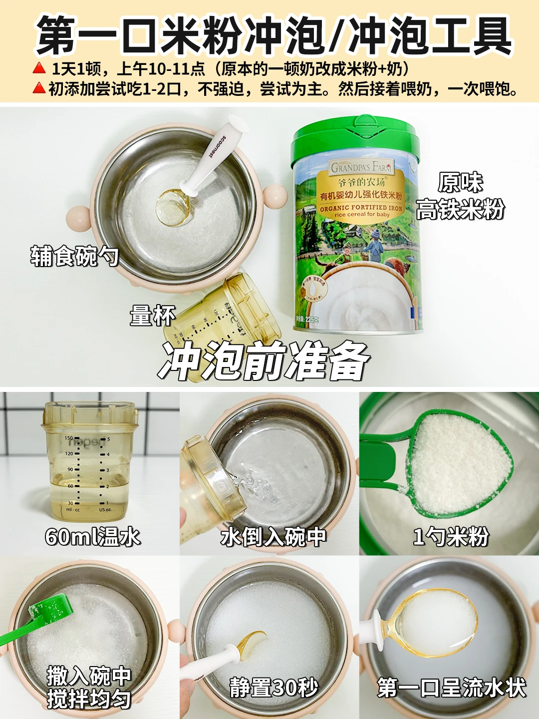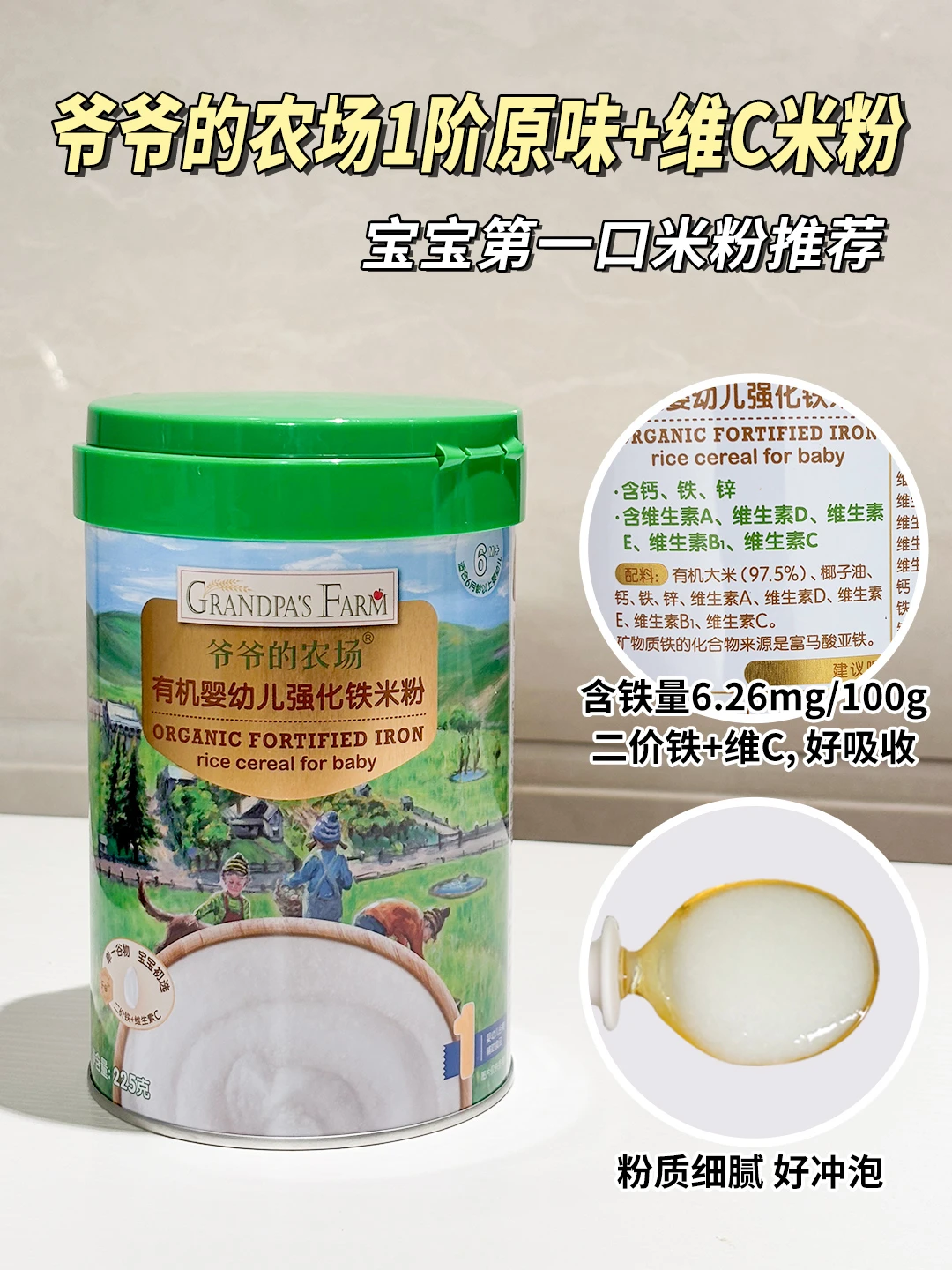 宝宝在6月龄时就可以添加辅食了,以富含铁的食物为主如高铁米粉,刚开始吃纯米糊让宝宝适应,之后可以搭配肉泥,菜泥增加营养密度!! ▫️今天总结分享宝宝第1个月时该怎么吃,米粉冲泡及辅食泥做法添加!! 🌈添加辅食不复杂(添加逻辑) ▪第1步:宝宝第1口辅食选择含铁量高、易消化的食物,单一成分。因为宝宝的肠胃比较娇弱。所以第1口的选择比较重要,通常是选择谷物类的强化铁米粉-高铁米粉; - ▪第2步:安排在上午10-11点吃,以尝试为主,冲泡呈流水状; ▪第3步:纯米糊吃5-7天后,单一添加红肉泥(猪肉/牛肉泥)👉做法图2; ▪第4步:吃完1-2种肉泥后就可以安排菜泥(土豆/胡萝卜/西蓝花)等👉做法图3 ▪第5步:添加辅食半个月后,给宝宝尝试吃水果泥添加米糊单独吃都行,吃1-2勺即可; - ▪第6步:6月下旬,可以尝试混合泥(米糊+肉泥+菜泥),增加营养密度; ▪第7步:吃辅食1个月后,可以尝试不同口味的米粉、蛋黄、辅食粥面;增加食物的多样性,同时锻炼宝宝咀嚼; 🚩备注:每添加一种新食材,要排敏3天,尤其是鸡蛋、鱼虾类;刚开始添加1-2辅食勺,添加量遵循由少到多原则; ⭕宝宝米糊冲泡—图4 ⭕不同时间段冲泡比例—图5 ⭕高铁米粉怎么选?具体可以看图哦! ✅对刚添加辅食宝宝来说,主要看【含铁量高】【二价铁】【维C】的单一谷物米粉;二价铁+维C搭配,能更好吸收; ▫不知道怎么选的新手妈妈,可以试试爷爷的农场米粉,根据不同月龄宝宝营养需求,对应强化钙铁锌,大米原料是【有机大米】。 👉6月龄-1阶原味大米粉,单一谷物,二价铁搭配维C,铁含量6.26mg/100g,粉质细腻好冲泡,适合初添加~ 👉7月龄-2阶苹果胡萝卜味,添加钙550mg和维生素D,果蔬搭配丰富口感 锻炼咀嚼 👉8月龄-3阶小米南瓜番茄味/紫薯鳕鱼藜麦味,多种谷物和荤素搭配,同时添加锌5.5mg和益生菌,营养多样化! 今天就先分享到这啦~