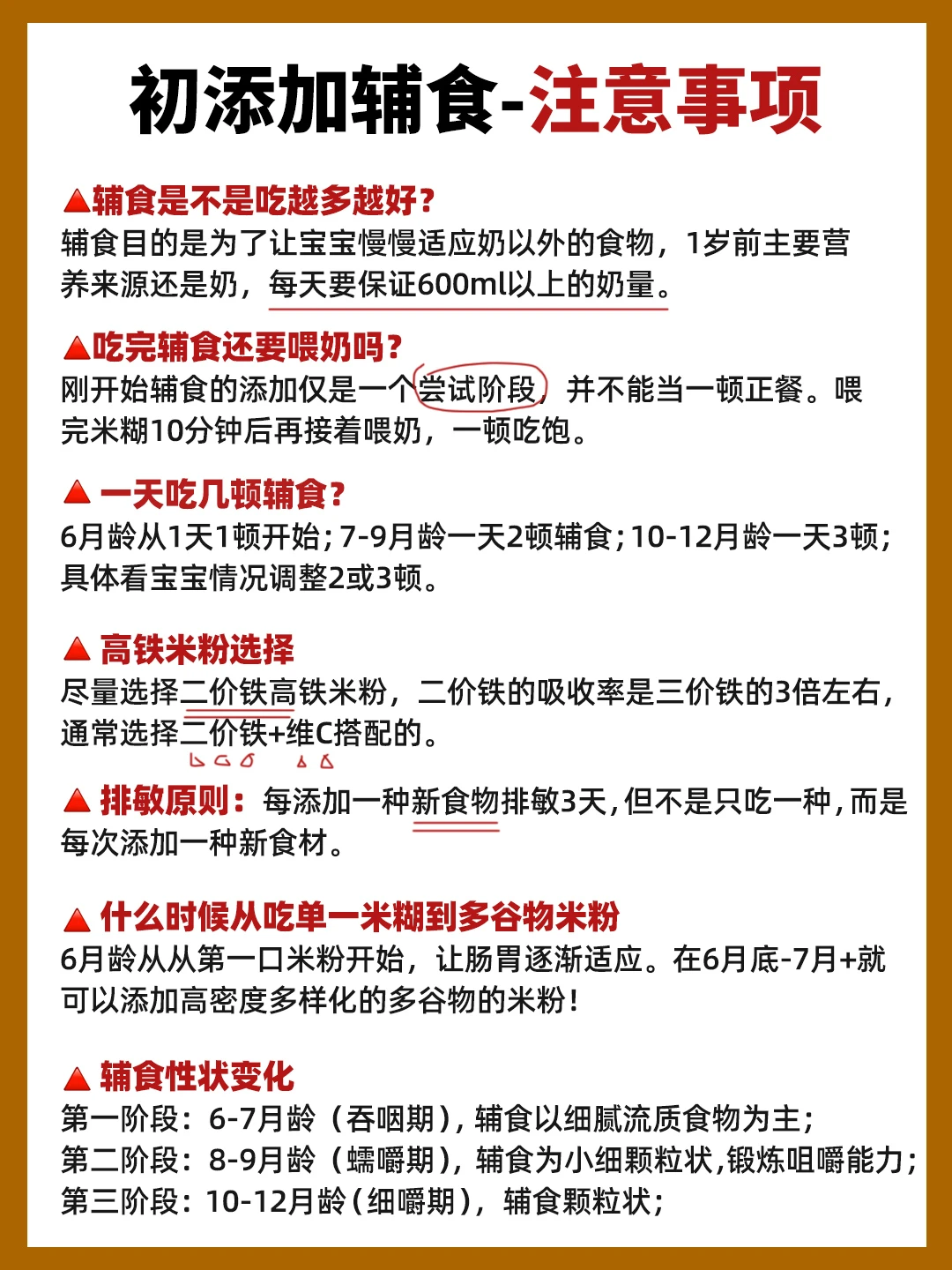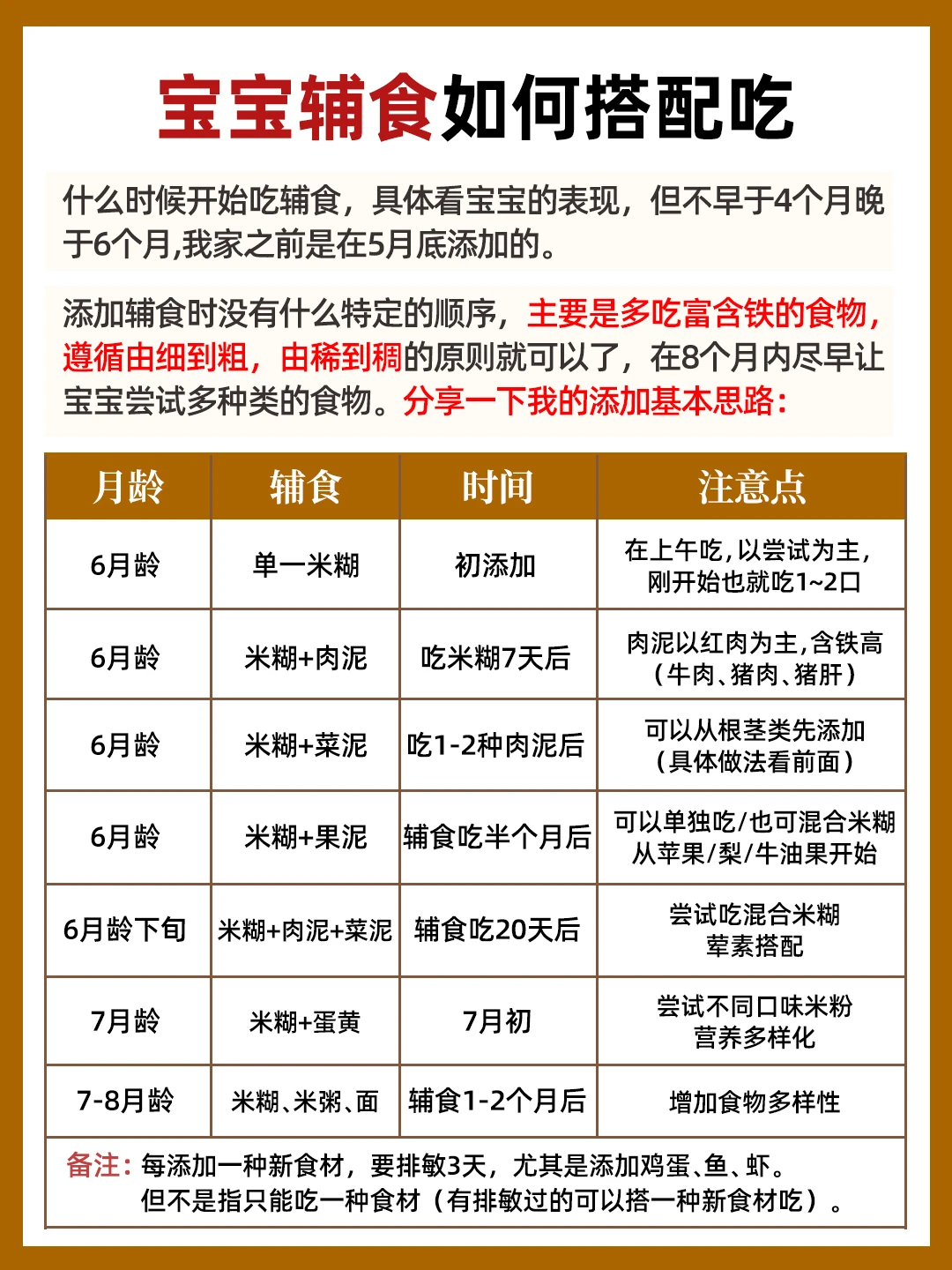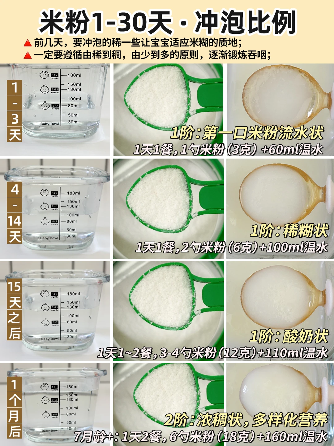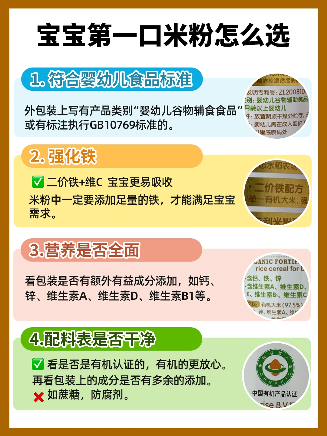 宝宝在6月龄时就可以添加辅食了,以富含铁的食物为主如高铁米粉,刚开始吃纯米糊让宝宝适应,之后可以搭配肉泥,菜泥增加营养密度!! ▫️今天总结分享宝宝第1个月时该怎么吃,米粉冲泡及辅食泥做法添加!! 🌈添加辅食不复杂(添加逻辑) ▪第1步:宝宝第1口辅食选择含铁量高、易消化的食物,单一成分。因为宝宝的肠胃比较娇弱。所以第1口的选择比较重要,通常是选择谷物类的强化铁米粉-高铁米粉; - ▪第2步:安排在上午10-11点吃,以尝试为主,冲泡呈流水状; ▪第3步:纯米糊吃5-7天后,单一添加红肉泥(猪肉/牛肉泥)👉做法图2; ▪第4步:吃完1-2种肉泥后就可以安排菜泥(土豆/胡萝卜/西蓝花)等👉做法图3 ▪第5步:添加辅食半个月后,给宝宝尝试吃水果泥添加米糊单独吃都行,吃1-2勺即可; - ▪第6步:6月下旬,可以尝试混合泥(米糊+肉泥+菜泥),增加营养密度; ▪第7步:吃辅食1个月后,可以尝试不同口味的米粉、蛋黄、辅食粥面;增加食物的多样性,同时锻炼宝宝咀嚼; 🚩备注:每添加一种新食材,要排敏3天,尤其是鸡蛋、鱼虾类;刚开始添加1-2辅食勺,添加量遵循由少到多原则; ⭕宝宝米糊冲泡—图4 ⭕不同时间段冲泡比例—图5 ⭕高铁米粉怎么选?具体可以看图哦! ✅对刚添加辅食宝宝来说,主要看【含铁量高】【二价铁】【维C】的单一谷物米粉;二价铁+维C搭配,能更好吸收; ▫不知道怎么选的新手妈妈,可以试试爷爷的农场米粉,根据不同月龄宝宝营养需求,对应强化钙铁锌,大米原料是【有机大米】。 👉6月龄-1阶原味大米粉,单一谷物,二价铁搭配维C,铁含量6.26mg/100g,粉质细腻好冲泡,适合初添加~ 👉7月龄-2阶苹果胡萝卜味,添加钙550mg和维生素D,果蔬搭配丰富口感 锻炼咀嚼 👉8月龄-3阶小米南瓜番茄味/紫薯鳕鱼藜麦味,多种谷物和荤素搭配,同时添加锌5.5mg和益生菌,营养多样化! 今天就先分享到这啦~