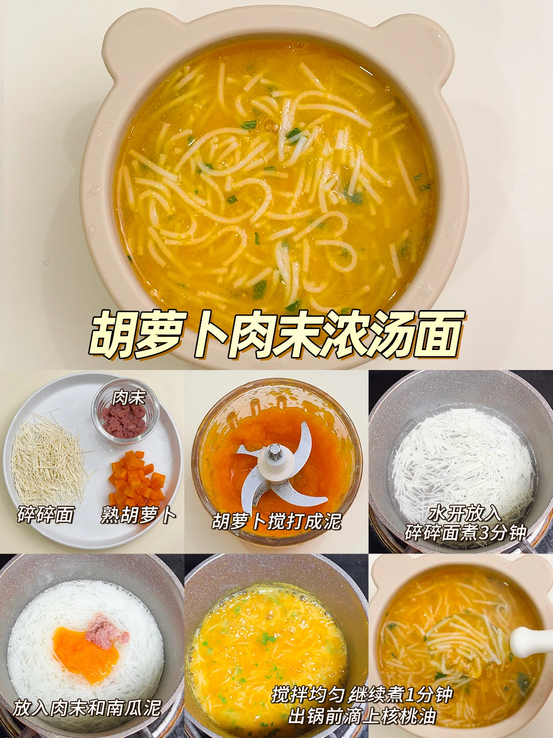 胡萝卜肉末浓汤面(胡萝卜、肉末、青菜碎、短面)