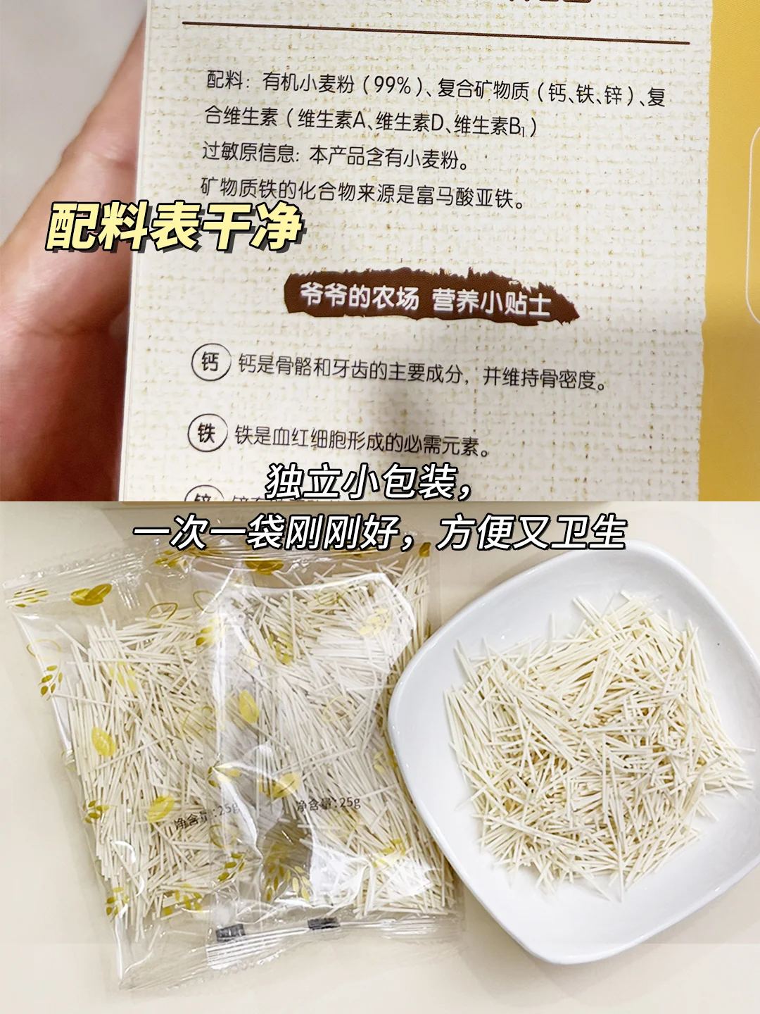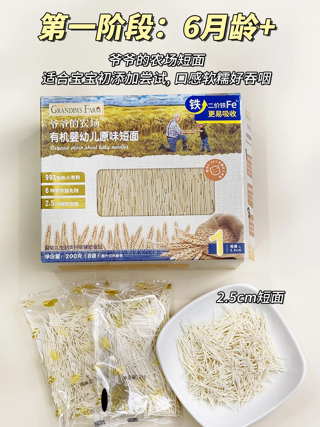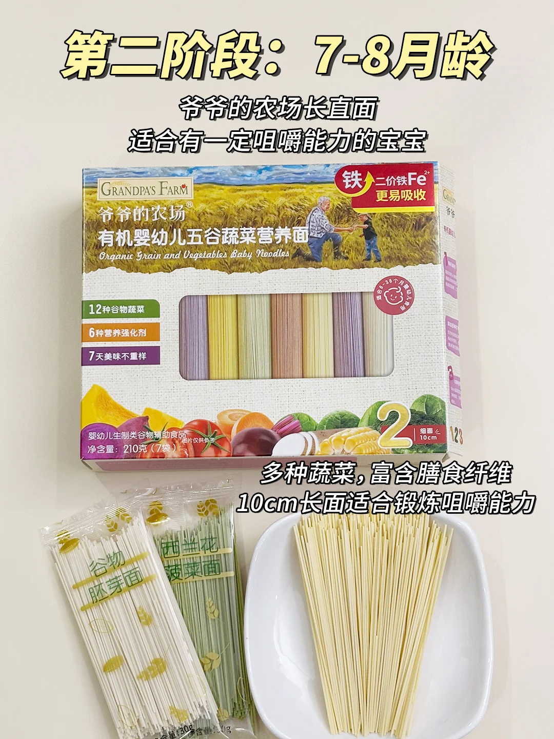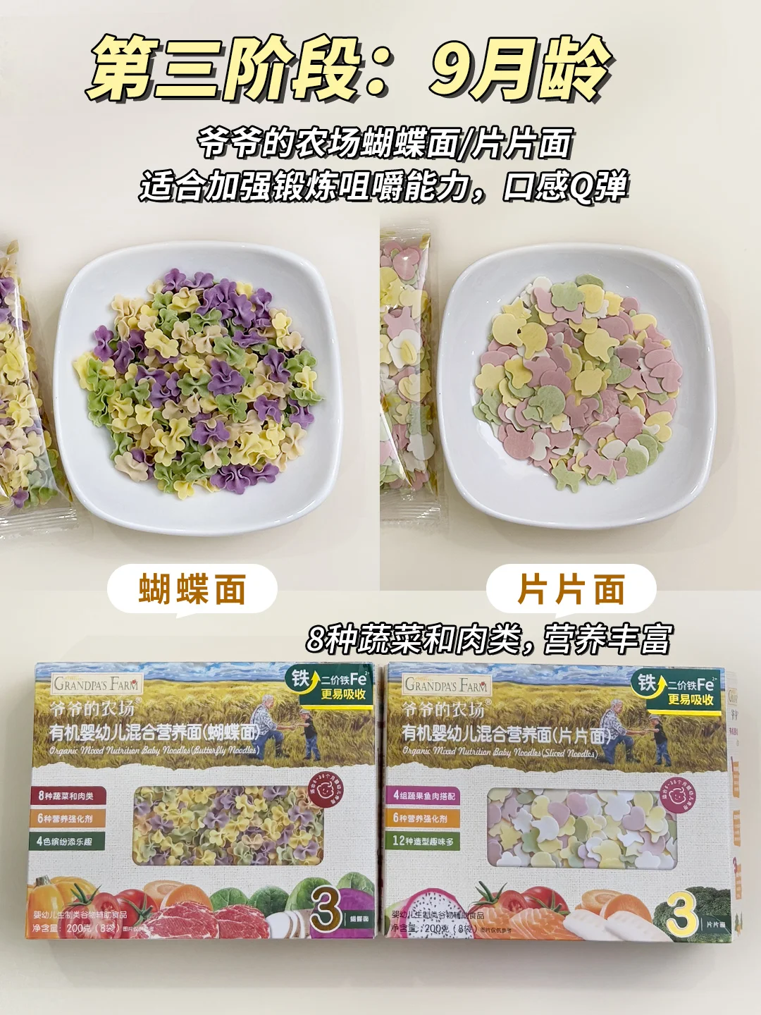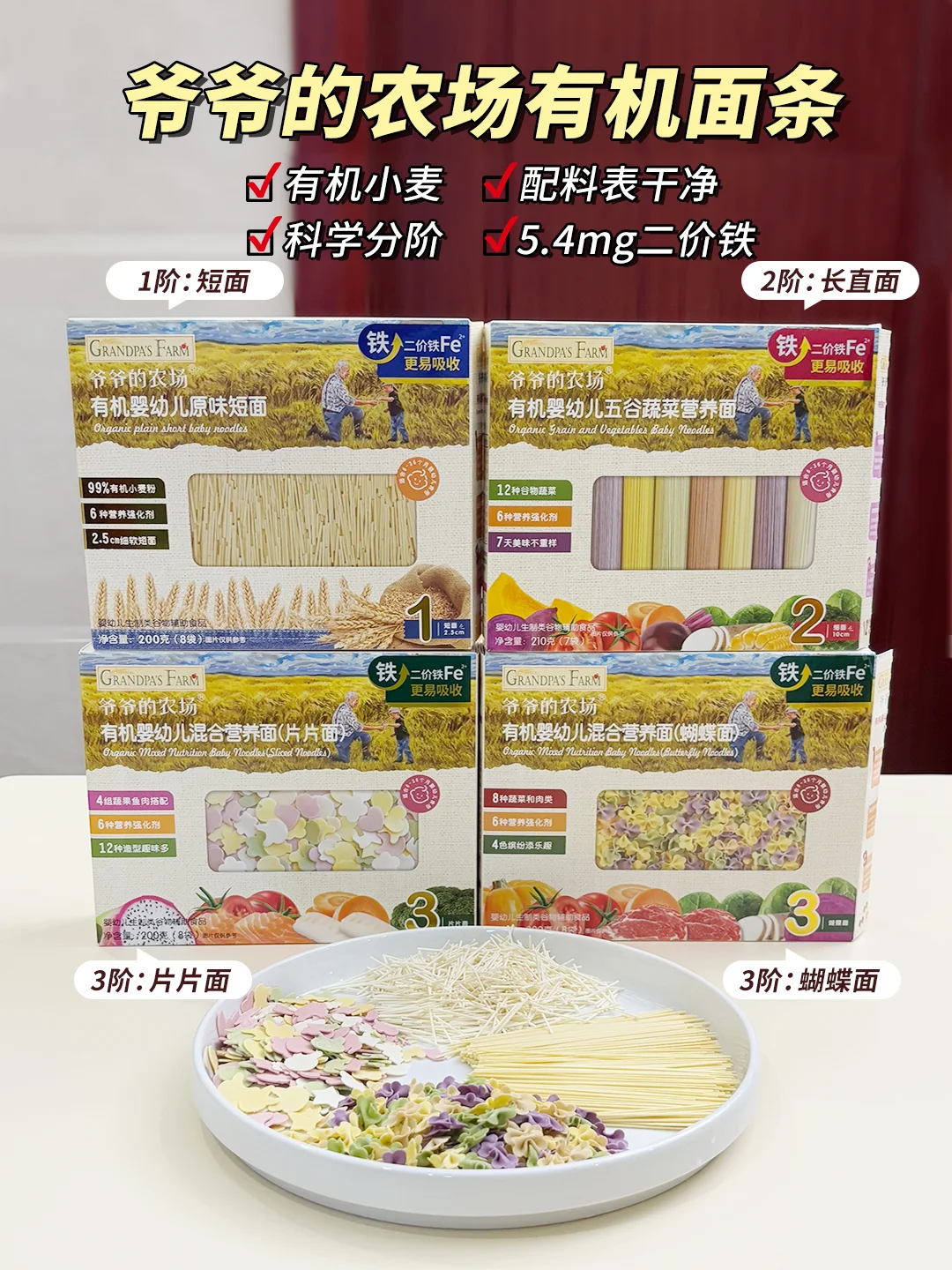 🔥不知道怎么选的新手妈妈,可以跟我一起试试爷爷的农场面条👀,他家面条是有机的,给宝宝吃很放心,营养也不错,含有5.4mg二价铁,配料表干净没有致敏物!而且还是根据不同月龄宝宝咀嚼营养需求,对应面条的不同性状同时强化钙铁锌,面条的形状也都不一样!