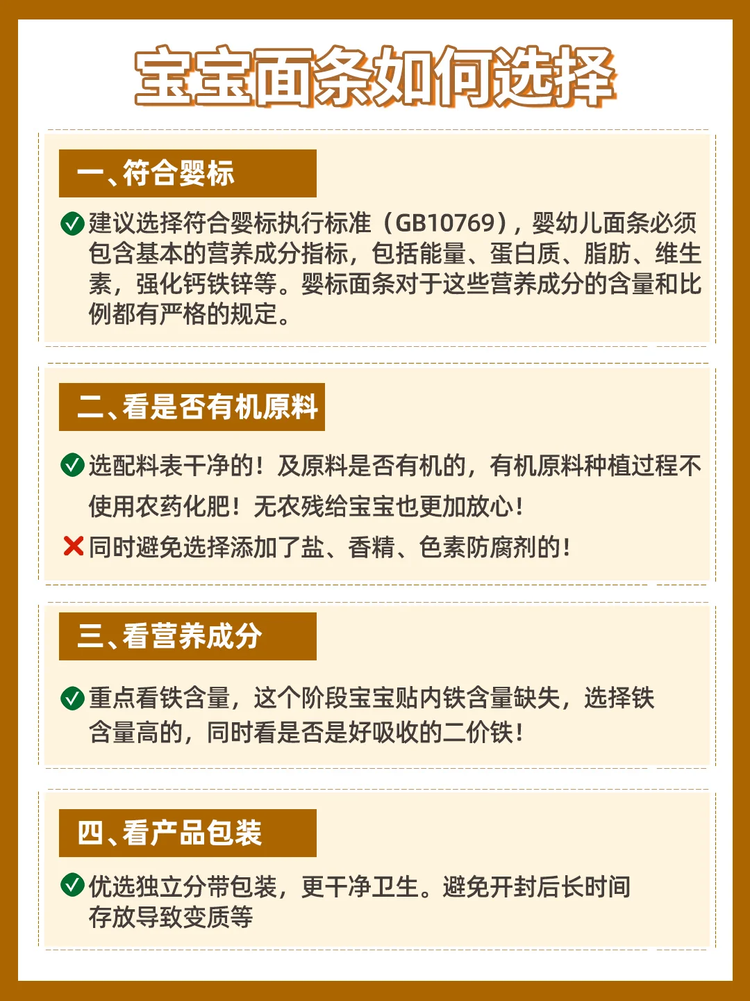👉建议选择符合婴标执行标准(GB10769),婴幼儿面条必须包含基本的营养成分指标,包括能量、蛋白质、脂肪、维生素A、维生素D、维生素B1、钙、铁、锌等。婴标面条对于这些营养成分的含量和比例都有严格的规定。