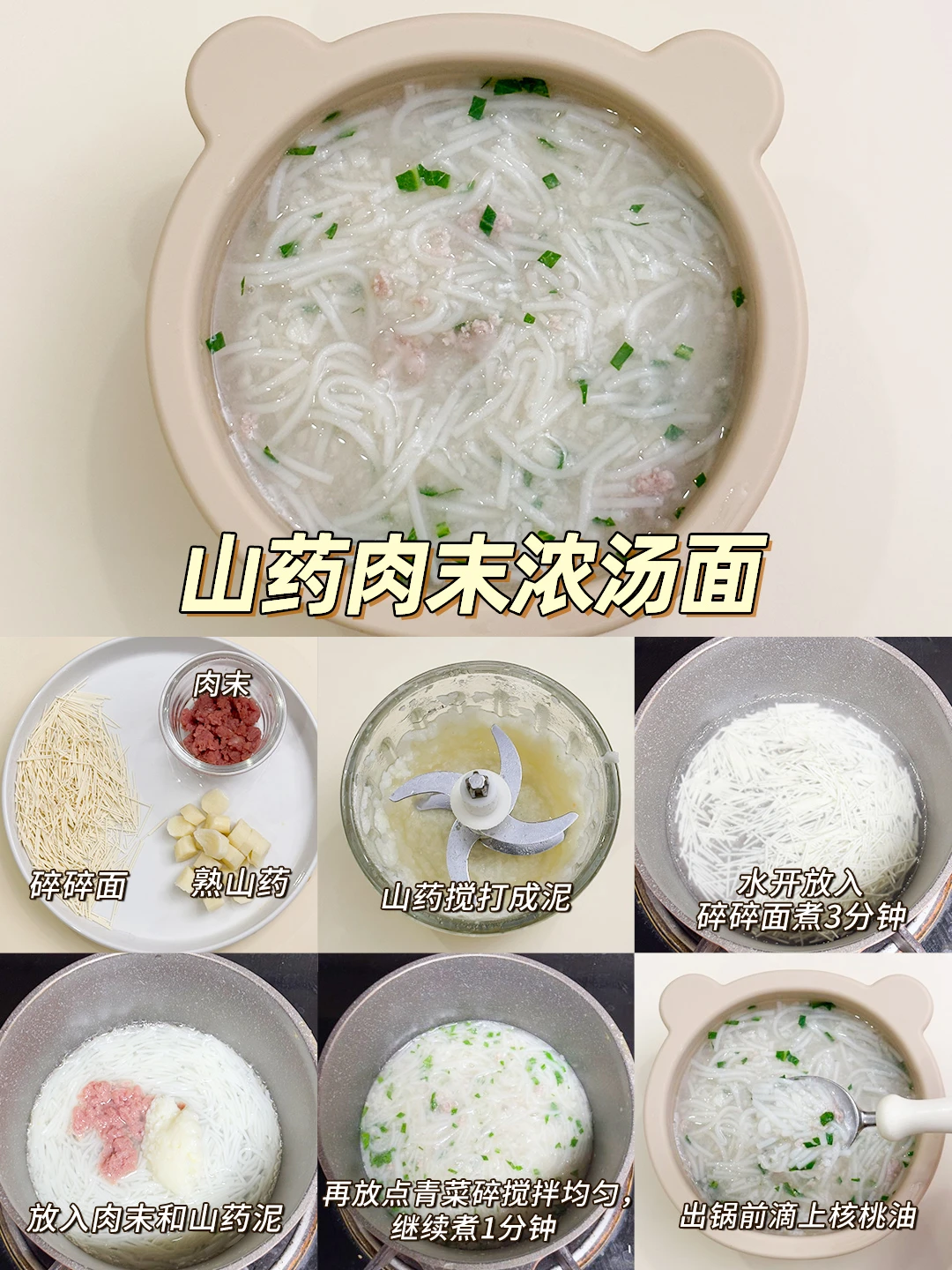 山药肉末浓汤面(山药、肉末、青菜碎、短面)