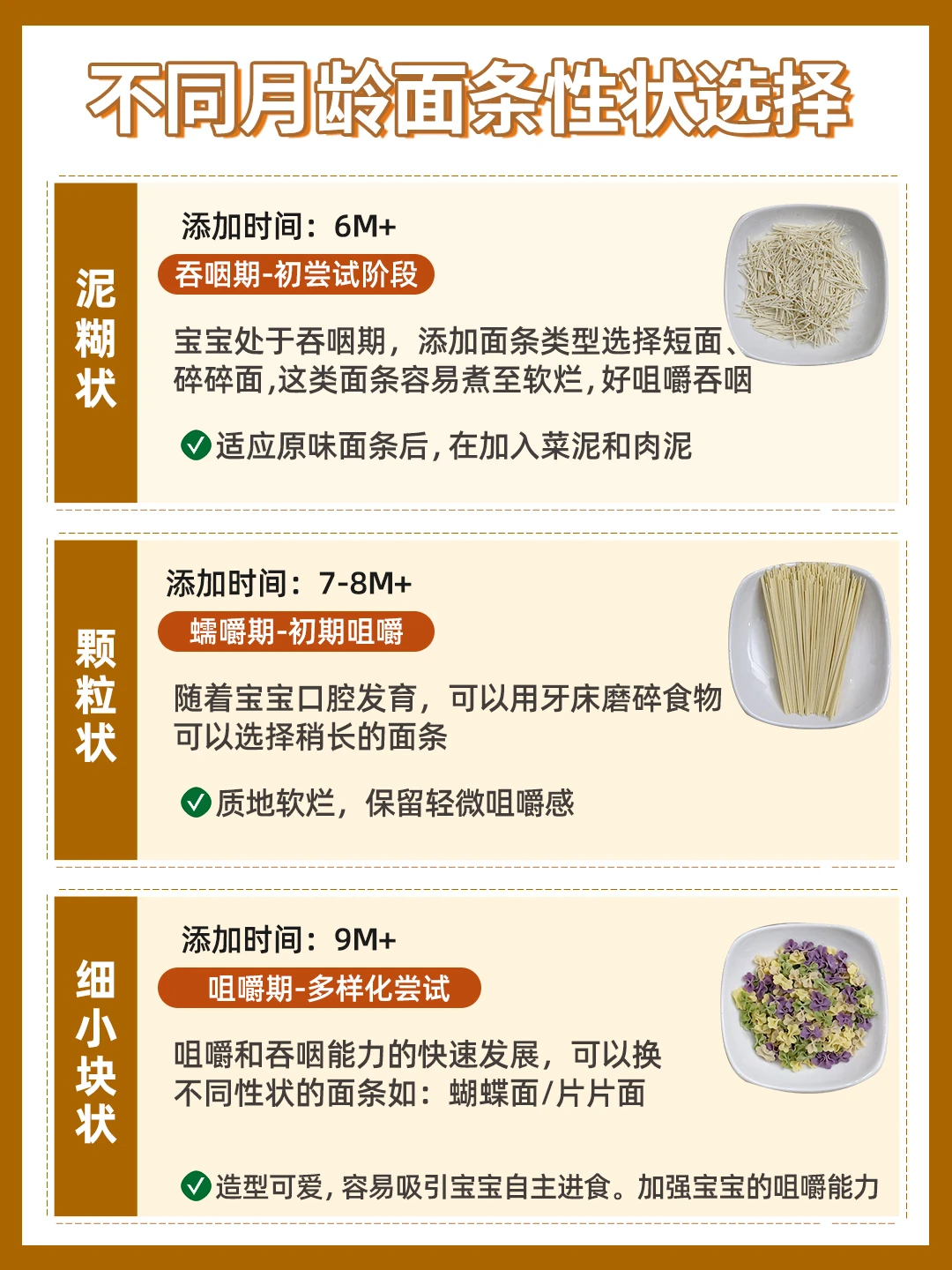 💗7-8月龄:2阶长直面,随着咀嚼能力的进步,可以用牙床磨碎食物,这时可以帮助锻炼咀嚼能力