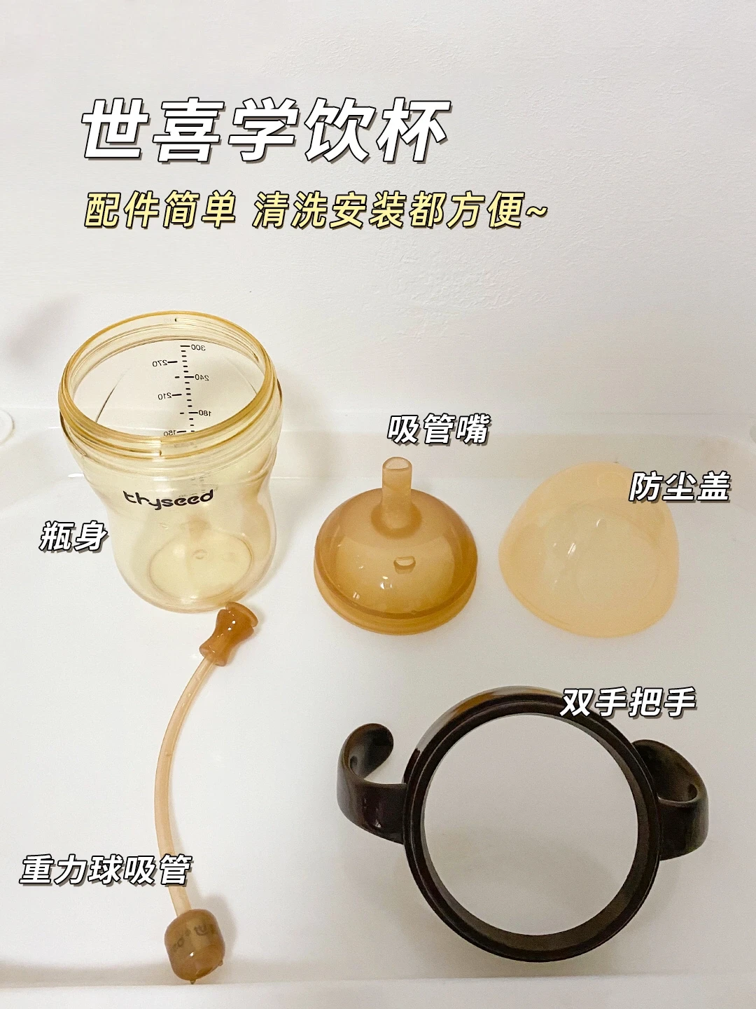 学饮杯是靠“吸”的动作来完成喝水,但宝宝还不能像大人一样控制自如地喝水,很容易被呛到😇。所以重点要选个防呛的。又考虑到鸭嘴杯用的时间比较短,最后入手了世喜家的学饮杯,它是V型吸嘴设计,内置硅胶薄片,出水平缓,有效防呛‼️而且宝宝在这个阶段还很喜欢扔东西,所以材质选择上也很重要!🔎优选PPUS耐高温耐摔,材质轻。世喜家这款学饮杯还有重力球设计,宝宝躺着也能喝到水~